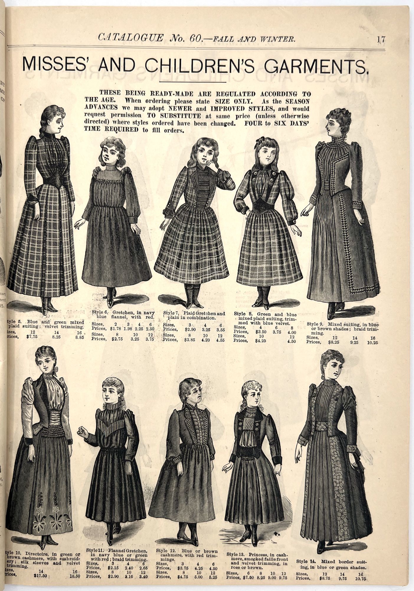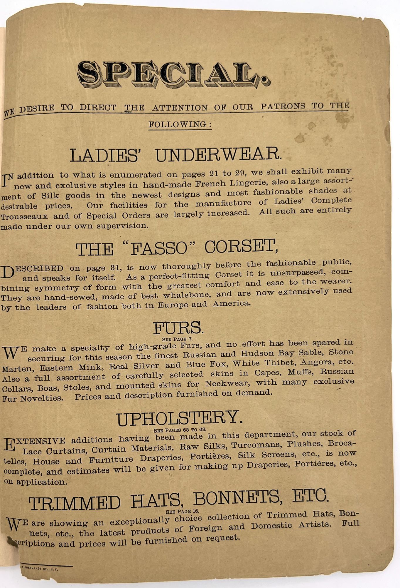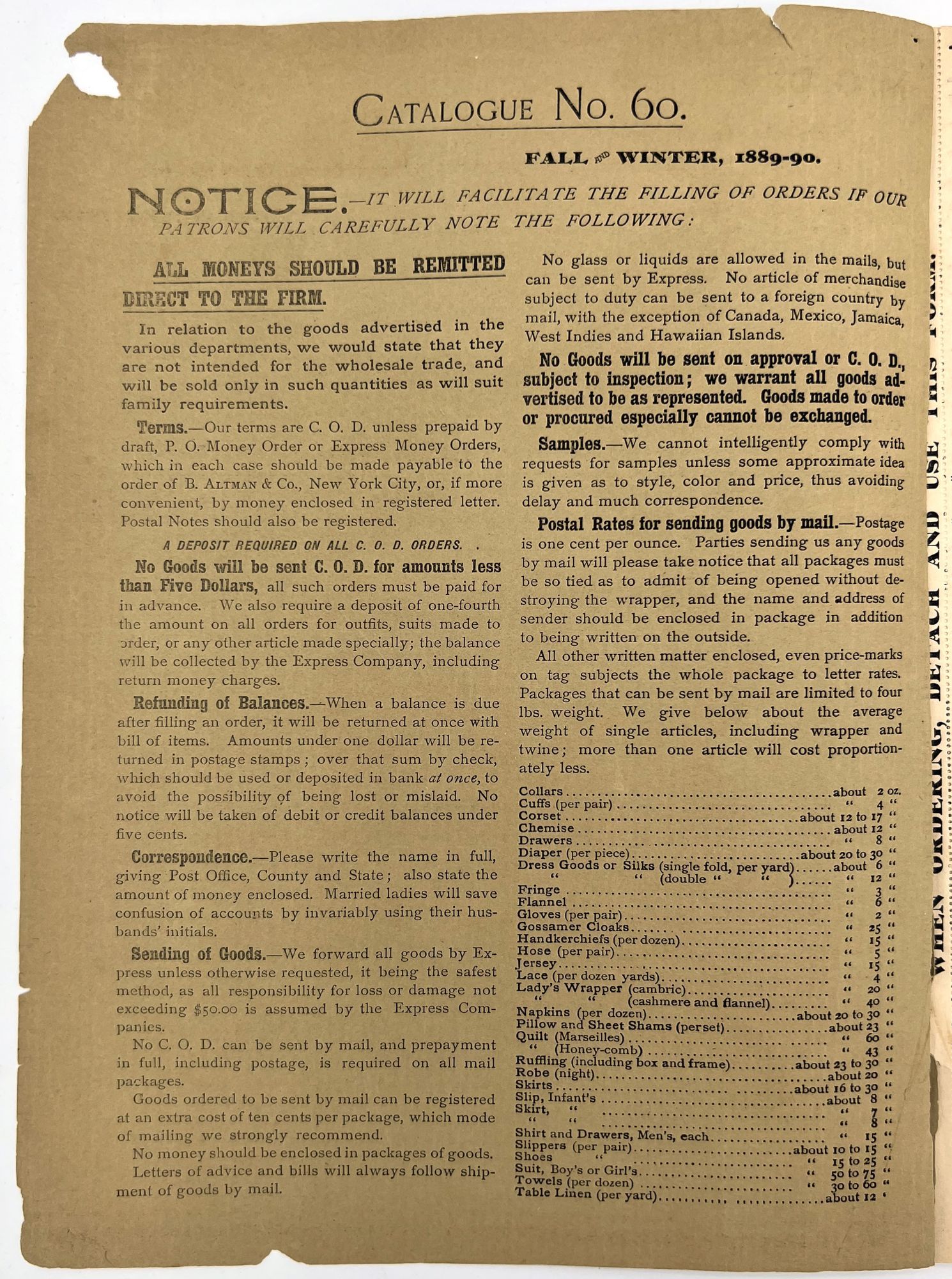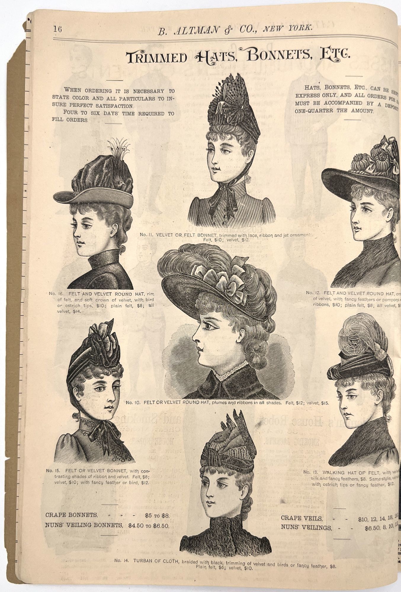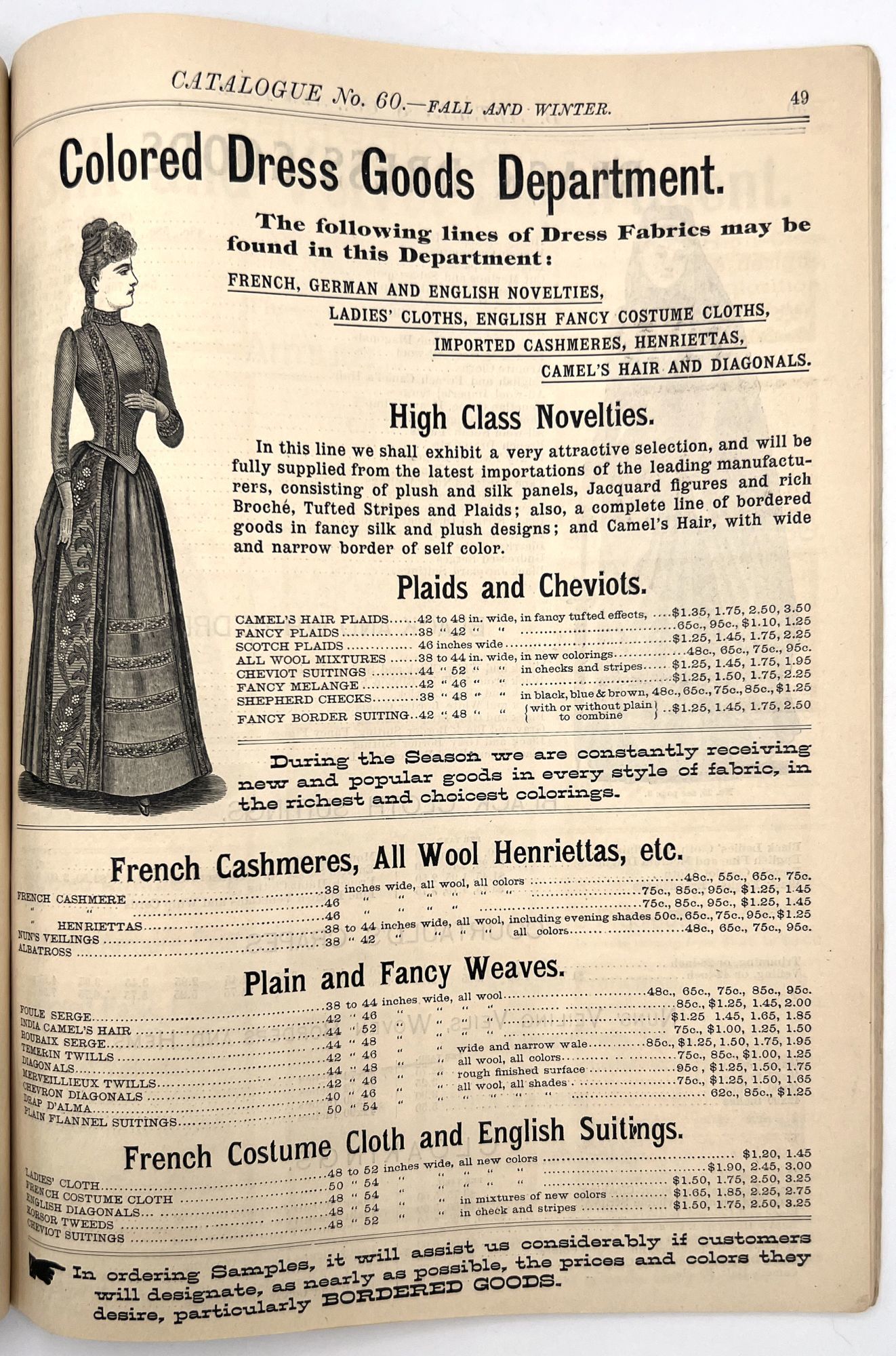 New York, New York: B. Attman & Co, 1889. Very good. Small open tear to upper right-hand corner of upper wrapper. Minor chipping, short tears, toning.. Printed catalogue advertising women's and children's clothing and accessories sold by the B. Attman & Co. of New York, profusely illustrated over its 96 pages. Includes a blank mail-in order form in the front and index, as well as a brief description of the latest trends ("Velvet Ribbons with satin back... In gloves, the various tans are still popular...", etc.). The clothes advertised are from the clothier's Fall/Winter 1889-1890 line of fashion. Each item is illustrated and priced with a style number for easy ordering. Also includes an "upholstery" section selling rugs, tapestries, towels, etc. There is a full page devoted to mourning jewelry, befitting the period.