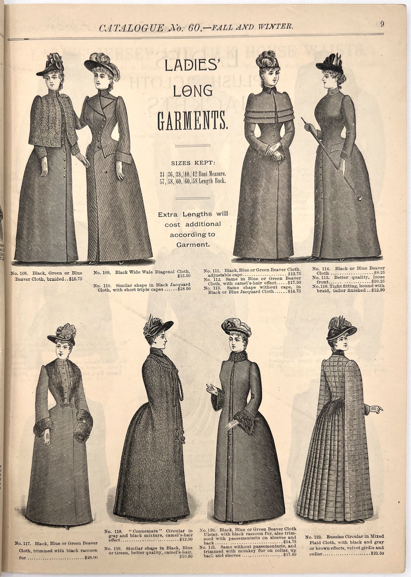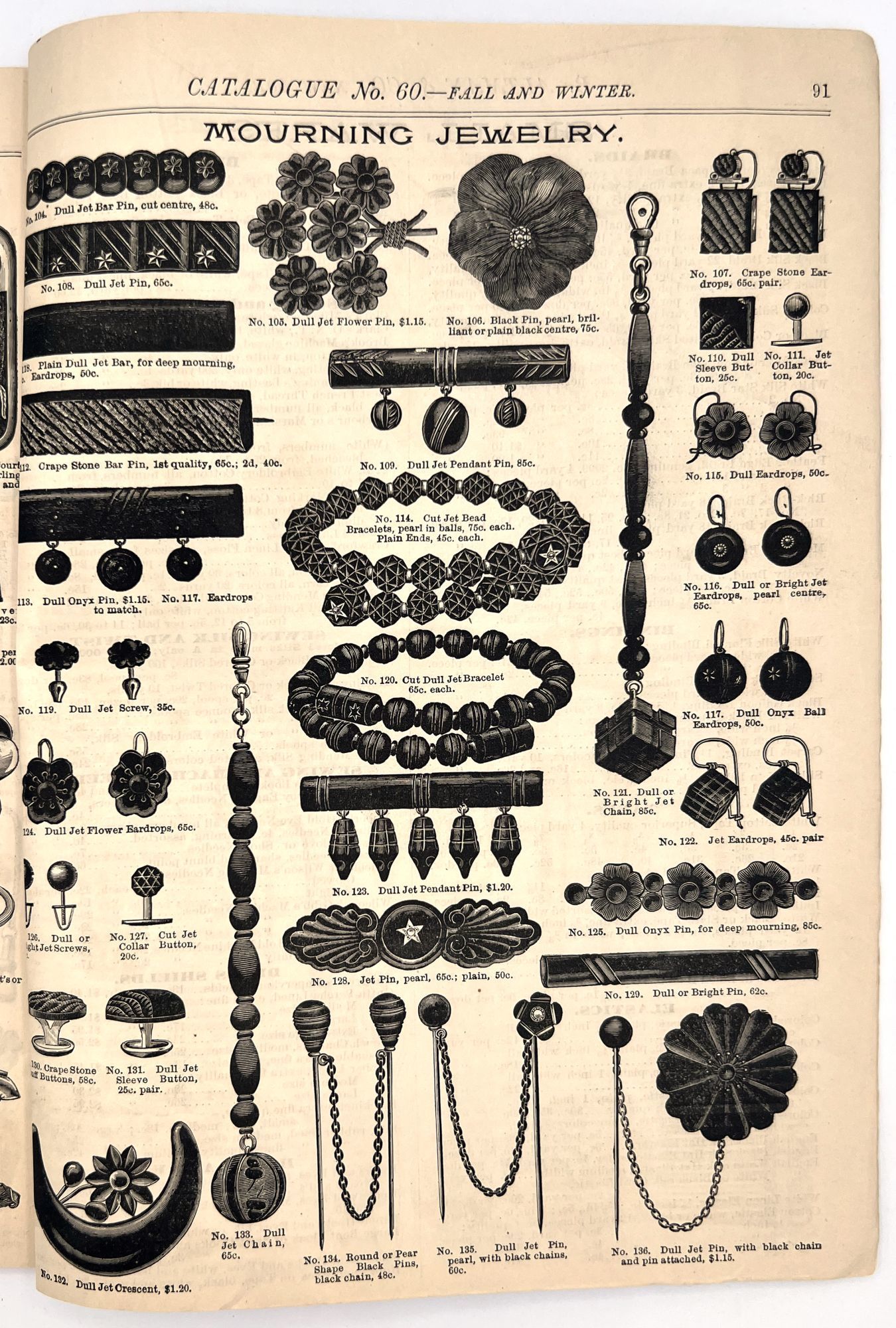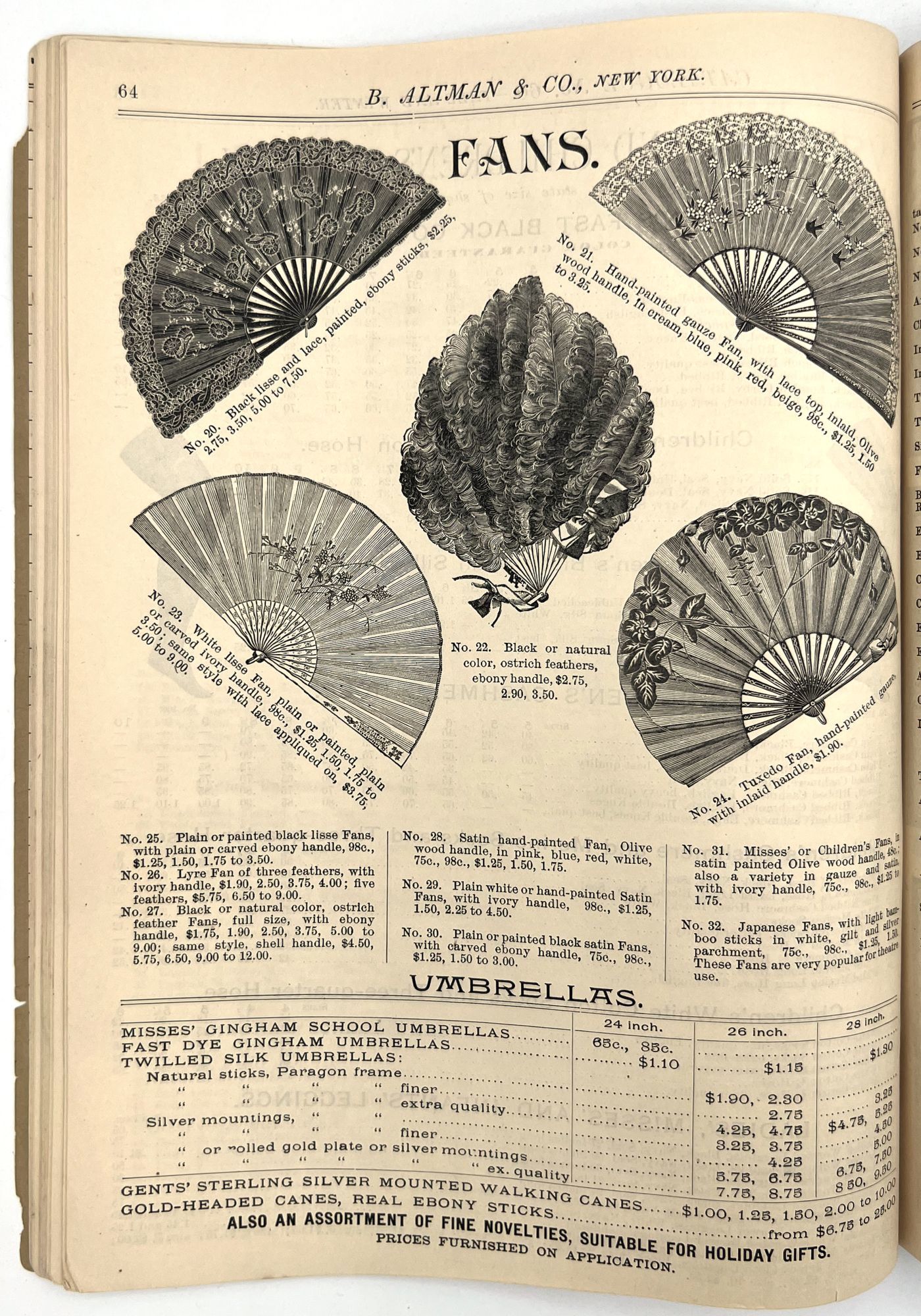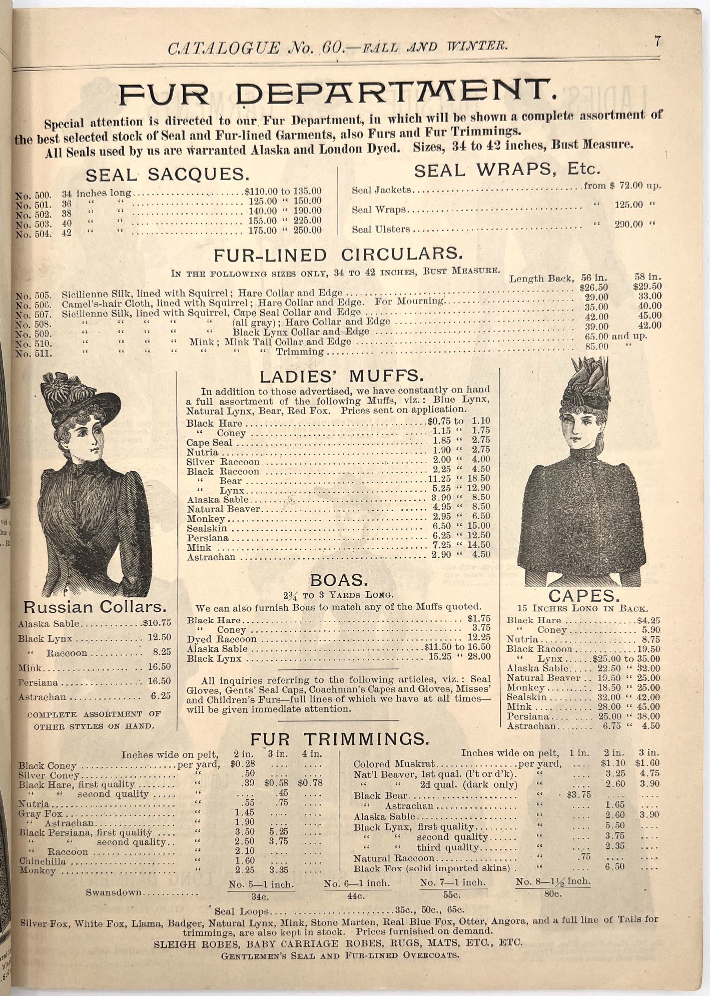 New York, New York: B. Attman & Co, 1889. Very good. Small open tear to upper right-hand corner of upper wrapper. Minor chipping, short tears, toning.. Printed catalogue advertising women's and children's clothing and accessories sold by the B. Attman & Co. of New York, profusely illustrated over its 96 pages. Includes a blank mail-in order form in the front and index, as well as a brief description of the latest trends ("Velvet Ribbons with satin back... In gloves, the various tans are still popular...", etc.). The clothes advertised are from the clothier's Fall/Winter 1889-1890 line of fashion. Each item is illustrated and priced with a style number for easy ordering. Also includes an "upholstery" section selling rugs, tapestries, towels, etc. There is a full page devoted to mourning jewelry, befitting the period.