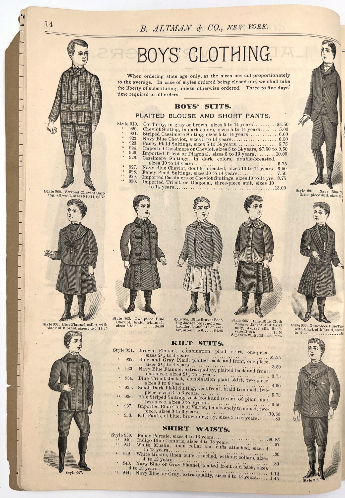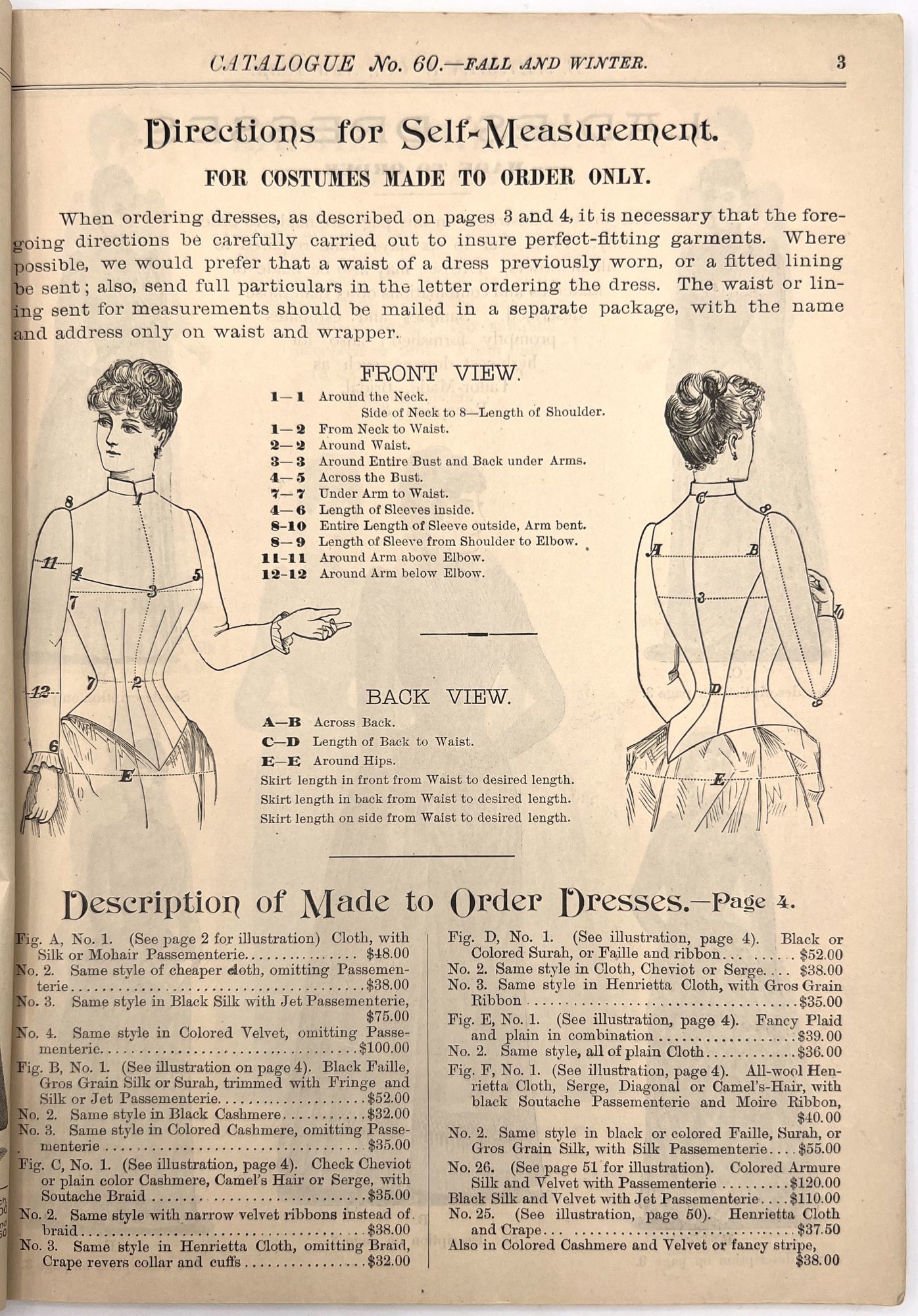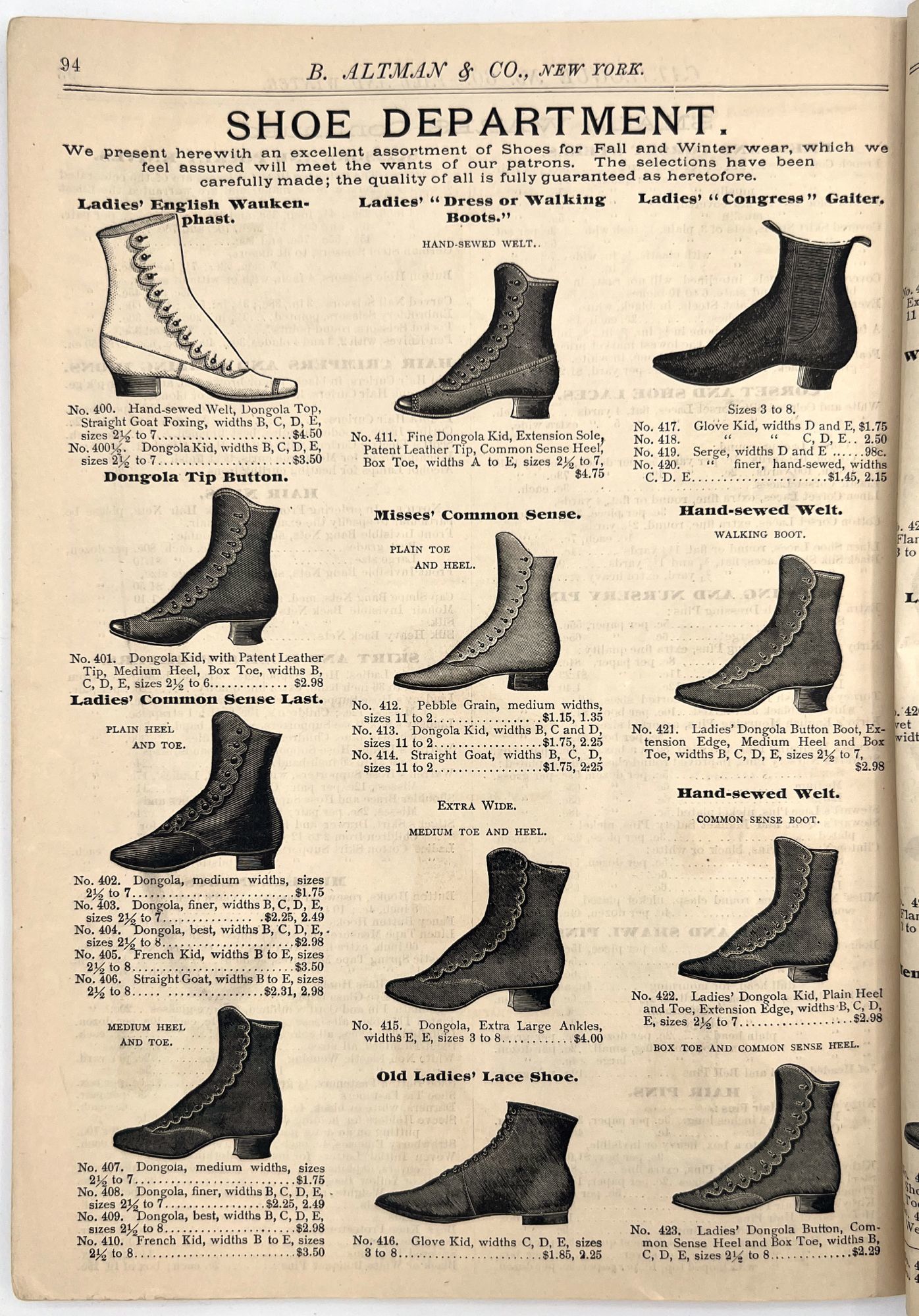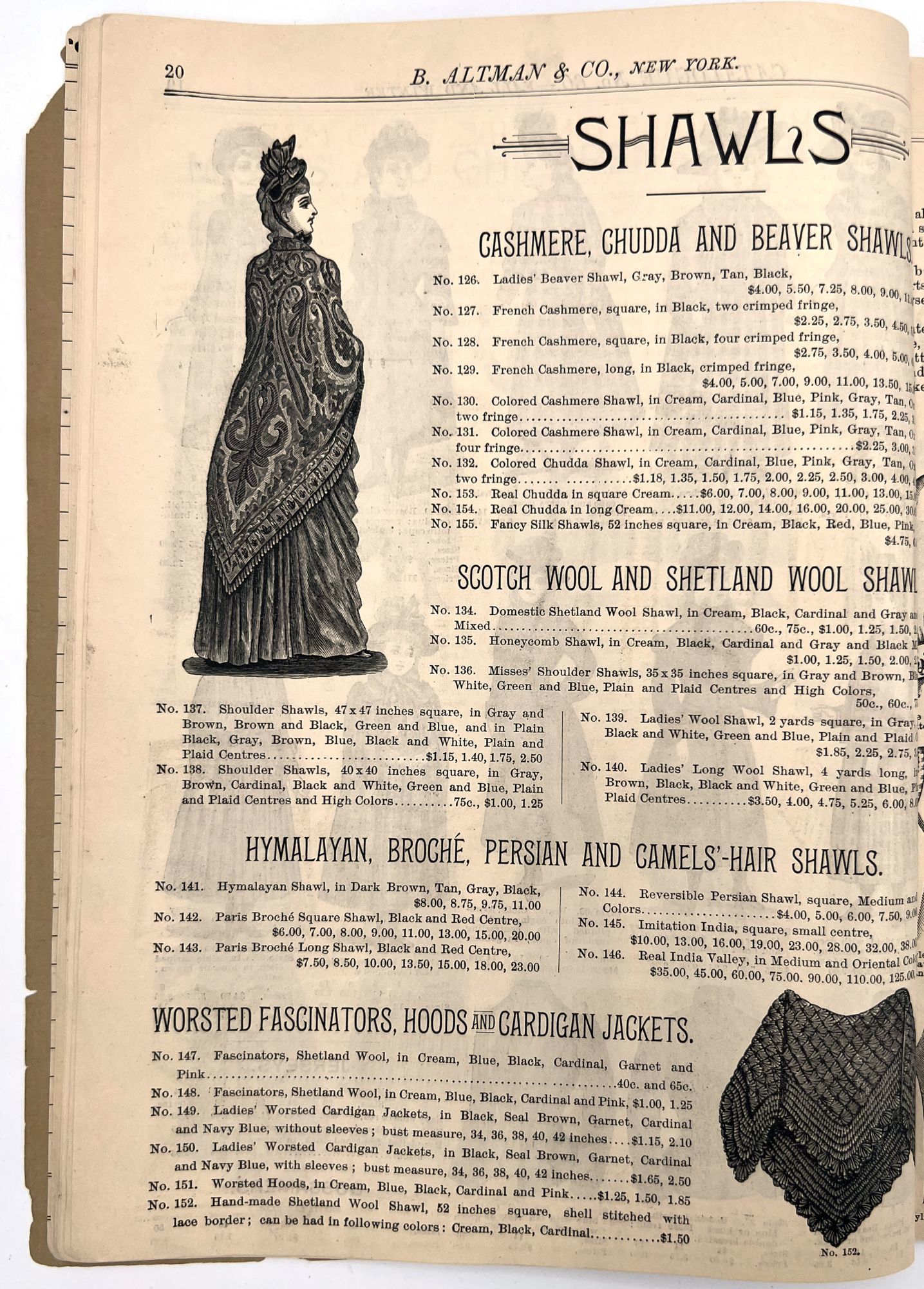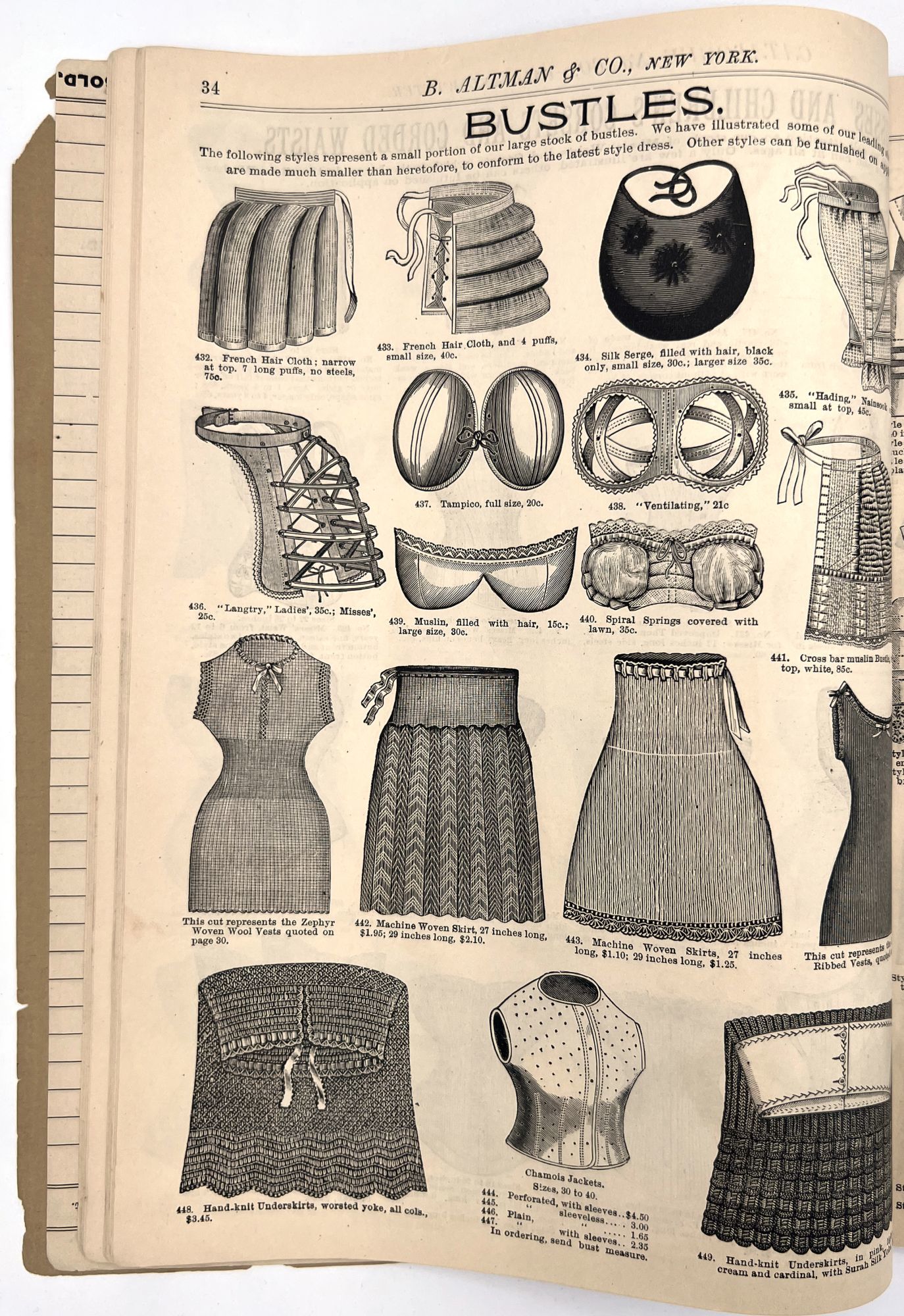 New York, New York: B. Attman & Co, 1889. Very good. Small open tear to upper right-hand corner of upper wrapper. Minor chipping, short tears, toning.. Printed catalogue advertising women's and children's clothing and accessories sold by the B. Attman & Co. of New York, profusely illustrated over its 96 pages. Includes a blank mail-in order form in the front and index, as well as a brief description of the latest trends ("Velvet Ribbons with satin back... In gloves, the various tans are still popular...", etc.). The clothes advertised are from the clothier's Fall/Winter 1889-1890 line of fashion. Each item is illustrated and priced with a style number for easy ordering. Also includes an "upholstery" section selling rugs, tapestries, towels, etc. There is a full page devoted to mourning jewelry, befitting the period.