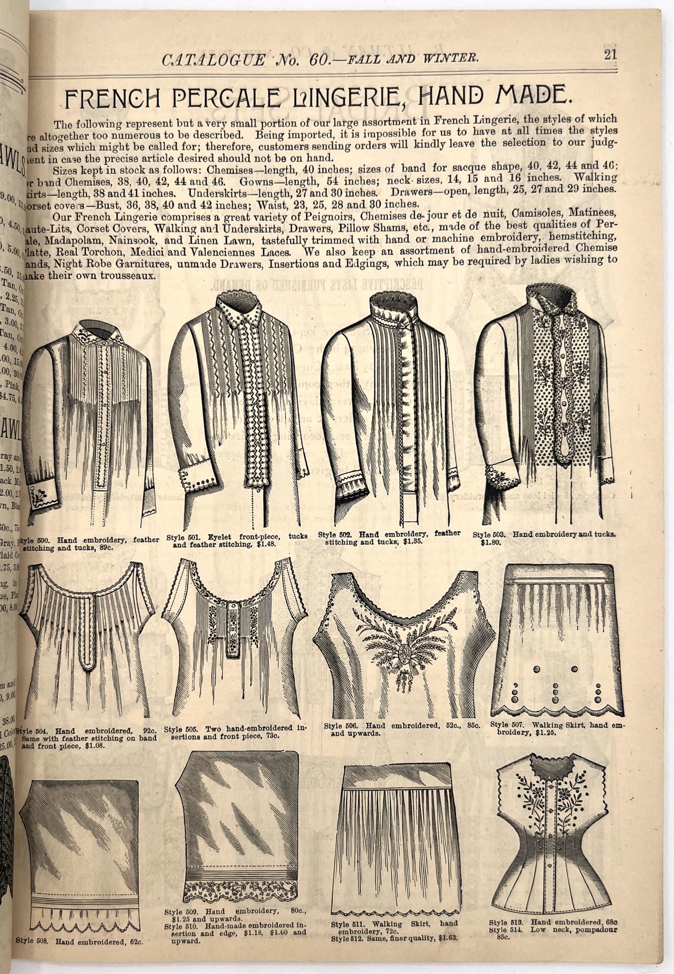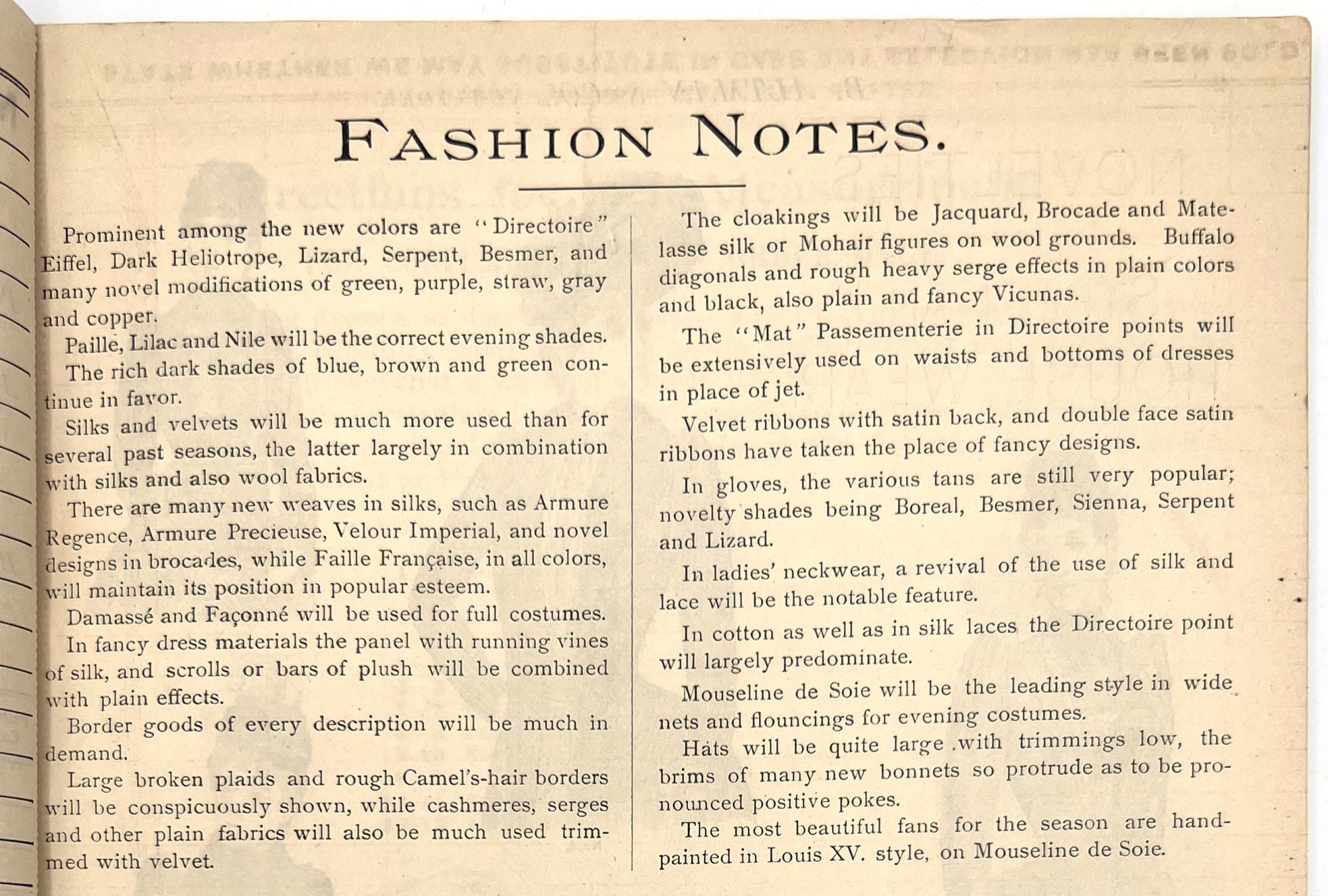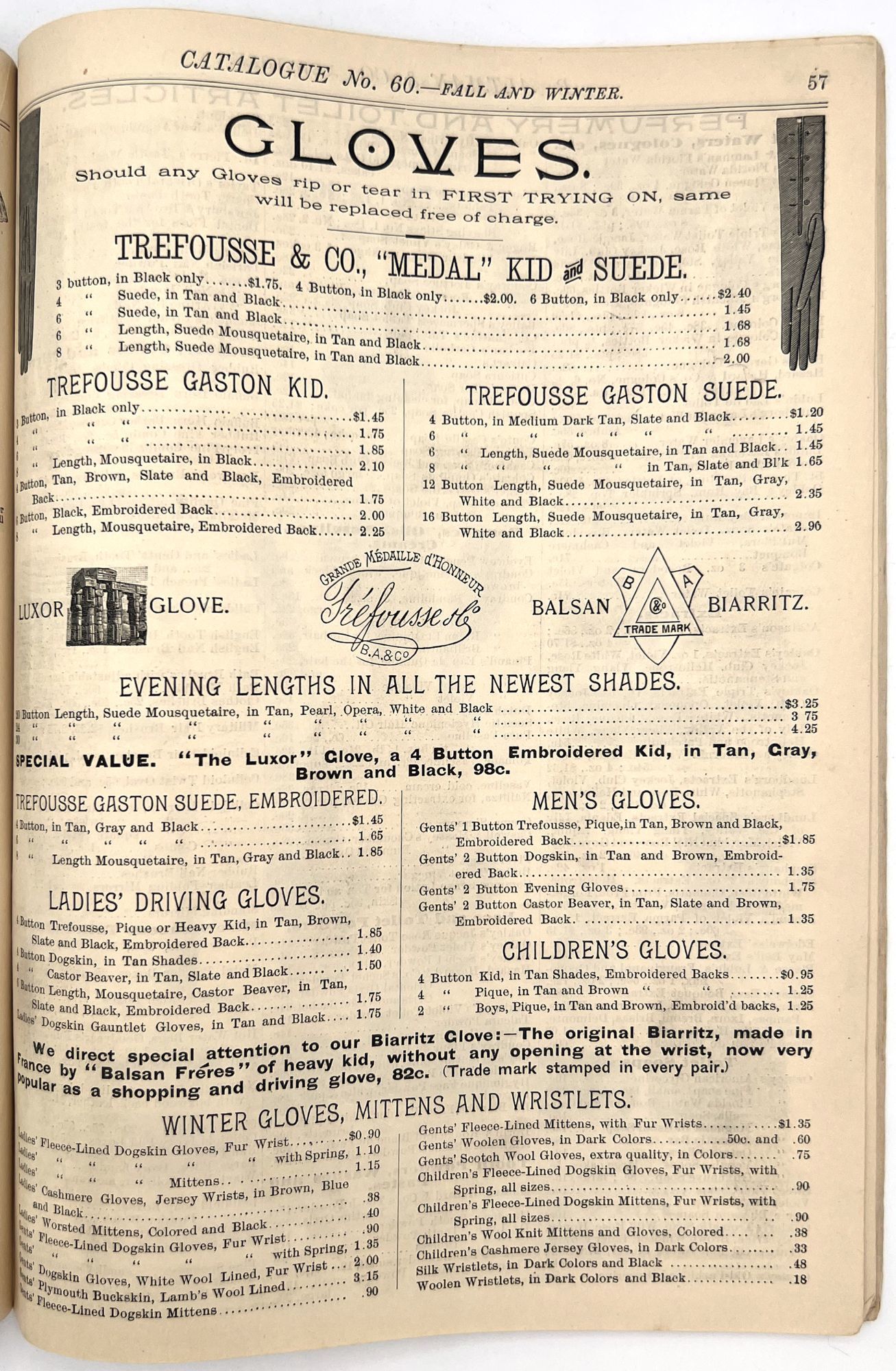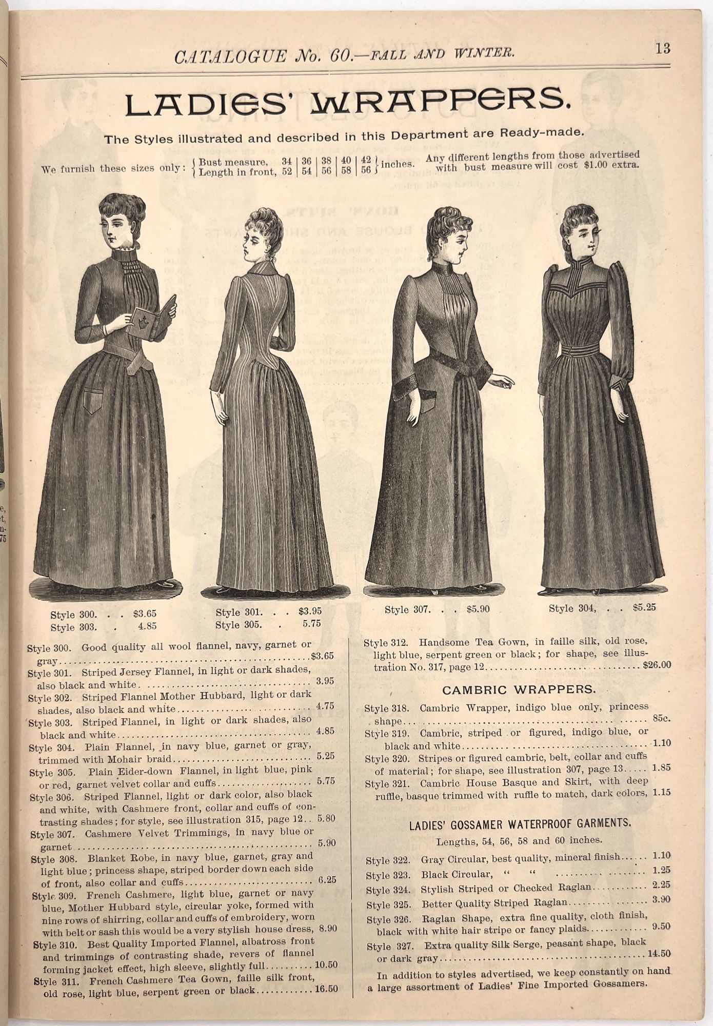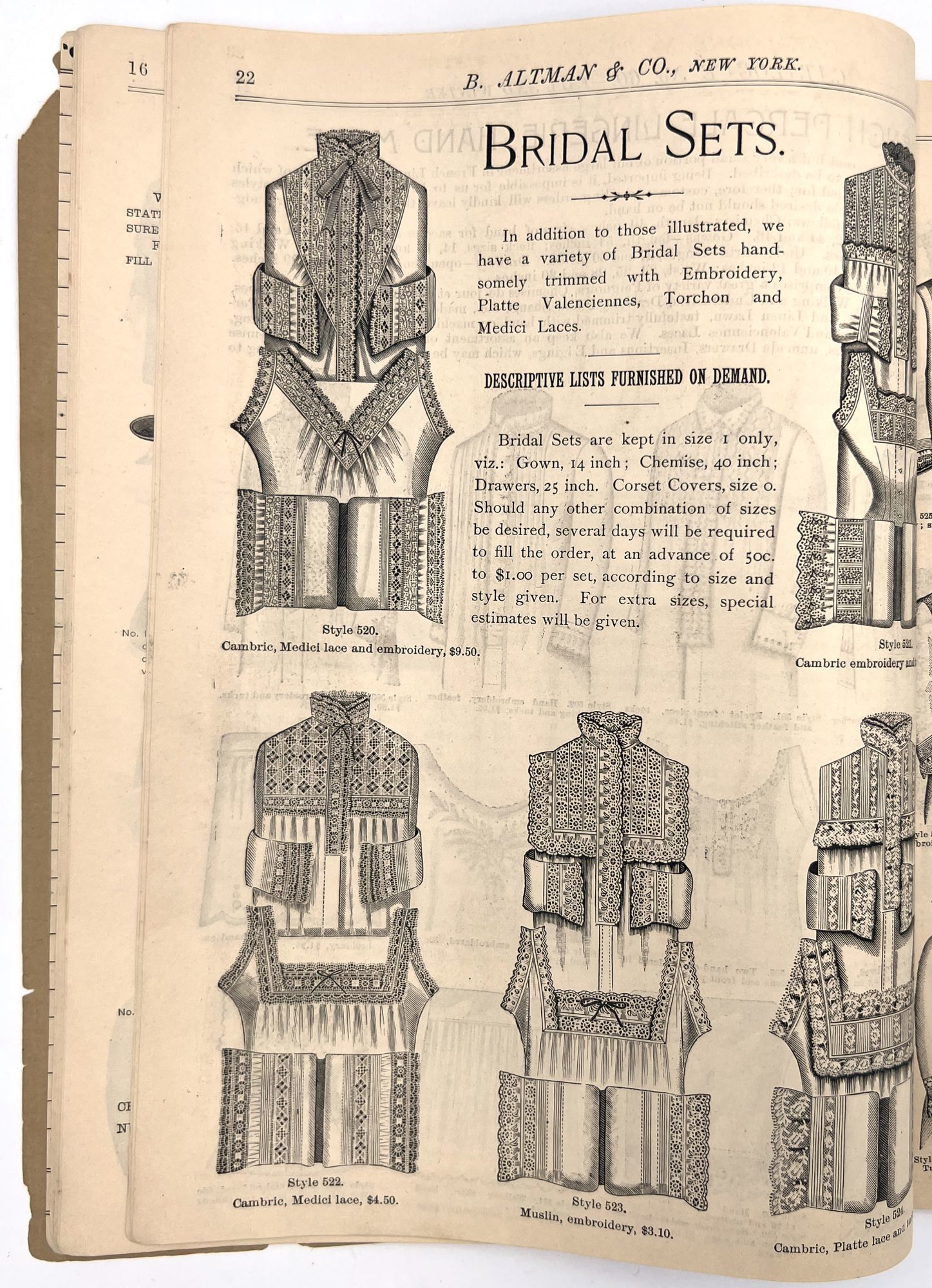 New York, New York: B. Attman & Co, 1889. Very good. Small open tear to upper right-hand corner of upper wrapper. Minor chipping, short tears, toning.. Printed catalogue advertising women's and children's clothing and accessories sold by the B. Attman & Co. of New York, profusely illustrated over its 96 pages. Includes a blank mail-in order form in the front and index, as well as a brief description of the latest trends ("Velvet Ribbons with satin back... In gloves, the various tans are still popular...", etc.). The clothes advertised are from the clothier's Fall/Winter 1889-1890 line of fashion. Each item is illustrated and priced with a style number for easy ordering. Also includes an "upholstery" section selling rugs, tapestries, towels, etc. There is a full page devoted to mourning jewelry, befitting the period.