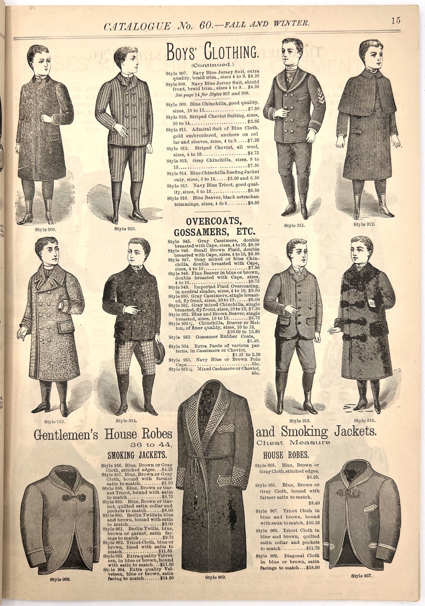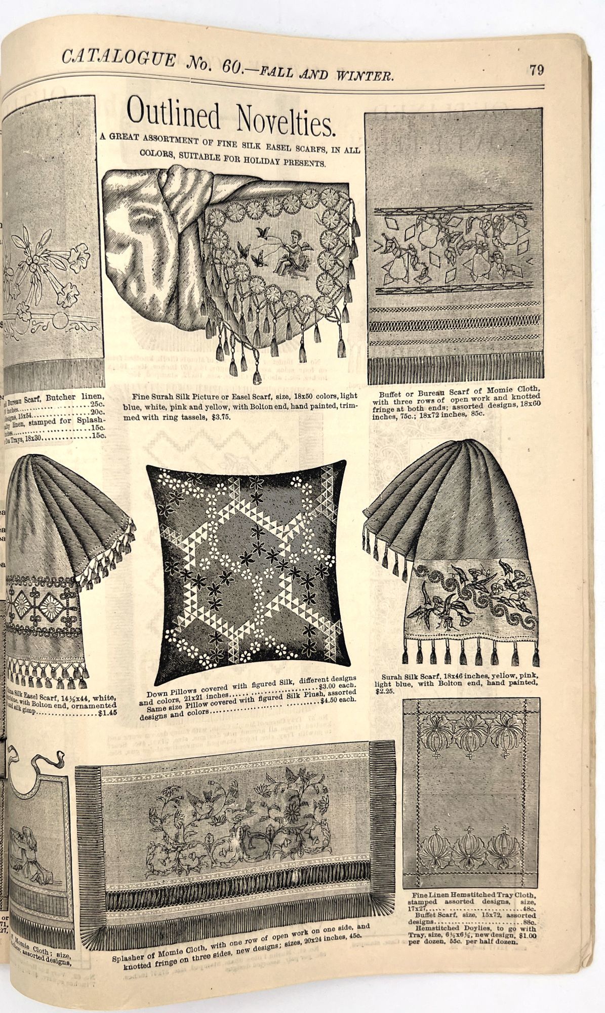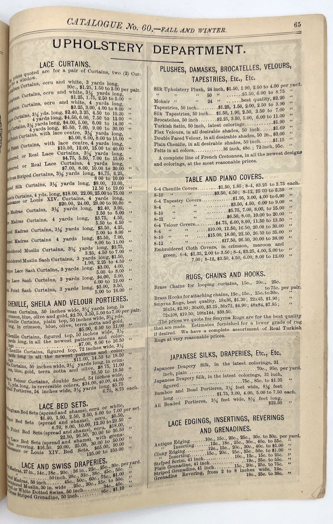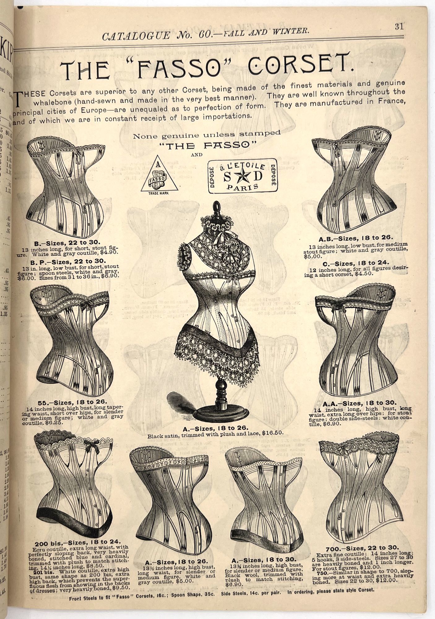 New York, New York: B. Attman & Co, 1889. Very good. Small open tear to upper right-hand corner of upper wrapper. Minor chipping, short tears, toning.. Printed catalogue advertising women's and children's clothing and accessories sold by the B. Attman & Co. of New York, profusely illustrated over its 96 pages. Includes a blank mail-in order form in the front and index, as well as a brief description of the latest trends ("Velvet Ribbons with satin back... In gloves, the various tans are still popular...", etc.). The clothes advertised are from the clothier's Fall/Winter 1889-1890 line of fashion. Each item is illustrated and priced with a style number for easy ordering. Also includes an "upholstery" section selling rugs, tapestries, towels, etc. There is a full page devoted to mourning jewelry, befitting the period.