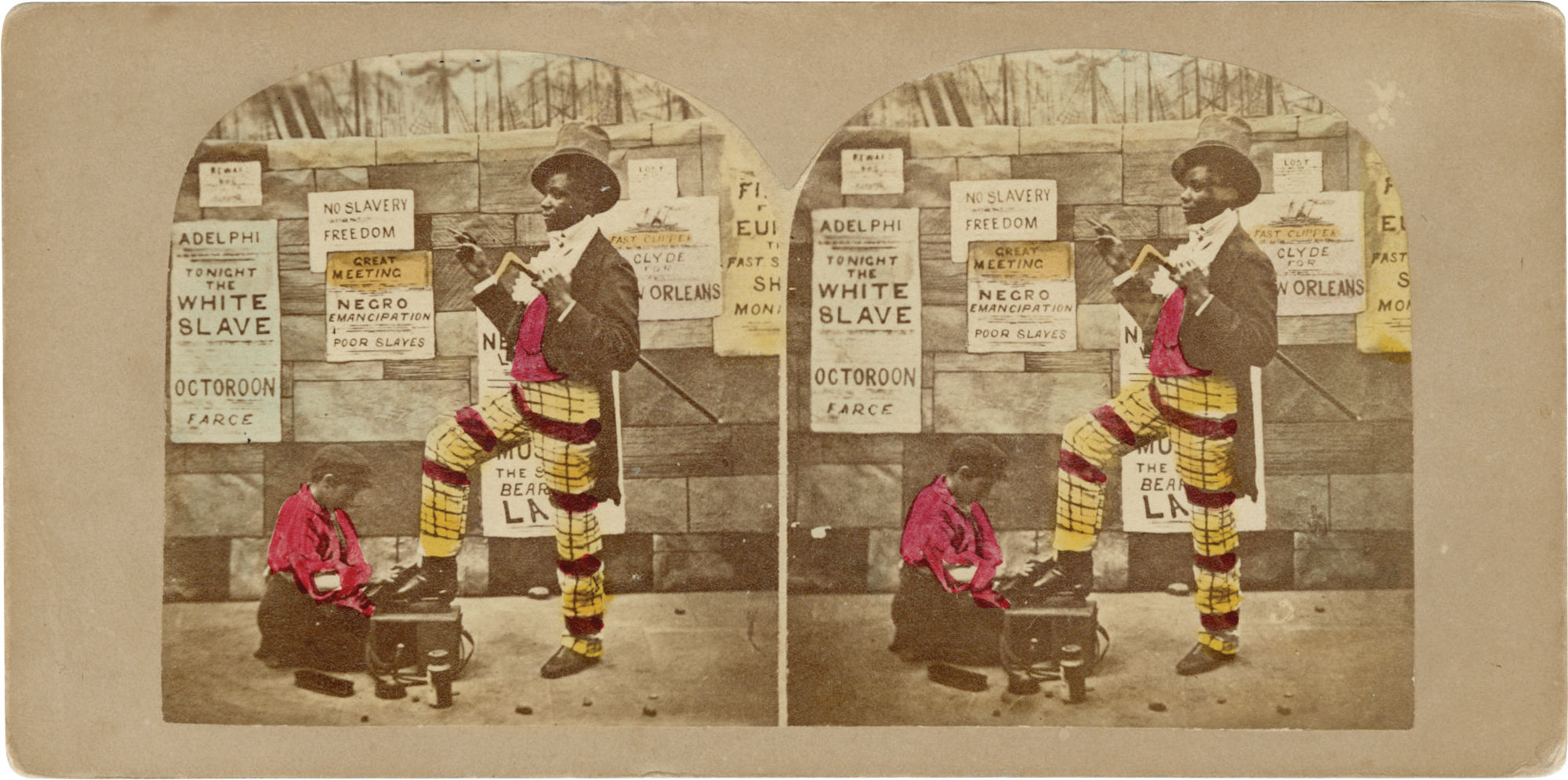 N.p.: N.p., 1880. Vintage hand tinted stereoview albumen print, showing a Black dandy having his shoes shined by a young white boy, circa 1880. Printed label on verso notes title ("The White Slave") and catalog No. 4518.