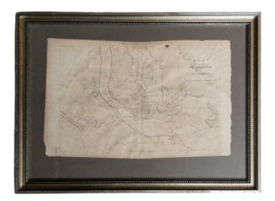 Philadelphia: C.P. Wayne, 1807. A revolutionary war battle map of Charleston, South Carolina from the Atlas to Marshall's Life of Washington. It was created by James Yeager. The map is in Good plus condition with mild age toning, mild foxing, and several small black stains. The map is in a metal frame and mounted to a gray background and has not been examined out of frame. The map measures 14.25" x 9.5", the atlas page measures 16.75" x 10.75", and the frame measures 21.5" x 16". AT Consignment. Shelved Rockville PS. 1375247. Special Collections.