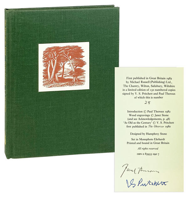 Salisbury, Wiltshire: Michael Russell, 1982. Near Fine/Very Good+. [Salisbury, Wiltshire]: Michael Russell, [1982]. First Edition Limited to 150 signed copies of which this is no. 28. Slim 12mo; publisher's green cloth, pictorial paste-on to upper cover, in original glassine dust jacket; 48pp.; woodcut frontispiece, illus. throughout. A hint of shelf wear, glassine a bit wrinkled, else a Fine example. Signed by Pritchett and Theroux on limitation page.