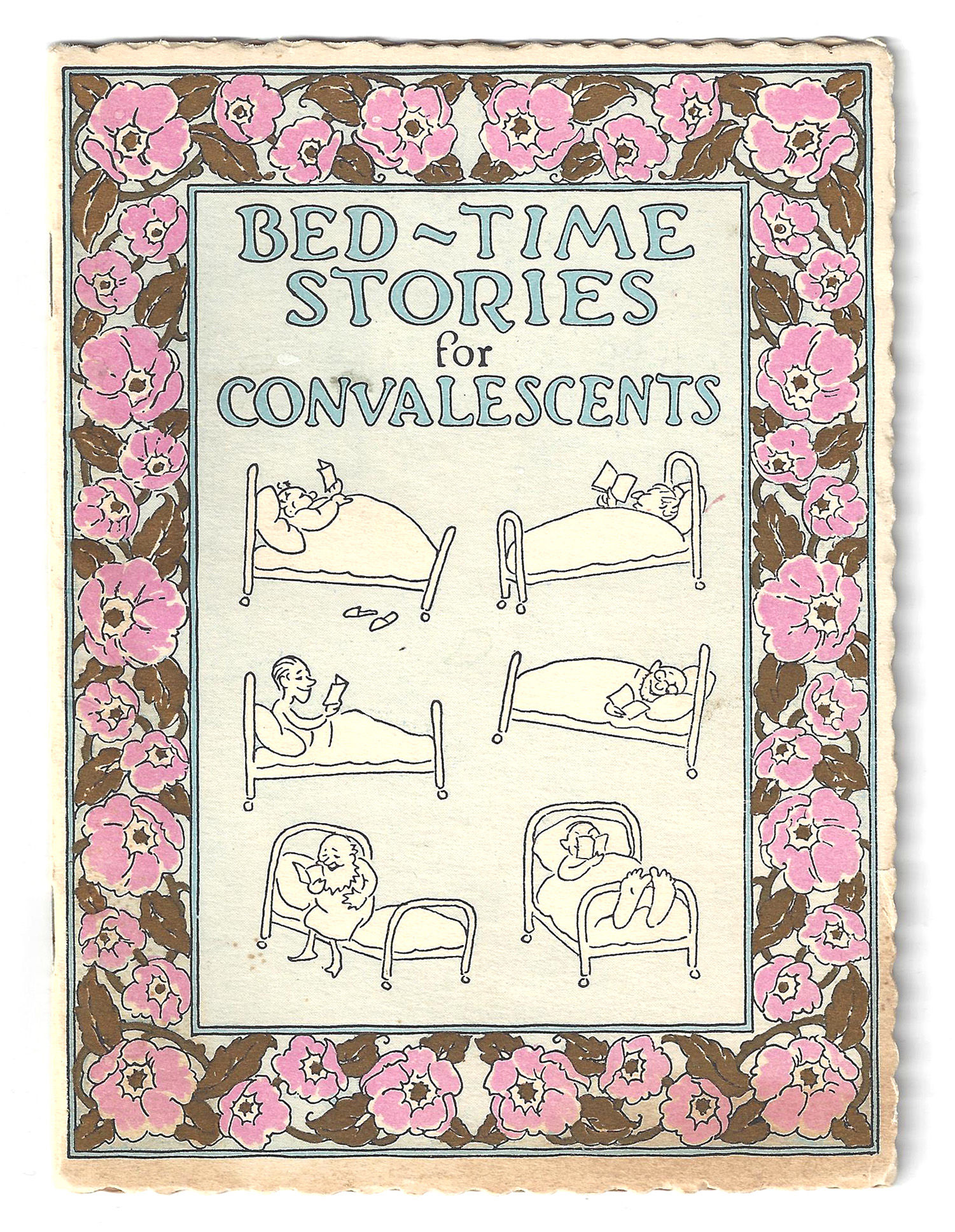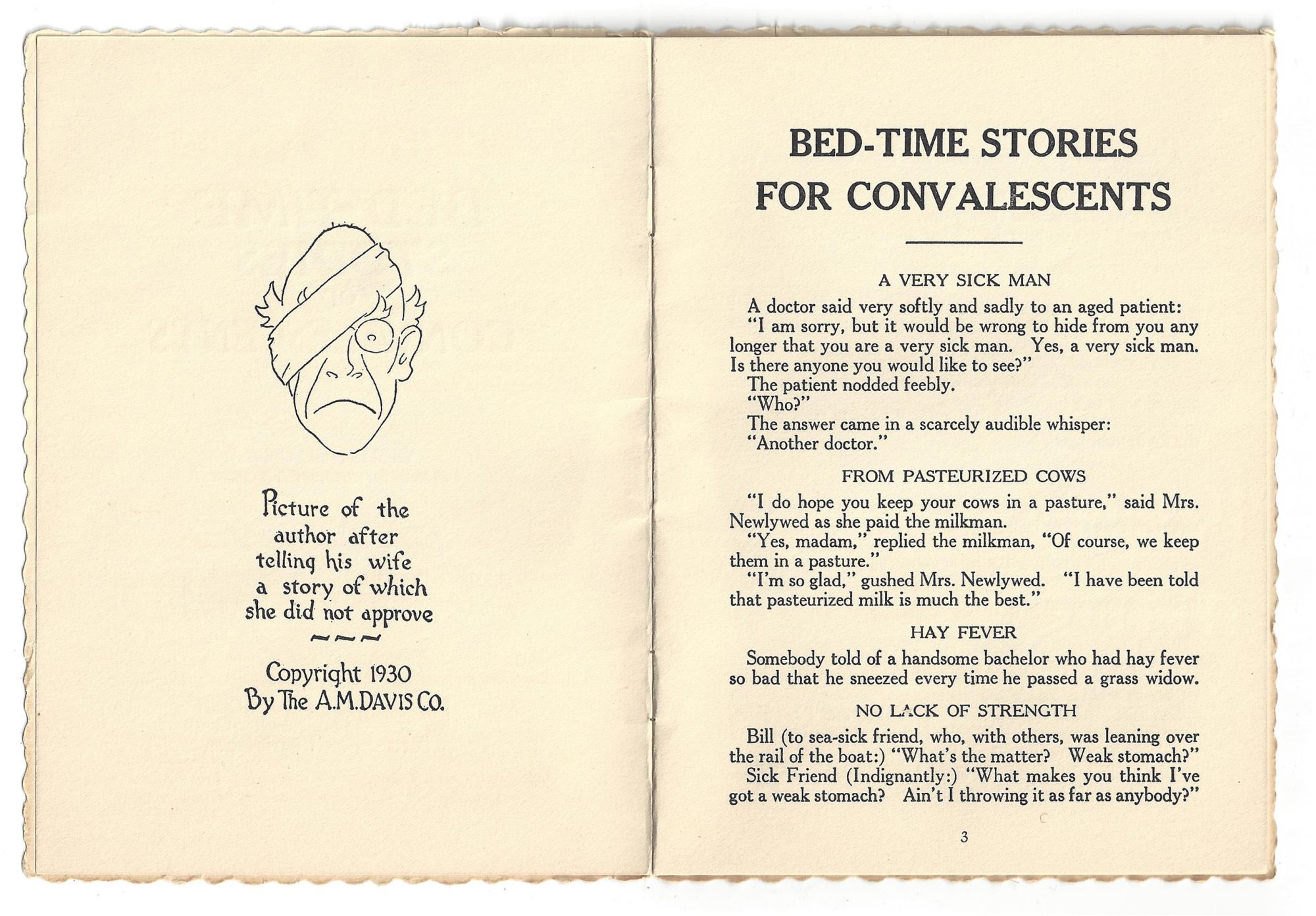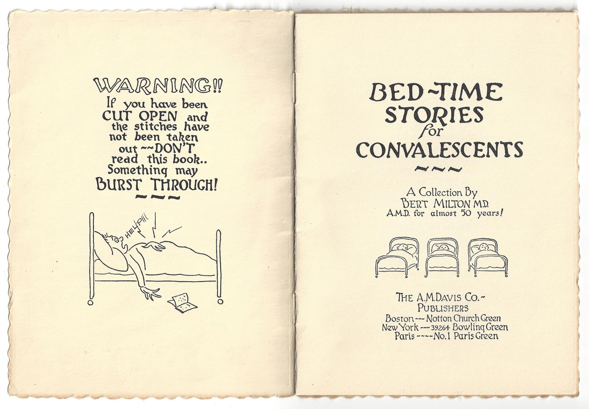 Boston, New York, and Paris: The A.M. Davis Co, 1930. Fine; some light toning.. Scarce edition of a charming and lighthearted book by a doctor, consisting of sixteen pages of humorous short stories, jokes, or scenarios. To set the tone, it begins with a caution to its reader: "Warning!! If you have been CUT OPEN and the stitches have not been taken out, DON'T read this book... Something may BURST THROUGH!" (upper wrapper verso). This copy has been personalized; in the rear, two illustrations of patients reading in bed have been labeled "Jen" and "Dewey" in contemporary ink. Small 4to (6" by 4.5"), pp. 16, stapled in original chromolithographed wrappers. This edition not in OCLC (Feb. 2022).