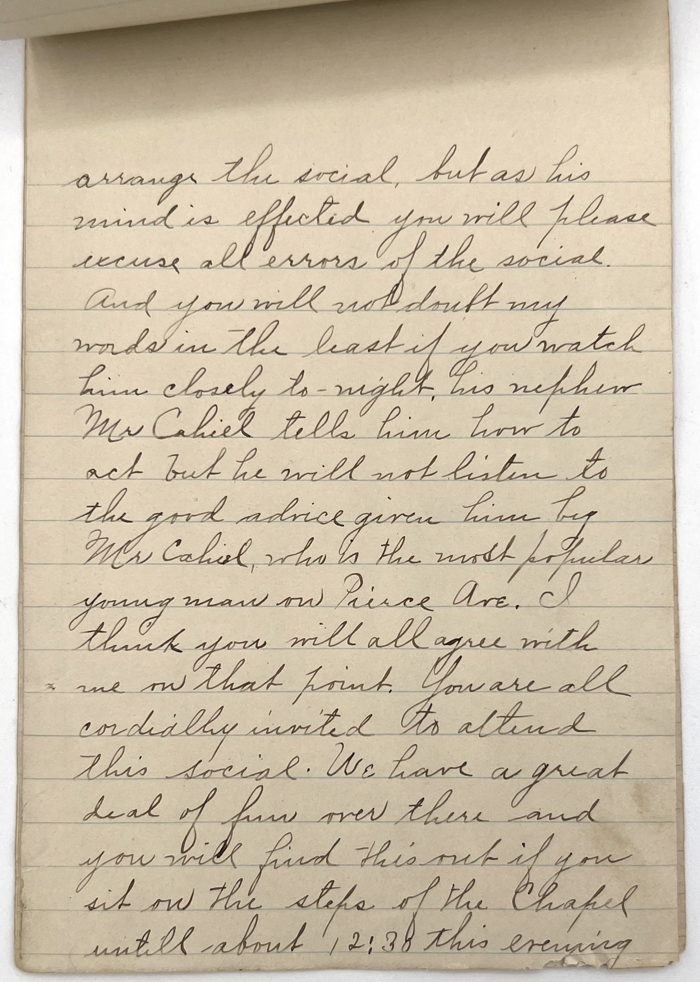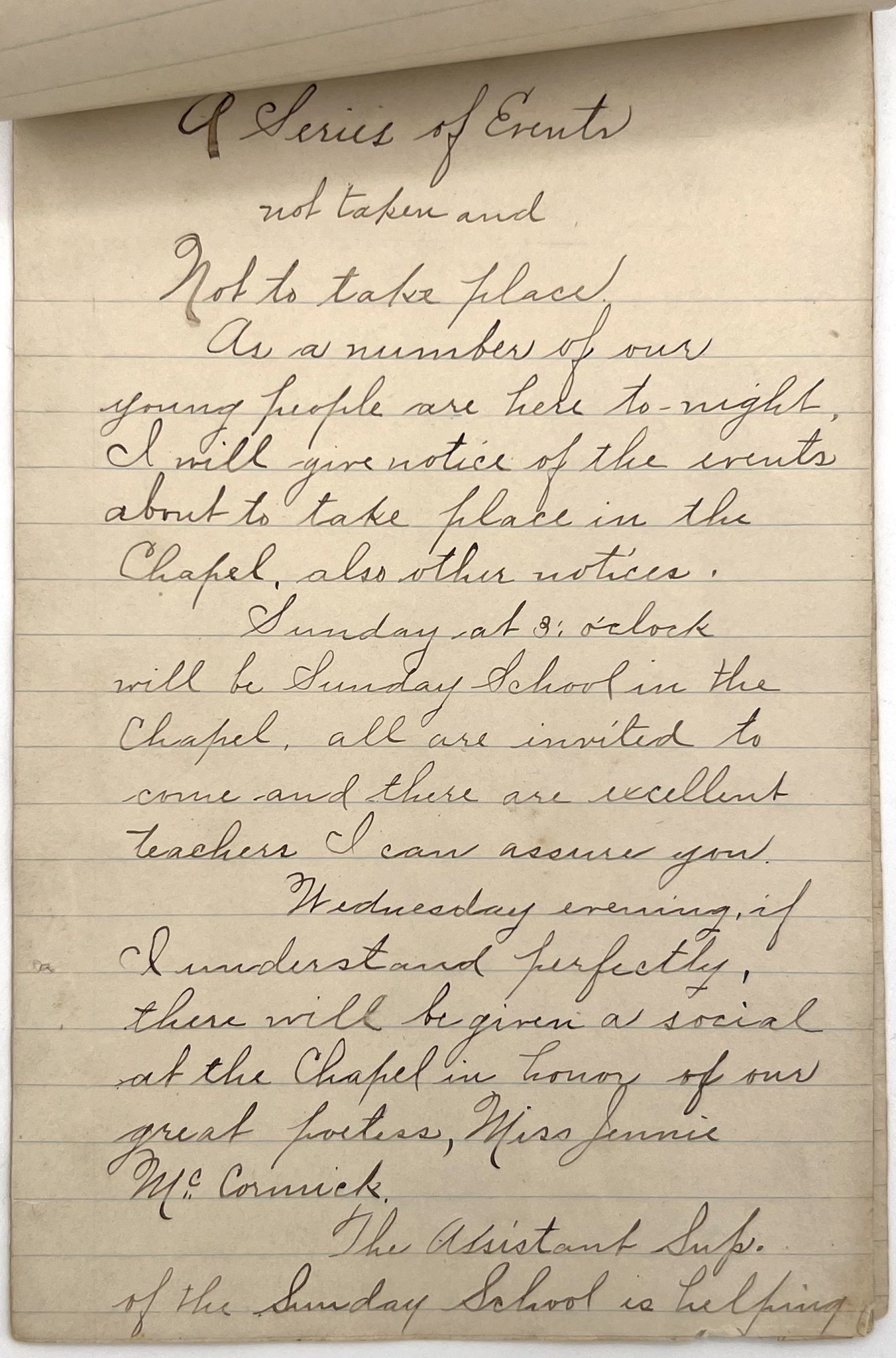 United States: The Narcisses Club, 1930. Very good. Minor toning, spotting, one or two nicks to edges.. What appears to be a tongue-in-cheek fictional speech given at a meeting of "The Narcisses Club" in which one of the governing members relates faux news to the others: "We are going to have an entertainment as well as a social ... Miss Bundy will render a solo (this is if her cold will permit her) but I know she will sing any way in spite of her cold as she is very conceited over her voice (You must not tell her I say this) but she thinks she can sing better than Ellen Beacher Yaw" (Yaw was a popular soprano from 1908 until her death in 1947).