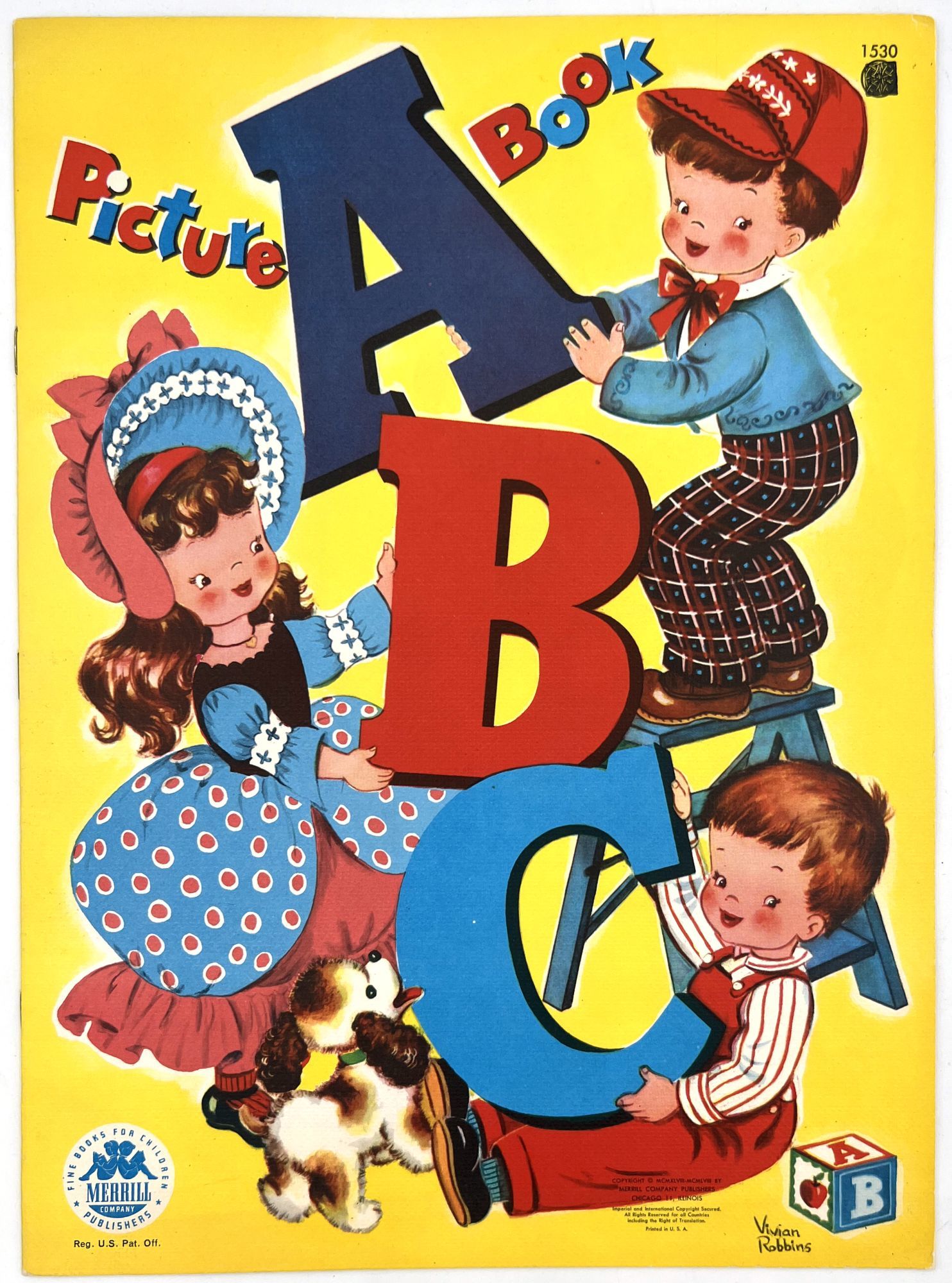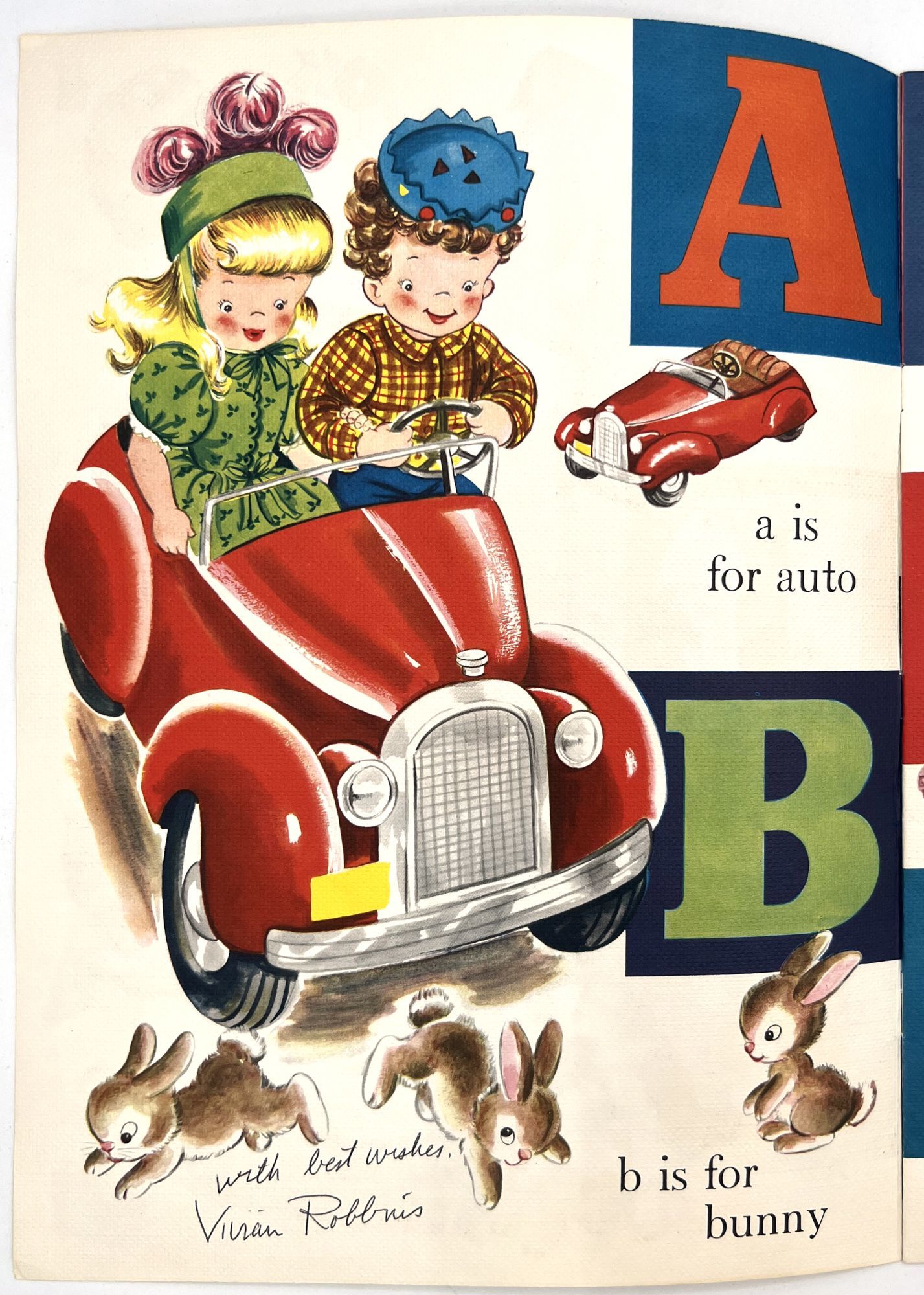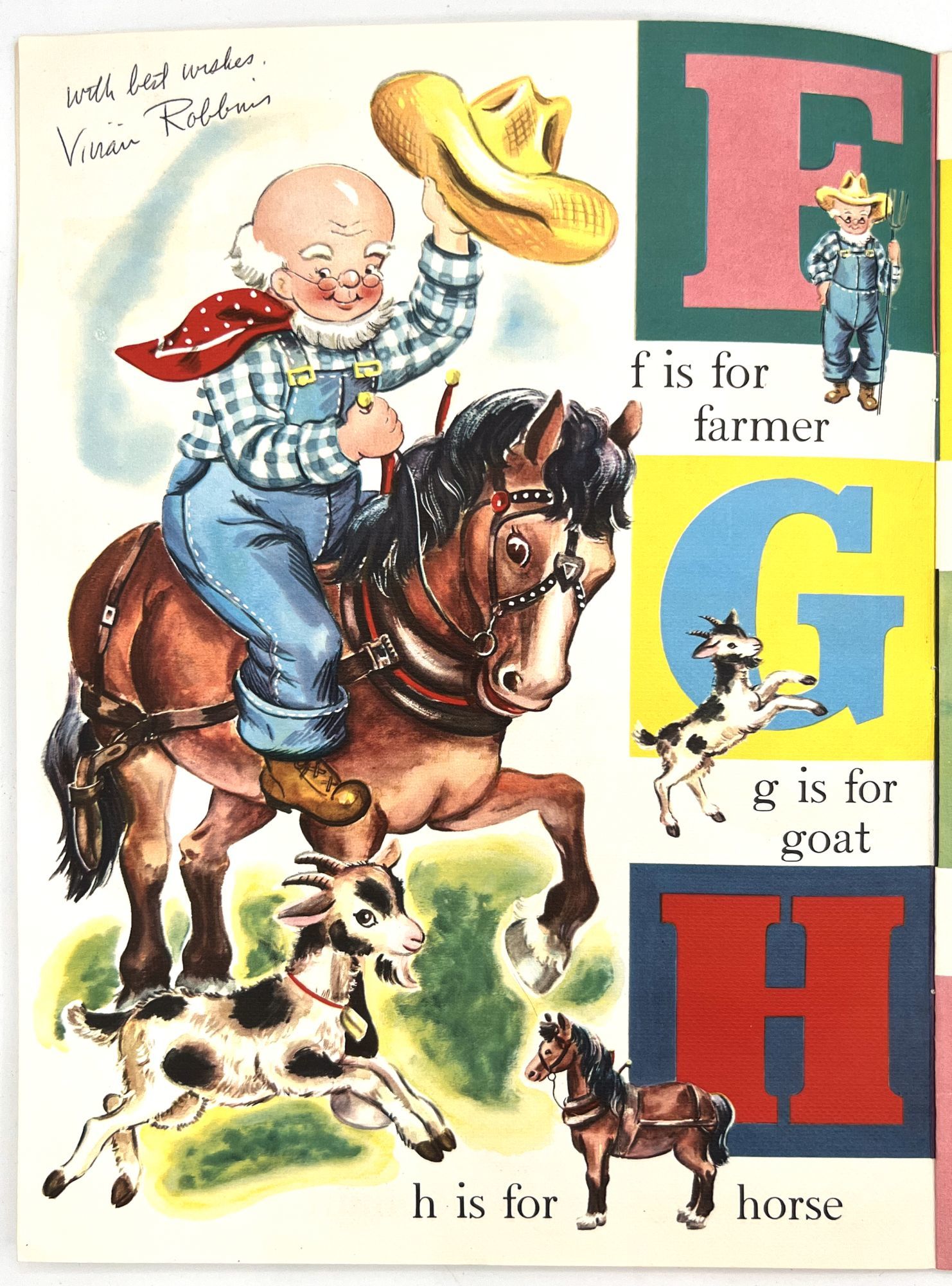 Chicago: Merrill Company Publishers, 1958. Excellent.. Large format linen-like picture book alphabet with imagery and text relevant to the alphabet letter. Unnumbered pages. Measures 13" x 9 1/2". Vibrant color. Autographed by the illustrator. Vivian Robbins.