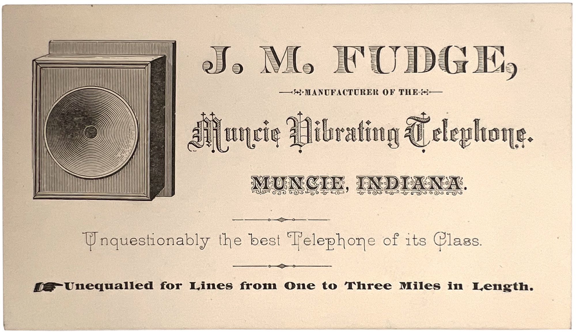 Muncie, Indiana: J.M. Fudge, 1905. Near-fine. Minor toning.. An early telephone trade card promoting the "Muncie Vibrating Telephone" sold by J.M. Fudge of Muncie, Indiana. Fudge markets his product as "unquestionably the best Telephone of its Class" and "Unequalled for Lines from One to Three Miles in Length". Includes an illustration of the device on the left. Fudge seems to have been active in the business c.1905; he died in 1913. Printed card measures 2.75" by 4.75" The telephone is marketed as "vibrating" to let the receiver know a call was coming in.