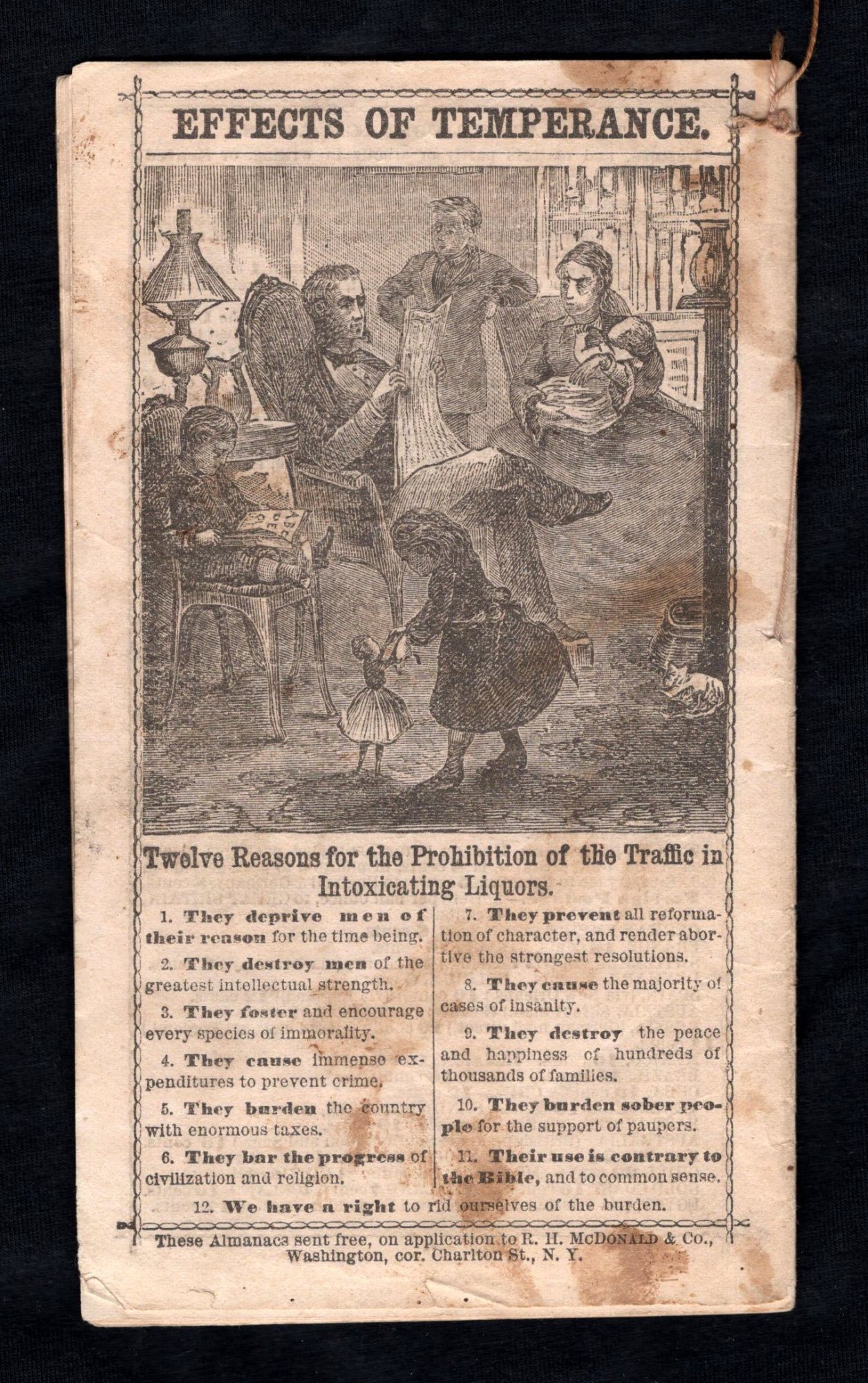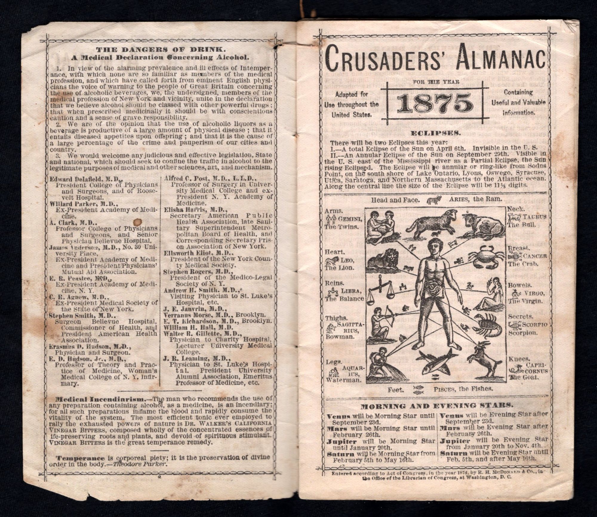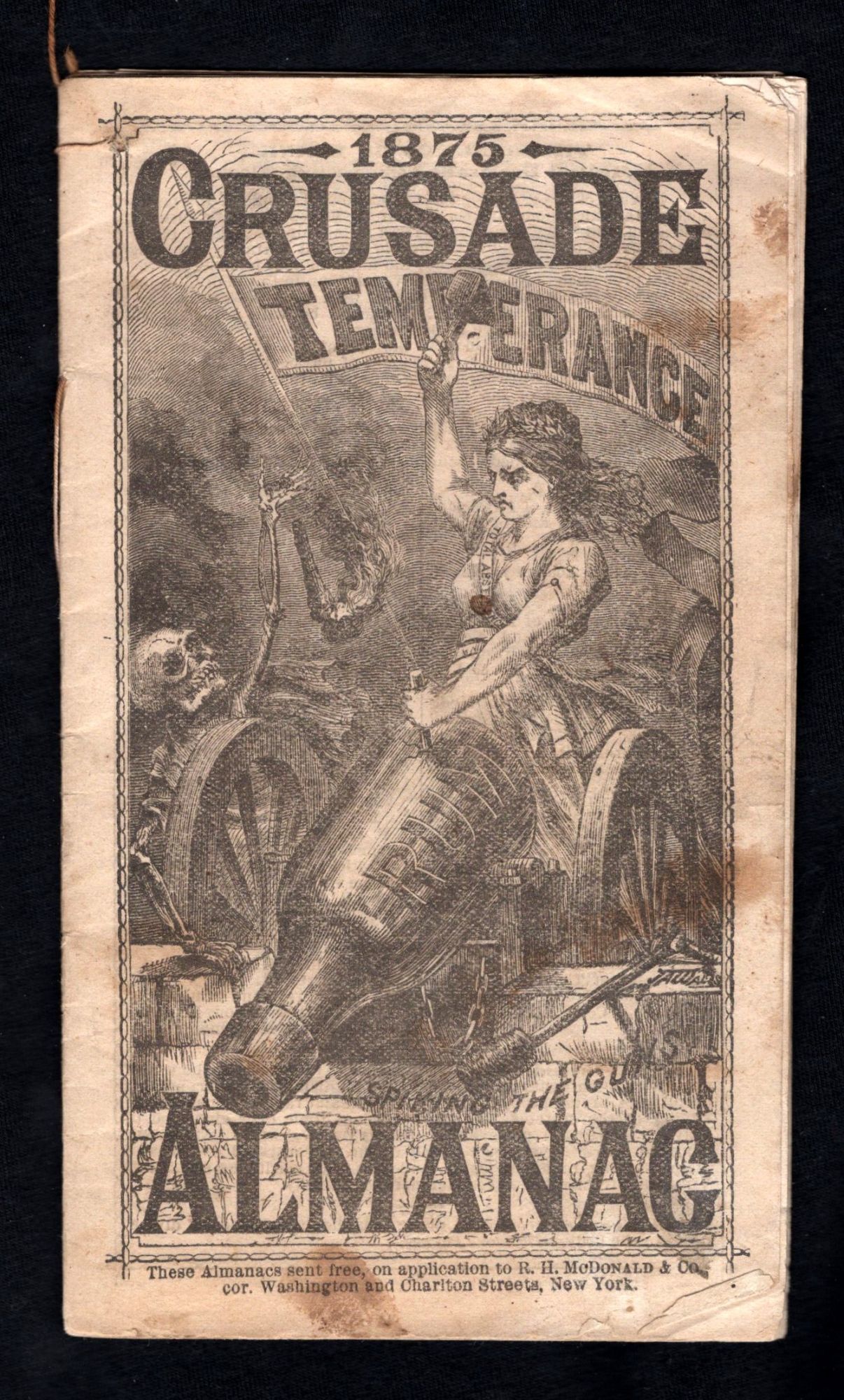 New York, NY: R. H. McDonald & Co, 1874. General wear and toning due to age. Some staining. The string from the binding is too long and sticking up at the top.. An almanac which also served to promote the temperance movement and advertise for the patent medicine known as Dr. Walker's California Vinegar Bitters. The bitters were promoted as being "free from alcohol" and served to purify the blood and cure a variety of ailments, such as: fevers, dyspepsia, skin diseases, chronic and inflammatory rheumatism, tape worms, consumption, mechanical diseases (suffered by people who worked in paints and minerals like plumbers and miners), feminine diseases, scrofula, kidney complaints, diarrhea, and jaundice. The booklet includes several testimonials from satisfied customers. In addition to the advertisements for the bitters, is information on the temperance movement and the dangers of alcohol and tobacco. Included is a black and white illustration of a man terrorizing his family during drunken rage. The front cover features a black and white illustration of a woman wearing a "Total Abstinence" sash using a hammer and nail to break a large bottle of rum which looks more like a cannon, with a skeleton in the background. "Spiking the Guns" is inscribed at the base. The back cover depicts a black and white illustration of a young family, parents and four children, playing at home with the "Twelve Reasons for Prohibition of the Traffic in Intoxicating Liquors" listed below. 31 pgs. Illustrated wrappers. String binding. OCLC 59 (February 2021, entries are a mix between the two variant titles: "Crusaders' Almanac for the Year 1875" and "Crusade Temperance Almanac"). Measures 6 1/2" x 3 3/4