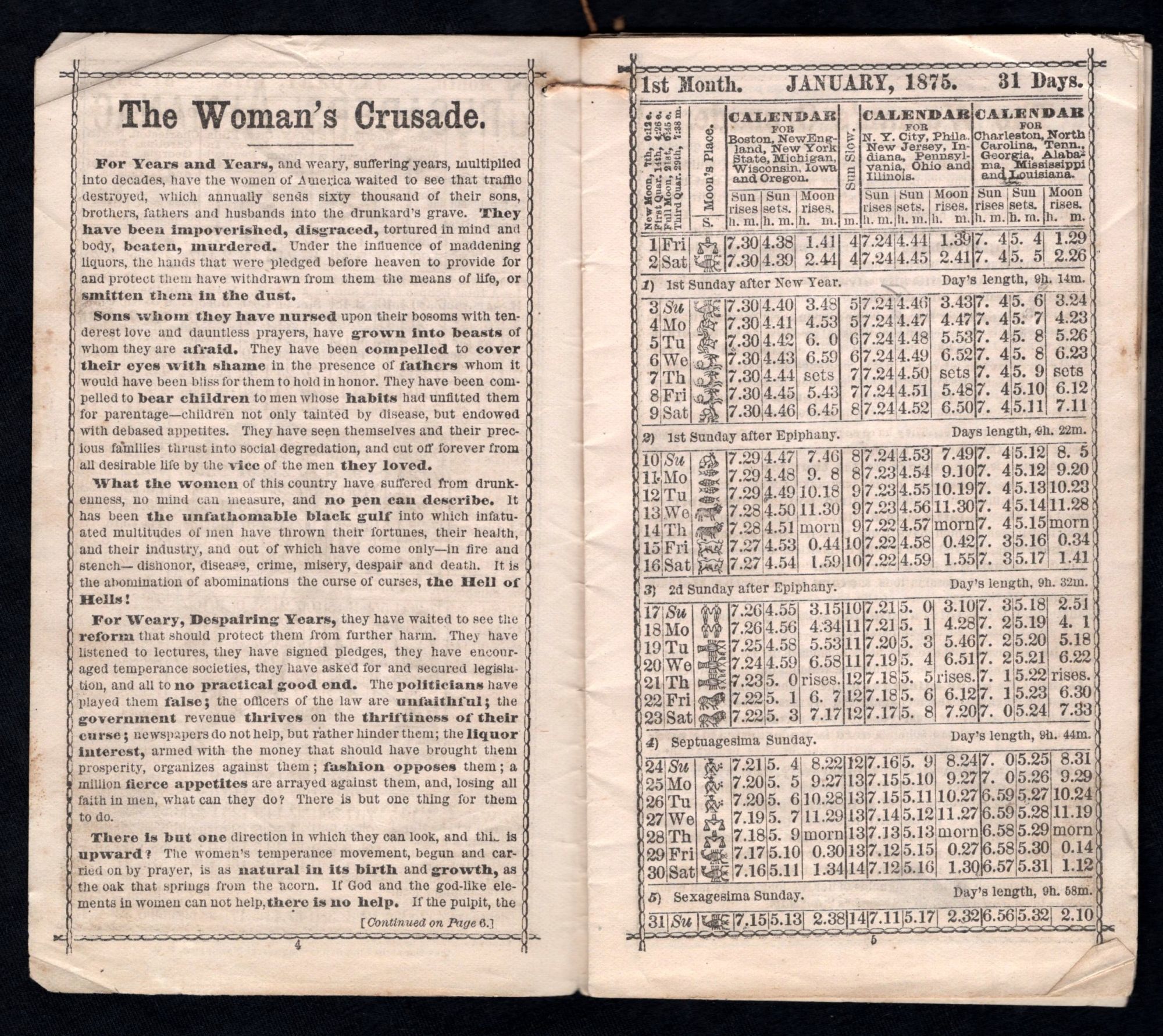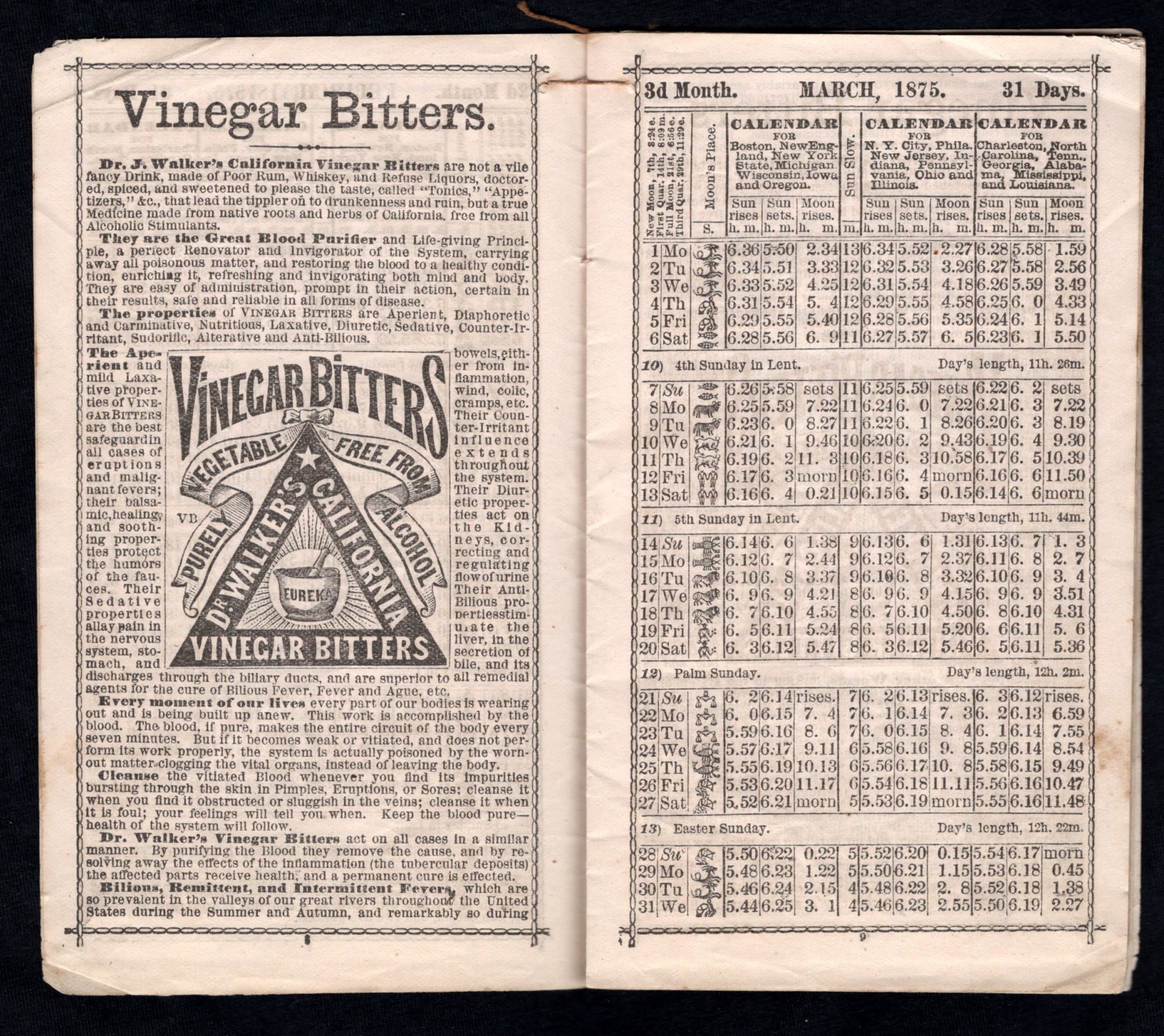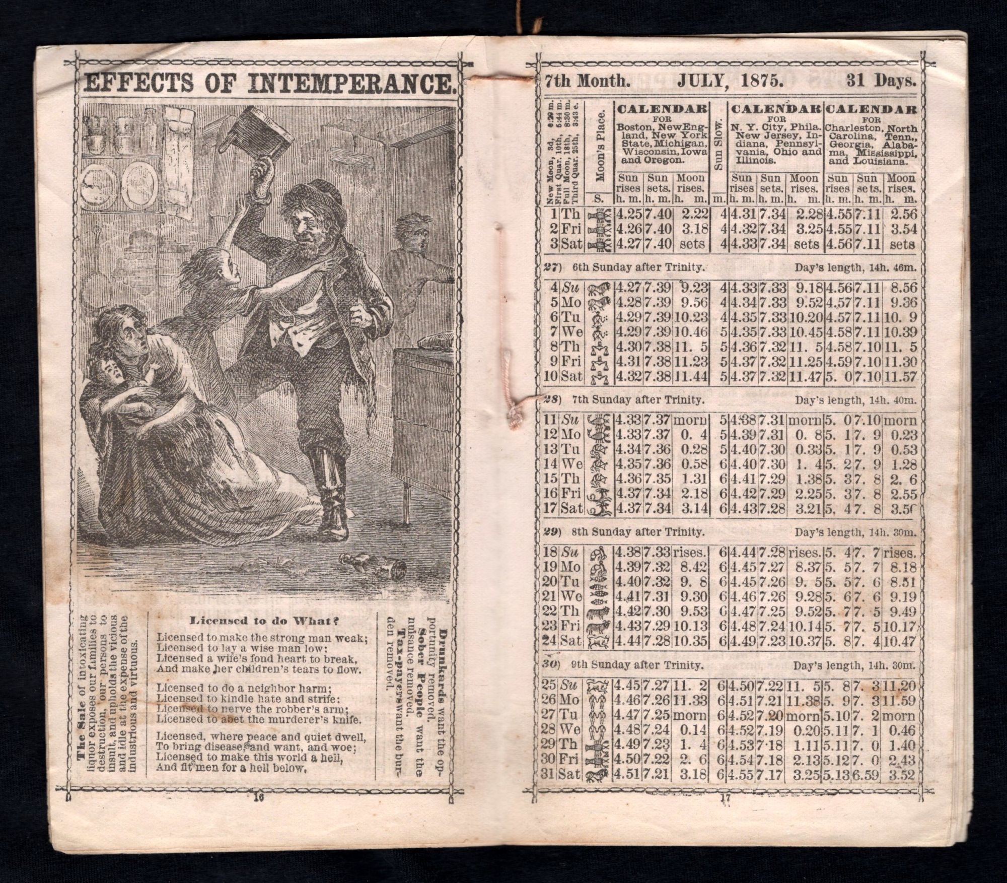 New York, NY: R. H. McDonald & Co, 1874. General wear and toning due to age. Some staining. The string from the binding is too long and sticking up at the top.. An almanac which also served to promote the temperance movement and advertise for the patent medicine known as Dr. Walker's California Vinegar Bitters. The bitters were promoted as being "free from alcohol" and served to purify the blood and cure a variety of ailments, such as: fevers, dyspepsia, skin diseases, chronic and inflammatory rheumatism, tape worms, consumption, mechanical diseases (suffered by people who worked in paints and minerals like plumbers and miners), feminine diseases, scrofula, kidney complaints, diarrhea, and jaundice. The booklet includes several testimonials from satisfied customers. In addition to the advertisements for the bitters, is information on the temperance movement and the dangers of alcohol and tobacco. Included is a black and white illustration of a man terrorizing his family during drunken rage. The front cover features a black and white illustration of a woman wearing a "Total Abstinence" sash using a hammer and nail to break a large bottle of rum which looks more like a cannon, with a skeleton in the background. "Spiking the Guns" is inscribed at the base. The back cover depicts a black and white illustration of a young family, parents and four children, playing at home with the "Twelve Reasons for Prohibition of the Traffic in Intoxicating Liquors" listed below. 31 pgs. Illustrated wrappers. String binding. OCLC 59 (February 2021, entries are a mix between the two variant titles: "Crusaders' Almanac for the Year 1875" and "Crusade Temperance Almanac"). Measures 6 1/2" x 3 3/4