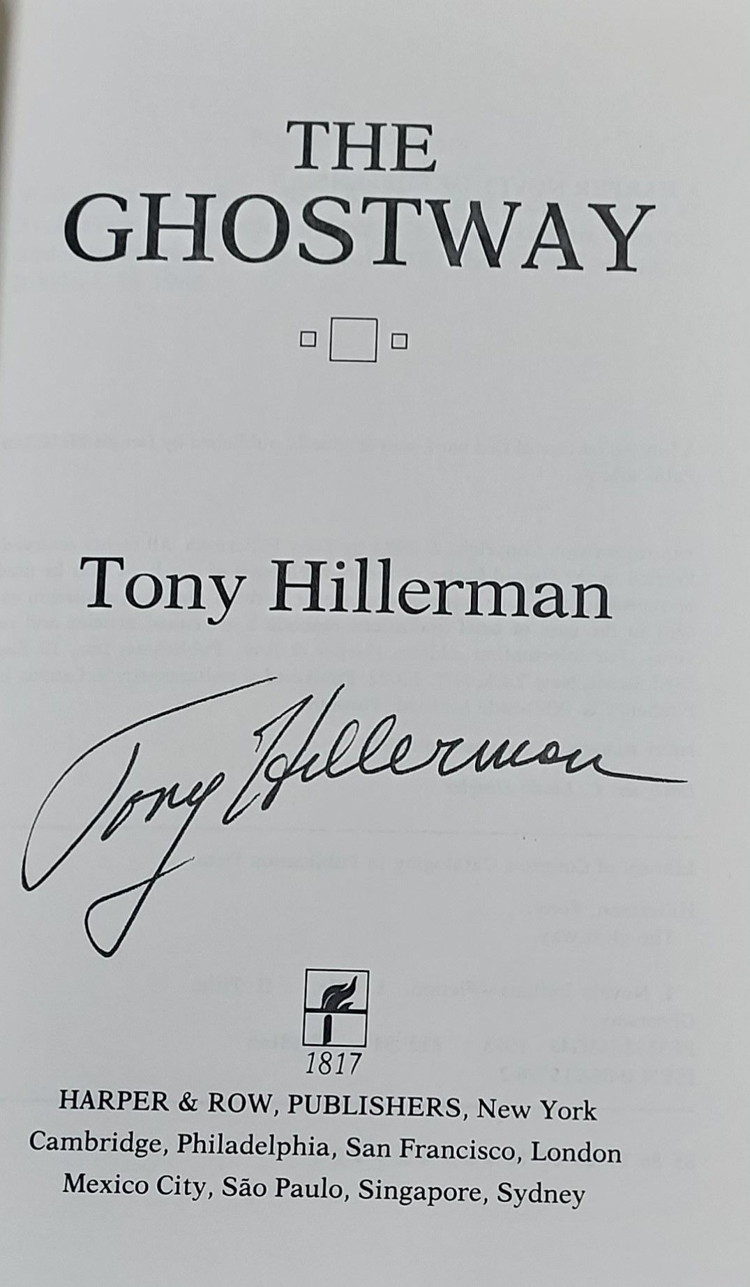 New York: Harper & Row, 1985. First Harper & Row edition. Hardcover. Fine/Very Good. SIGNED. 213pp. Octavo. [21.5cm] 1/4 blue cloth over brown boards with the title stamped in copper on the spine. In the illustrated dust jacket with light shelfwear, and a couple of minor closed tears that have been backed with tape. The Ghostway is the sixth crime fiction novel in the Joe Leaphorn/Jim Chee Navajo Tribal Police series by Tony Hillerman.
