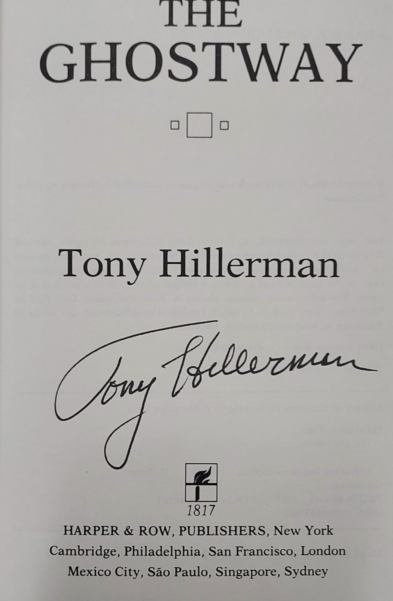 New York: Harper & Row, 1985. First Harper & Row edition. Hardcover. Near Fine/Very Good. SIGNED. 213pp. Octavo. [21.5cm] 1/4 blue cloth over brown boards with the title stamped in copper on the spine. In the illustrated dust jacket with light scratching to the panels, and a 1" closed tear that has been backed with tape. The Ghostway is the sixth crime fiction novel in the Joe Leaphorn/Jim Chee Navajo Tribal Police series by Tony Hillerman.