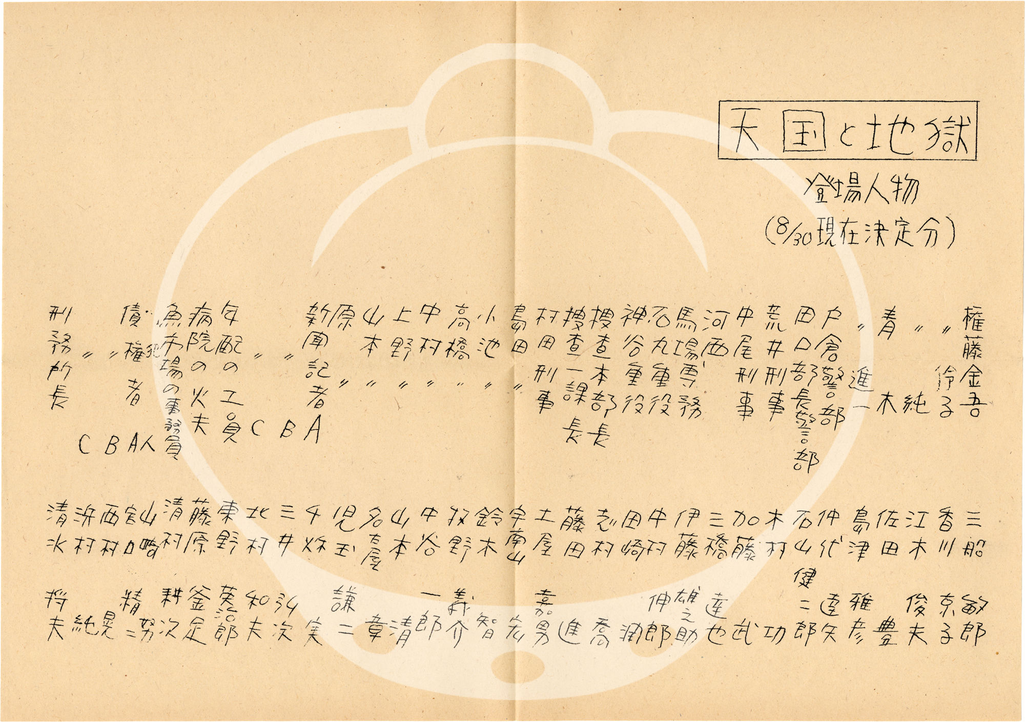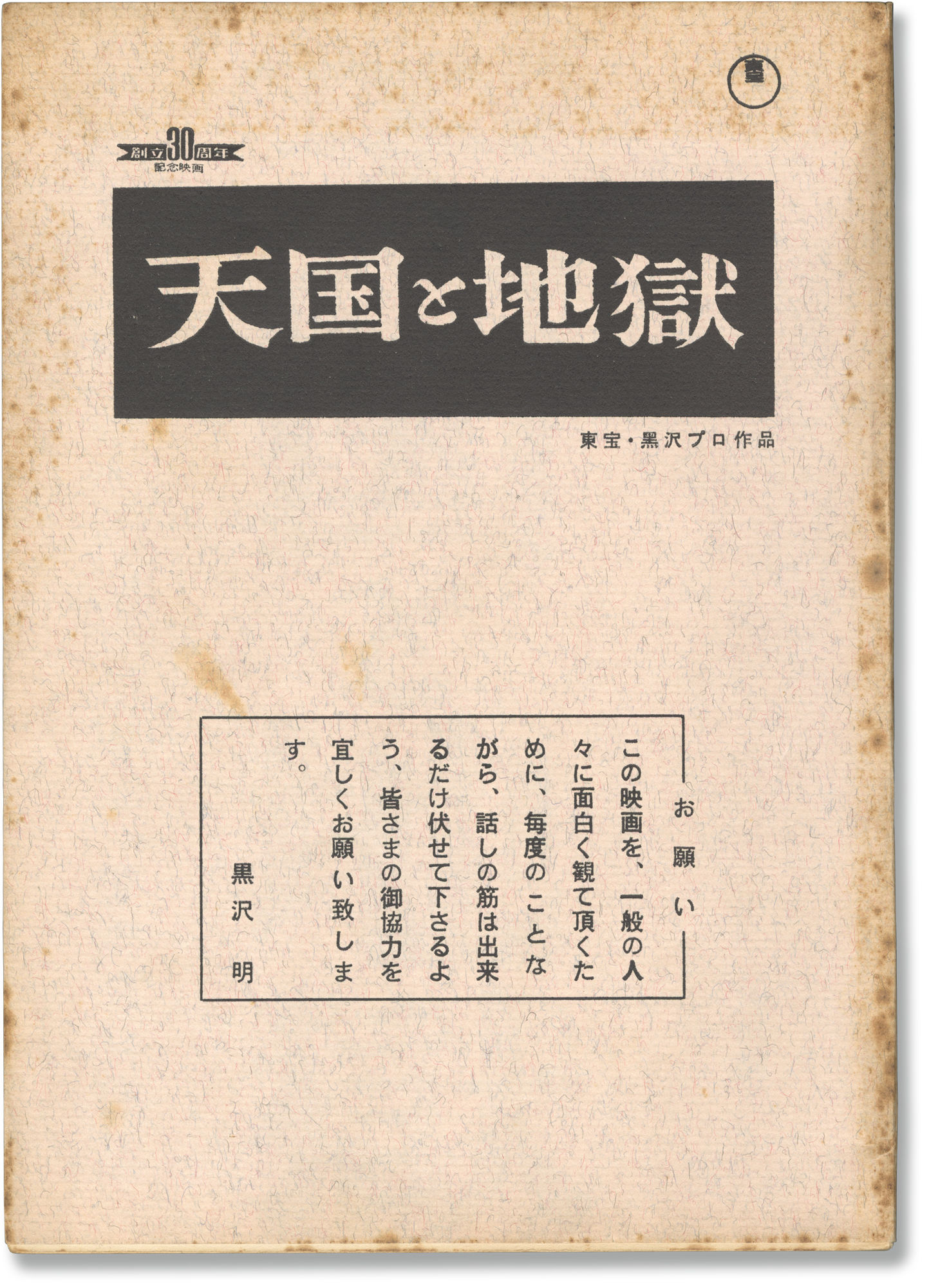 Tokyo: Toho / Kurosawa Productions, 1962. Draft script for the 1963 Japanese film. Text and titles in Japanese.