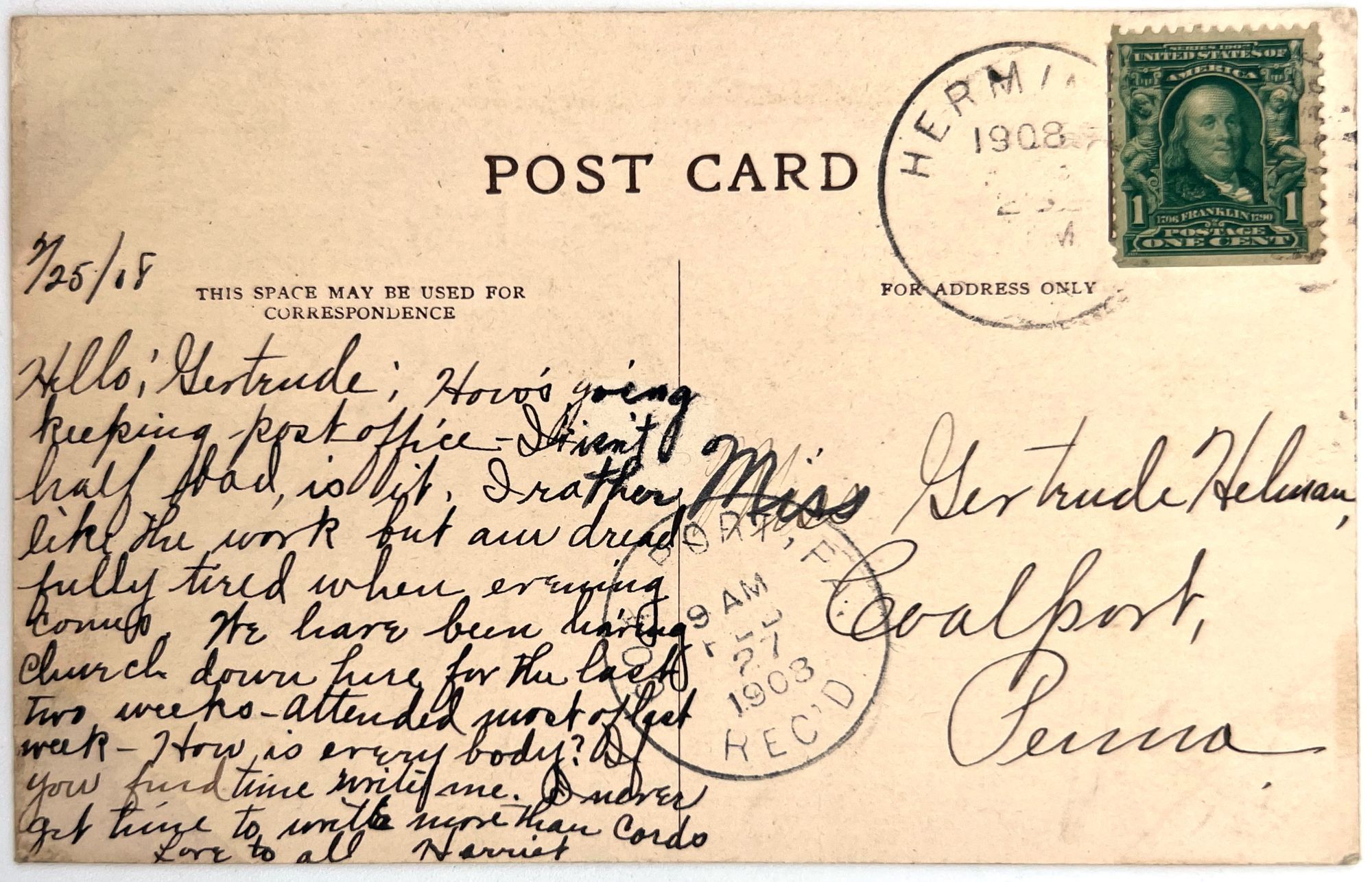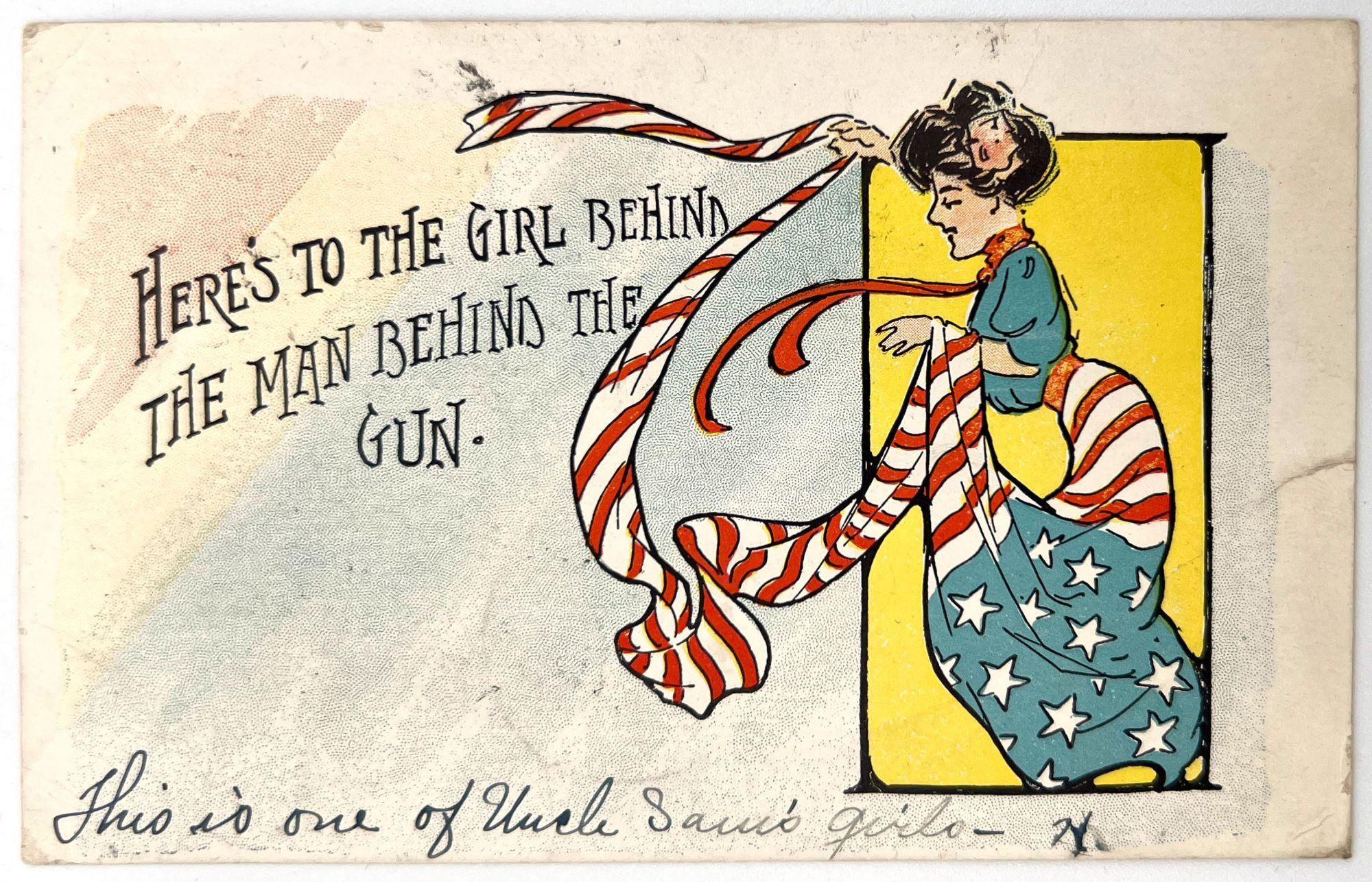 United States, 1908. Very good. Minor edge wear and dust soiling.. Pre-WWI patriotic postcard with an image of a young woman wearing the stars and stripes alongside the message "Here's to the Girl Behind the Man Behind the Gun". A charming reminder of the importance of women and the home front. Measures 3.5" by 5.5". Addressed and postmarked with message on back. Includes early ink manuscript caption to the front that reads, "This is one of Uncle Sam's girls. --H
