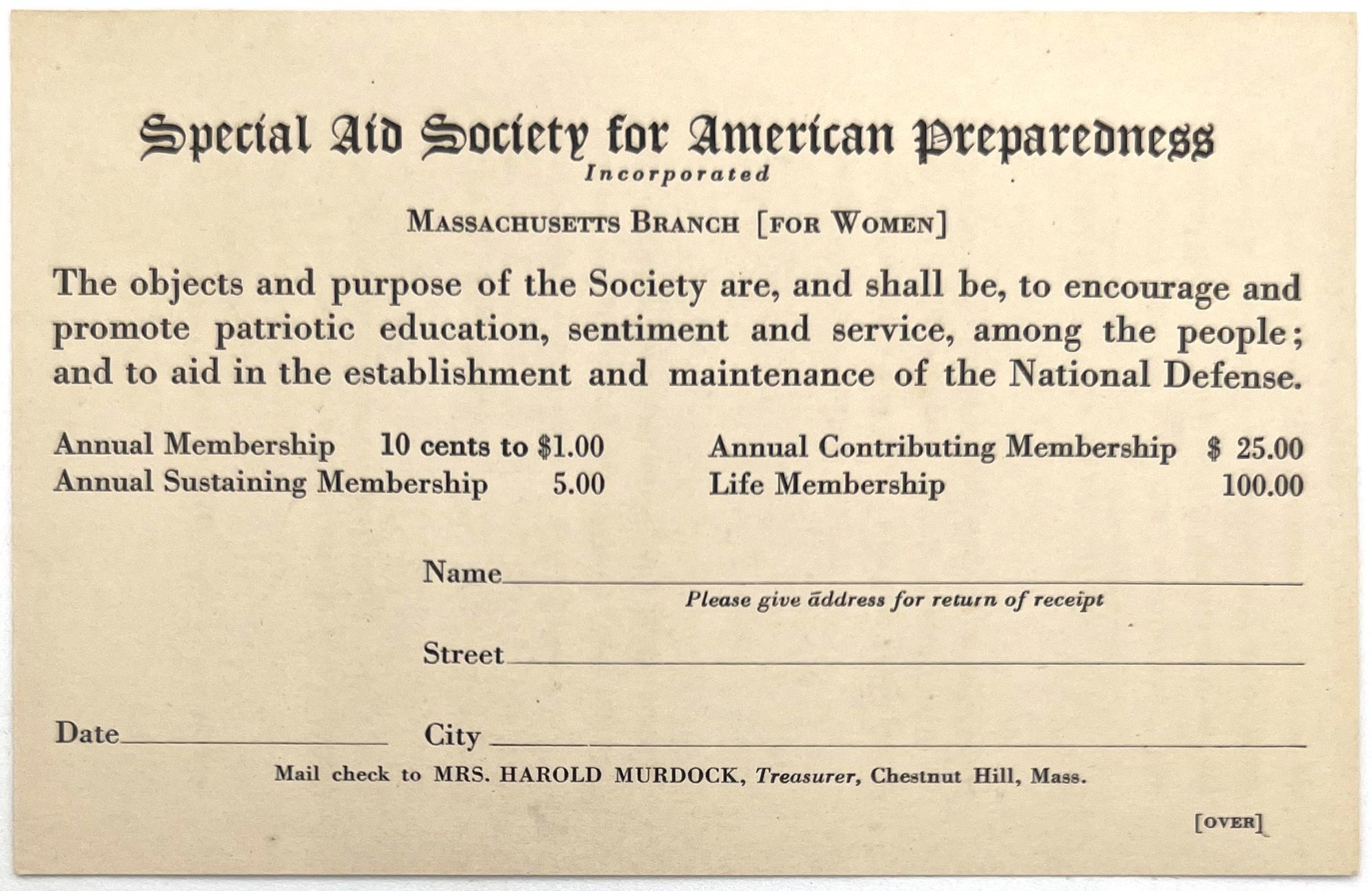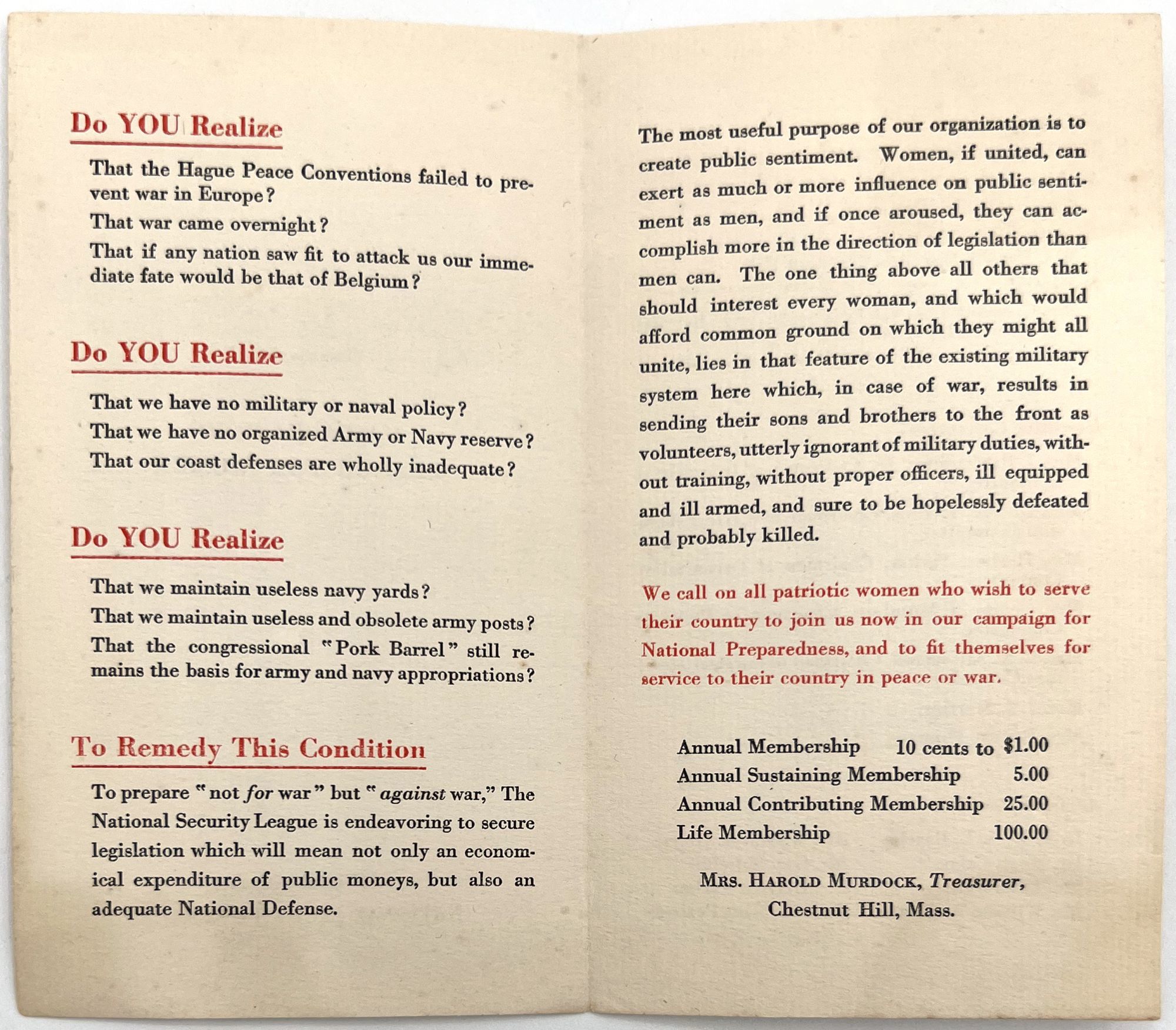 Boston, Massachusetts: Massachusetts Branch for Women of the Special Aid Society for American Preparedness, 1916. Very good. Minor staining.. First World War-era pamphlet promoting the Massachusetts Branch for Women of the Special Aid Society for American Preparedness, an affiliate of the National Security League: "The most useful purpose of our organization is to create public sentiment. Women, if united, can exert as much or more influence on public sentiment as men, and if once aroused, they can accomplish more in the direction of legislation than men can ... [war] results in sending [our] sons and brothers to the front as volunteers, utterly ignorant of military duties ... sure to be hopelessly defeated and probably killed". Includes a mail-in form for membership. Printed bifolium (5.75" by 6.5") with mail-in slip measuring 3.25" by 5" Important evidence of American women's involvement in anti-war legislation in the 1910s.