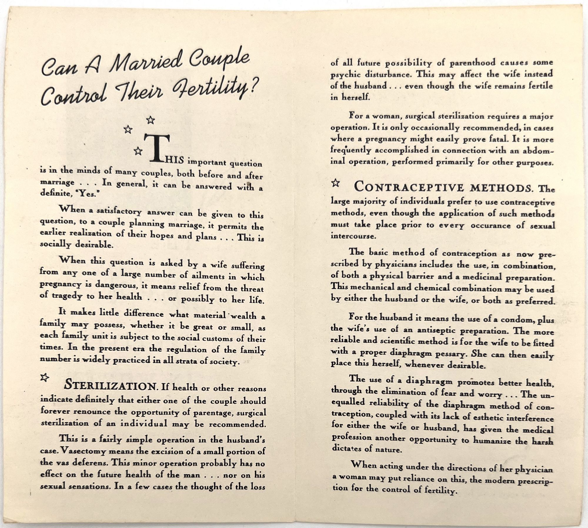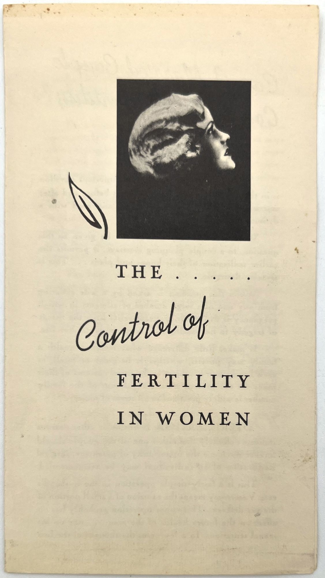 United States: N.p., 1920. Near-fine. A couple minor spots.. Featuring a glamorous young woman with blonde finger waves on the cover, "The Control of Fertility in Women" educates American women in the 1920s about sterilization (both male and female) and contraception methods (including condoms, diaphragms, spermicidal foam). "Can a married couple control their fertility? ... When this question is asked by a wife suffering from any one of a large, number of ailments in which pregnancy is dangerous, it means relief from the threat of tragedy to her health, or possibly her life". Emphasizes the importance of family planning to the "modern woman", and dismisses taboos surrounding contraception by stating that "in the present era the regulation of the family number is widely practiced in all strata of society". No publisher is listed. Important ephemeral evidence of family planning options for women in the 1920s. Printed bifolium (6.25" by 3.5").