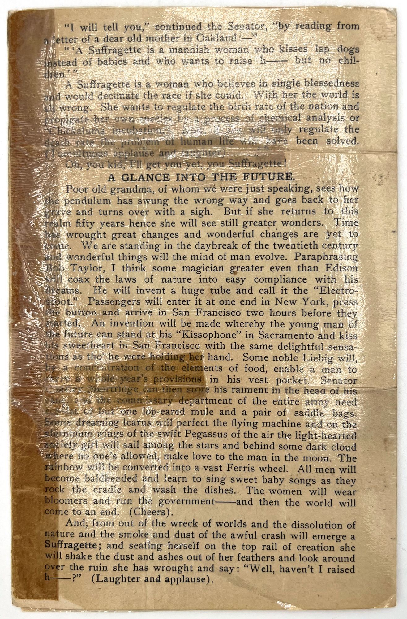 1911. Tape repair. Toned. "laminated" for preservation.. An anti-Women's suffrage speech asking readers to vote "No" on California's Equal Suffrage Amendment. It was narrowly approved after an earlier 1896 attempt had failed. Emphasizes the importance of keeping the "woman's sphere" separate, the need to keep domestic life "pure", and refers to the Suffragette as a "mannish woman who kisses lap dogs instead of babies". Uses the offensive racial stereotype of the Hottentot to paint a derisive image of the "New Man and the New Woman". Ends by predicting that "The women will wear bloomers and run the government--and then the world will come to an end." Bifolium (8" by 5"). J.B. Sanford was Chairman of the California Democratic Caucus in 1911, and fought hard to keep women from the polls.