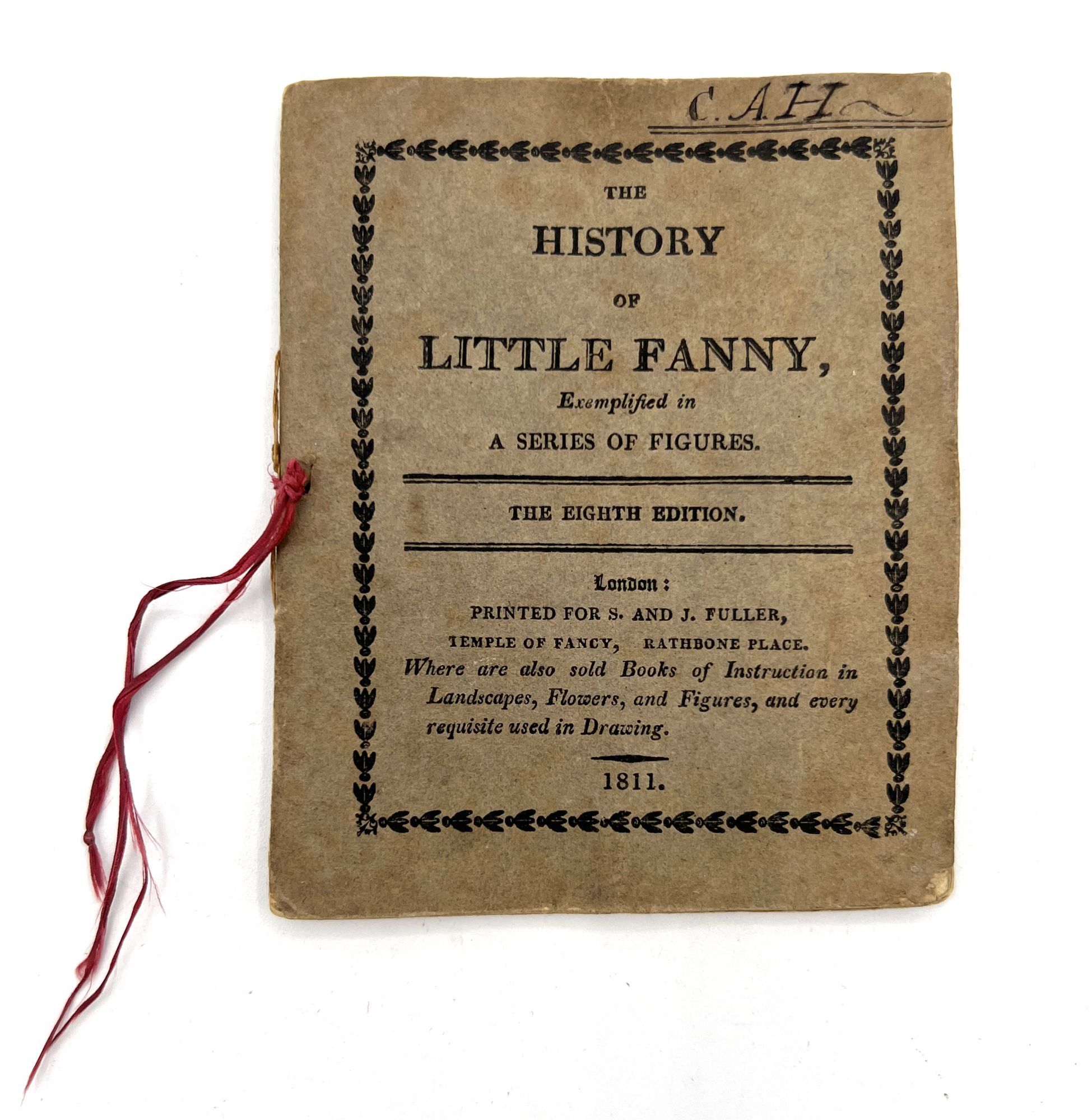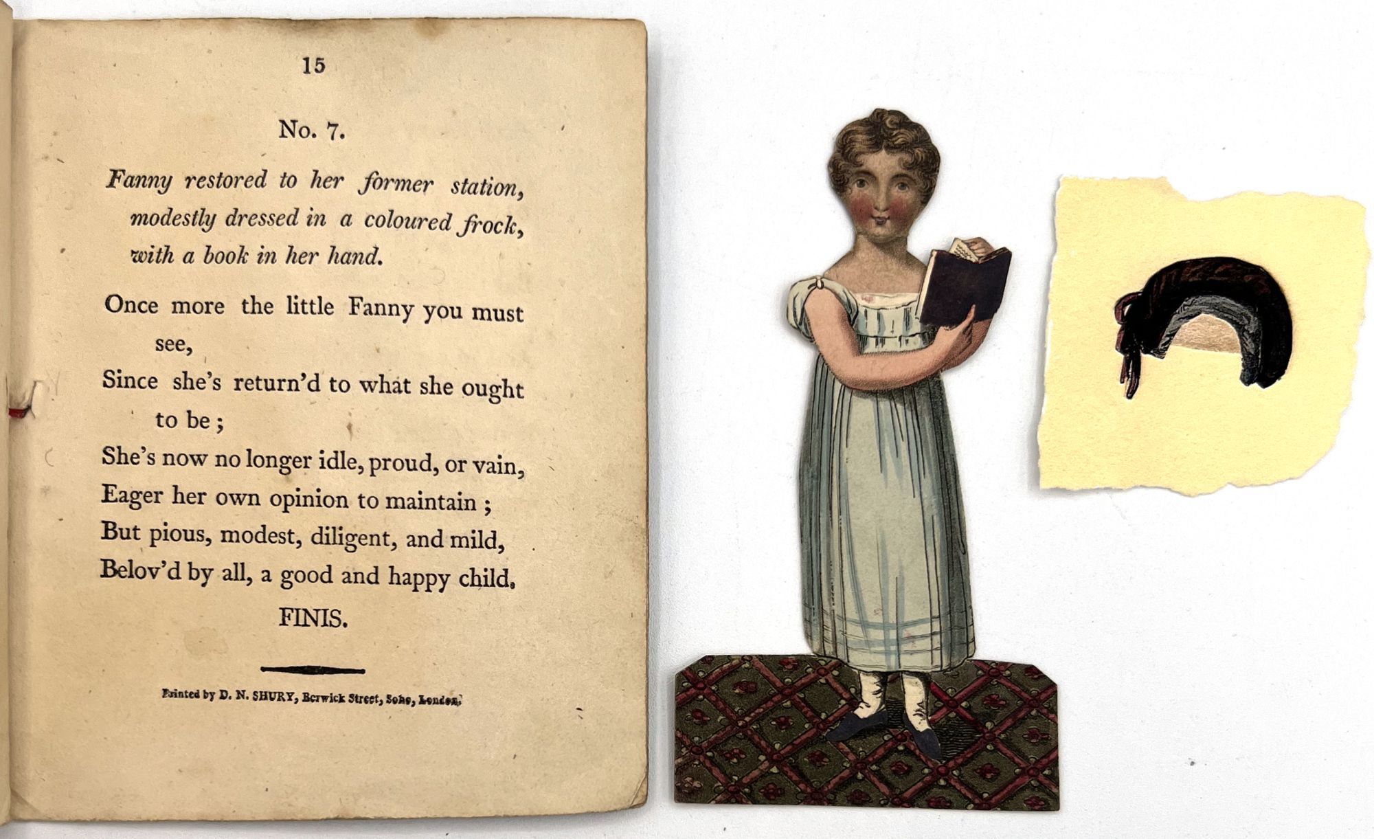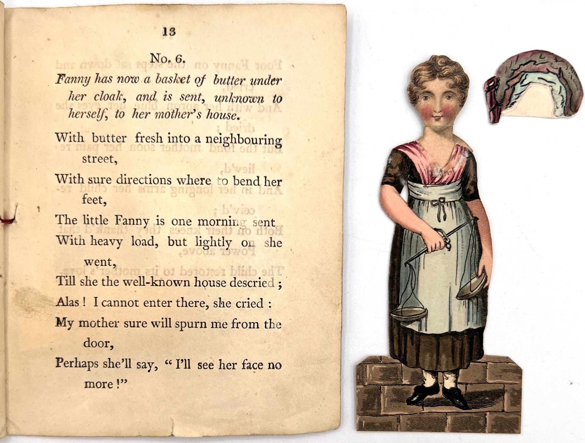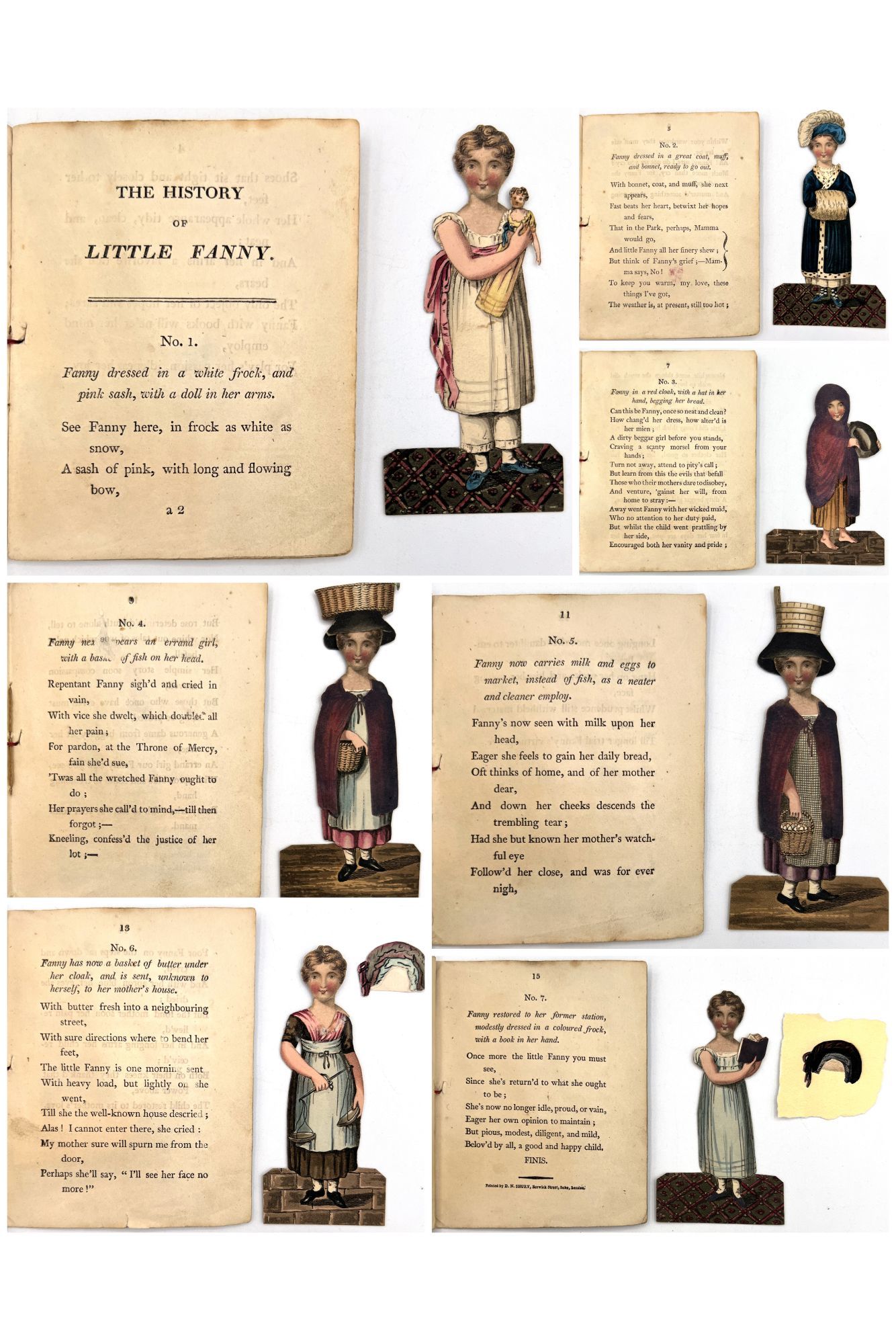 London: S. and J. Fuller, 1811. Very good. Lacking original slipcase. Light toning, with some dust soiling. Lacking at least two hats, replaced with modern facsimiles.. Eighth edition, a scarce near-complete example of "The History of Little Fanny", a Regency-era paper doll book about a little girl who grows from being "idle" and "vain" to "pious, modest, diligent, and mild". Single vol. (5" by 4"), pp. 15, [3], hand-stitched in original printed wrappers with typographical border, secured further with later red embroidery thread in left-hand margin. Enclosed are: one (1) hand-colored engraved paper doll head measuring approx. 2", seven (7) hand-colored overlays (each approx. 3.5" tall) (complete), and three (3) matching hairs/hats, all pre-cut. Modern bookplate of David Lang Philips to upper wrapper verso. Early pen initials to upper wrapper ("C.A.H."). Note the italicized captions at the heads of the pages, which tell the reader which overlay to use for that part of the story.