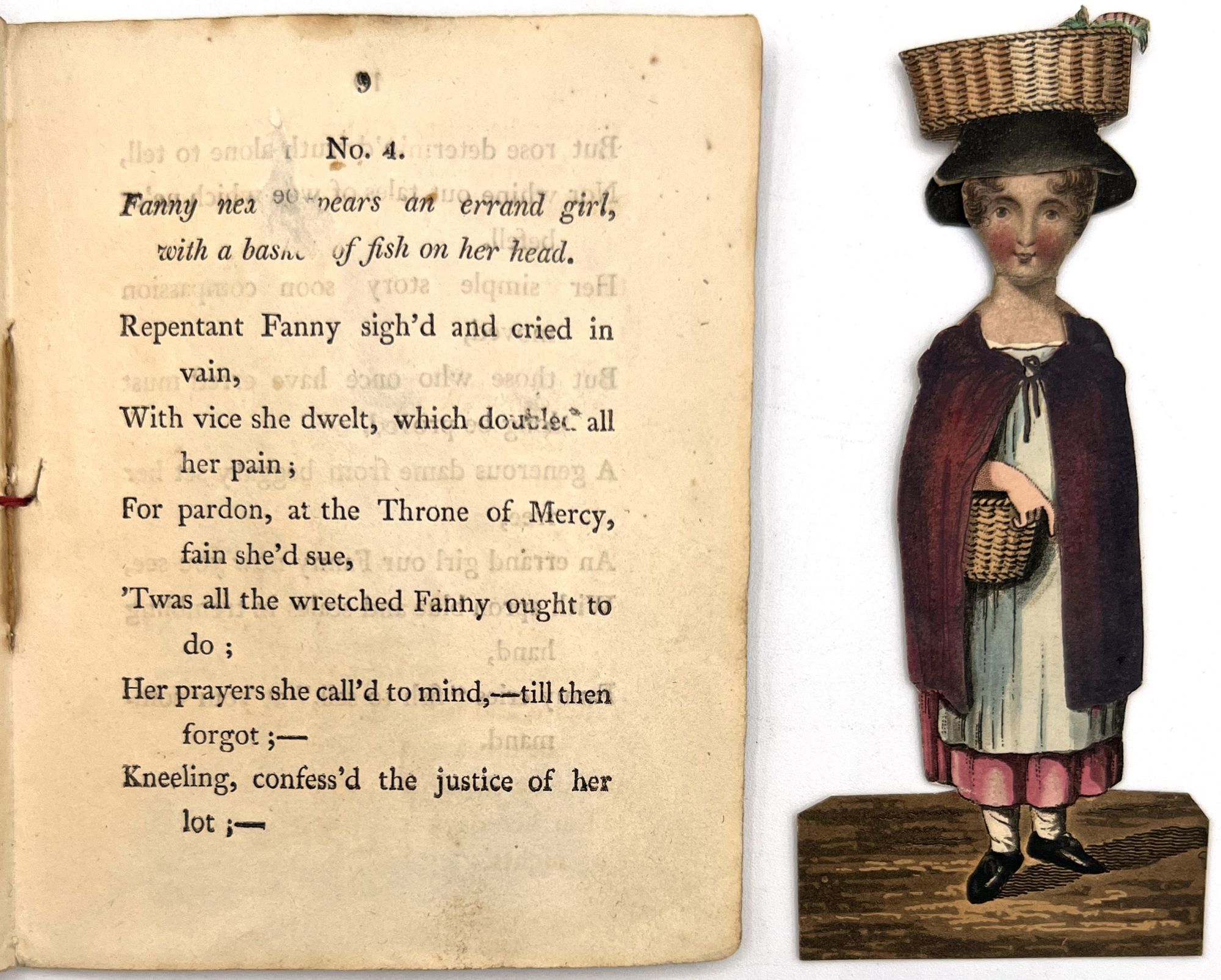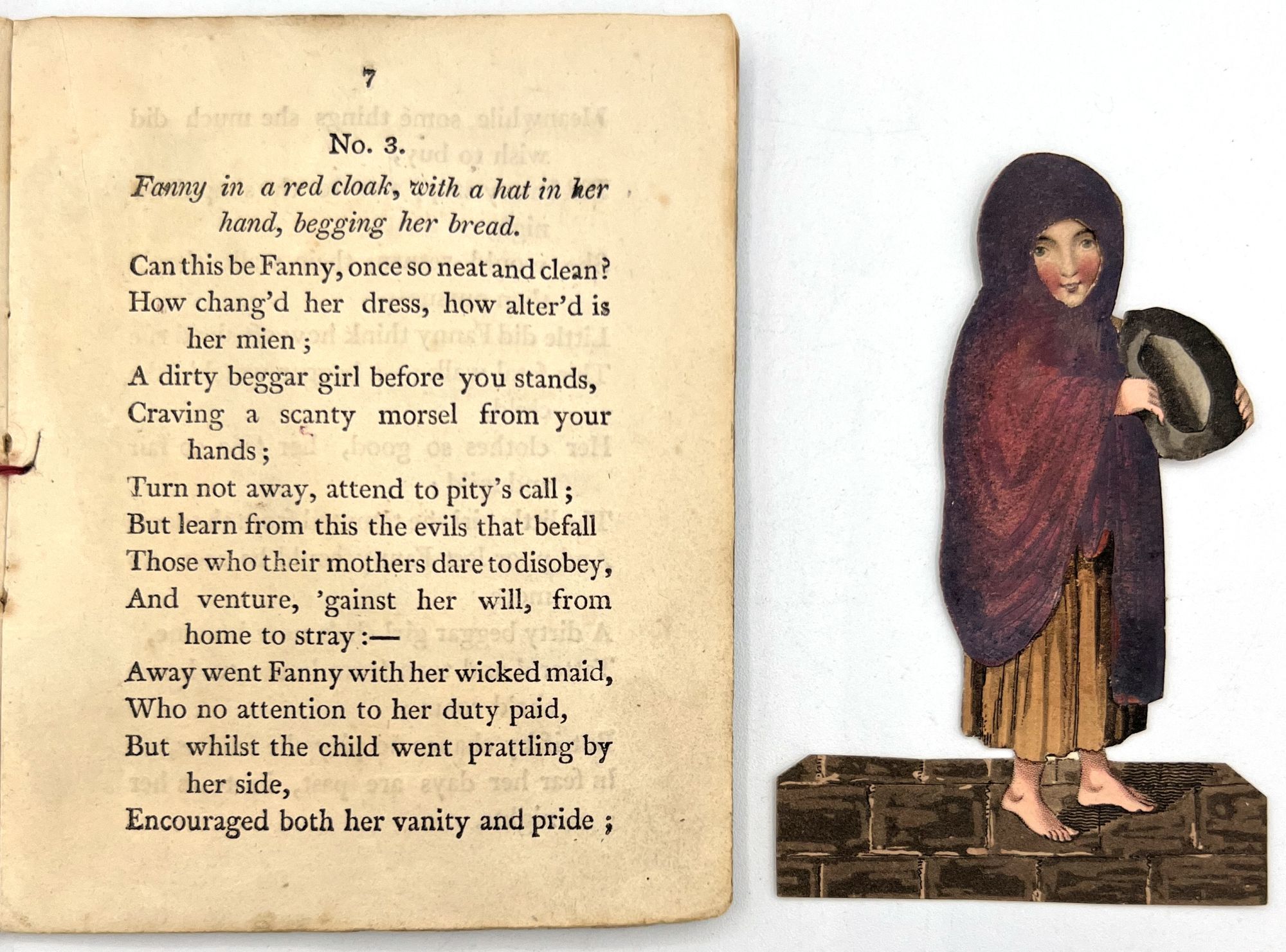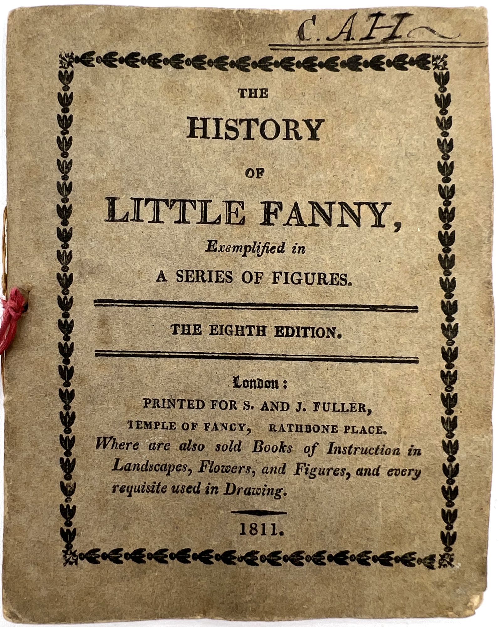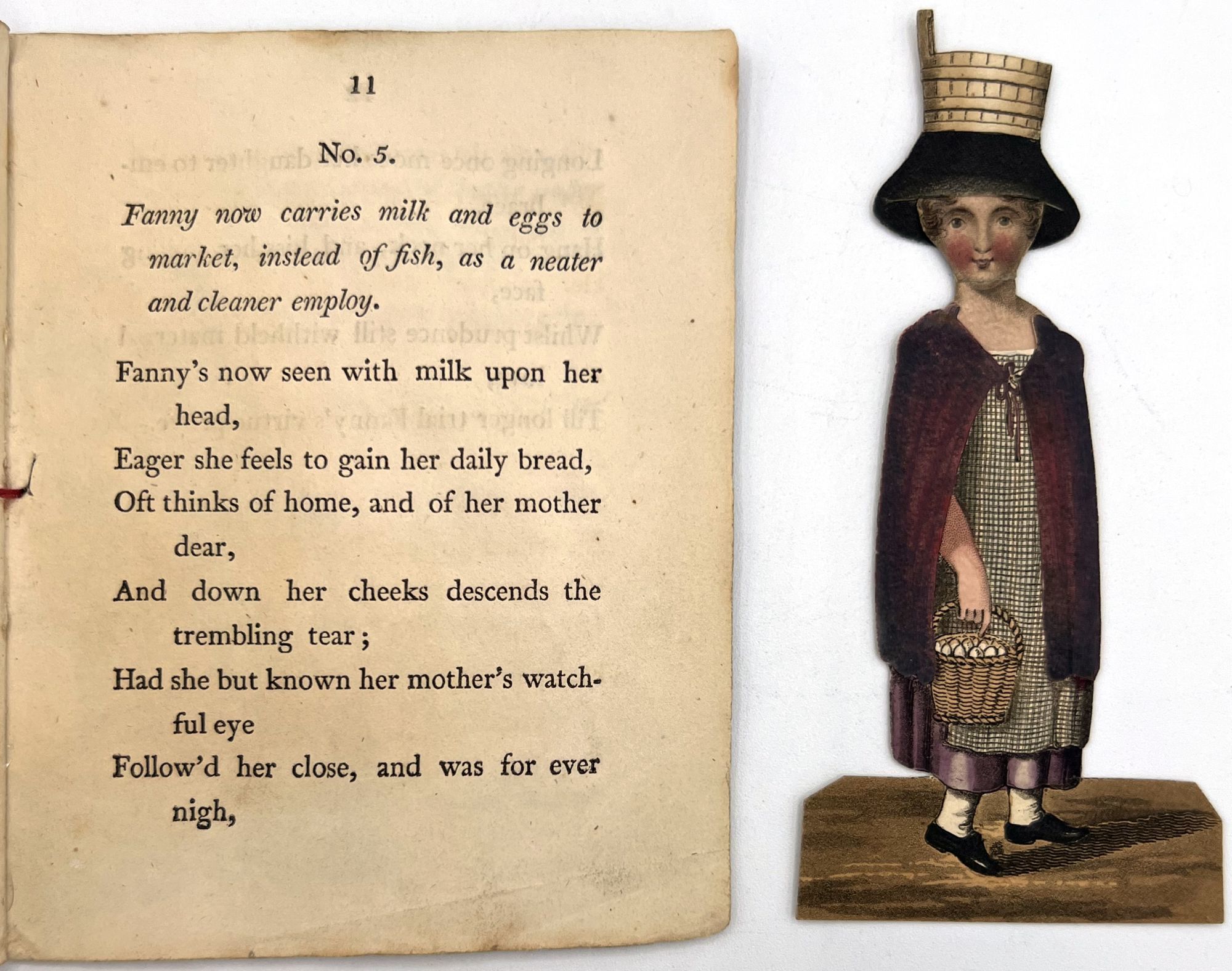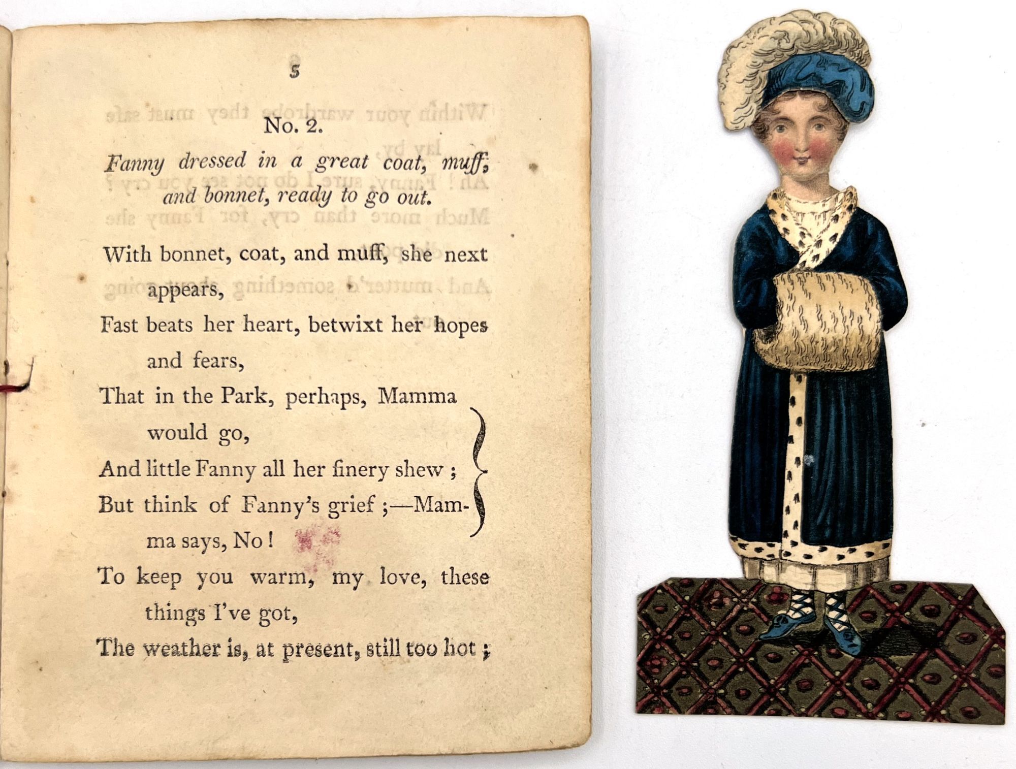 London: S. and J. Fuller, 1811. Very good. Lacking original slipcase. Light toning, with some dust soiling. Lacking at least two hats, replaced with modern facsimiles.. Eighth edition, a scarce near-complete example of "The History of Little Fanny", a Regency-era paper doll book about a little girl who grows from being "idle" and "vain" to "pious, modest, diligent, and mild". Single vol. (5" by 4"), pp. 15, [3], hand-stitched in original printed wrappers with typographical border, secured further with later red embroidery thread in left-hand margin. Enclosed are: one (1) hand-colored engraved paper doll head measuring approx. 2", seven (7) hand-colored overlays (each approx. 3.5" tall) (complete), and three (3) matching hairs/hats, all pre-cut. Modern bookplate of David Lang Philips to upper wrapper verso. Early pen initials to upper wrapper ("C.A.H."). Note the italicized captions at the heads of the pages, which tell the reader which overlay to use for that part of the story.