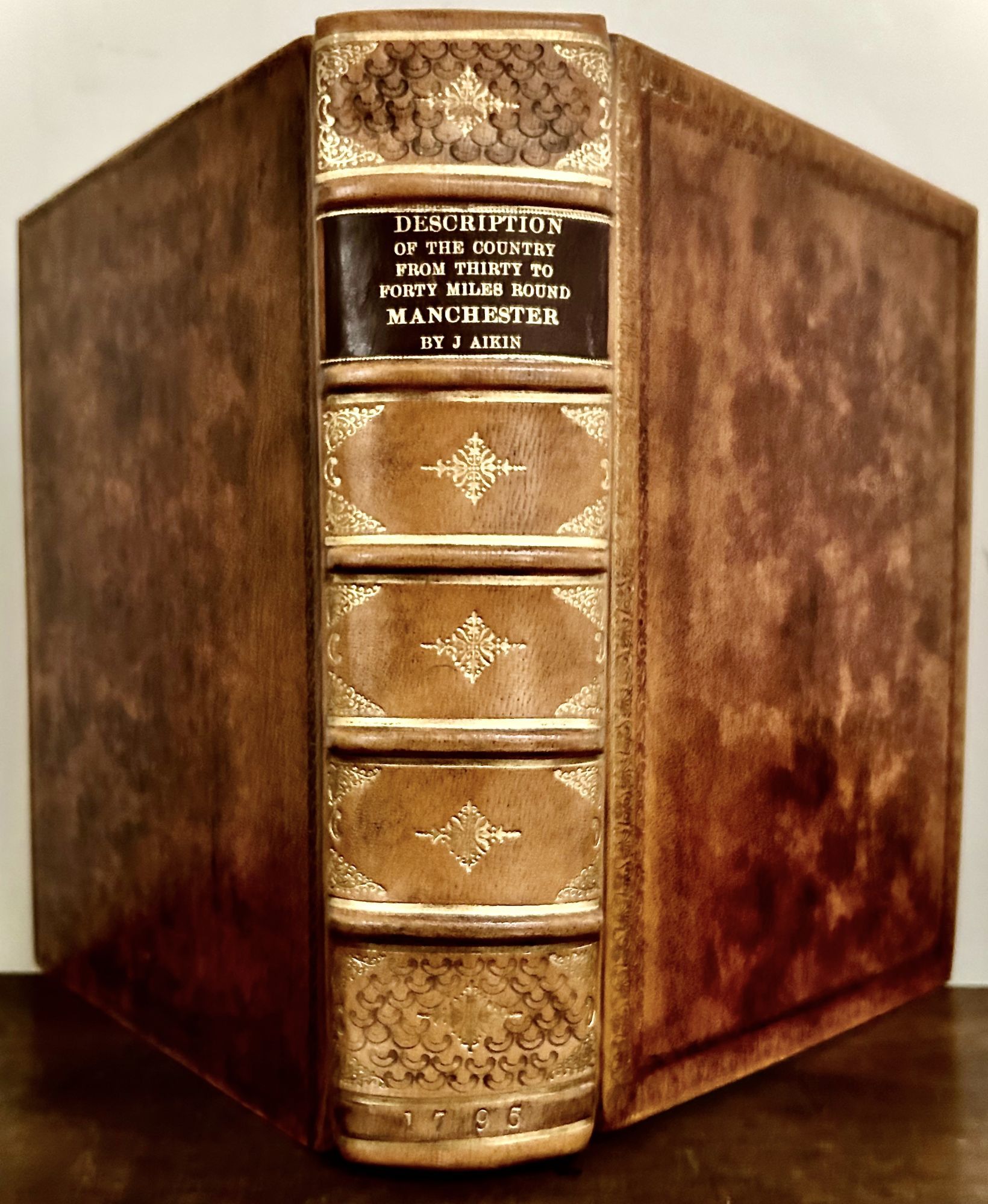 London: John Stockdale, 1795. First edition. leather_bound. Modern full brown calf. Fine. 624 pages. 30 x 23 cm. Engraved frontispiece and additional title, two immense folding engraved maps (including one hand-coloured map of country around Manchester, 43 engraved plates and 18 single-page maps and plans, list of subscribers includes Booksellers as a separate entity after the alphabetical list. Contains a section on canals in the area. Index. All interior plates with tissue guards, some of which slightly toned. Interior contents generally clean and fresh. LOWNDES, I, p.22. UPCOT. pps 462-465. Owner inscription free front endpaper. A large, very heavy tome weighing over eight pounds. Raised bands, spine panels richly gilt, black leather spine label printed in gilt with cover border panels in both blind and gilt arabesques.