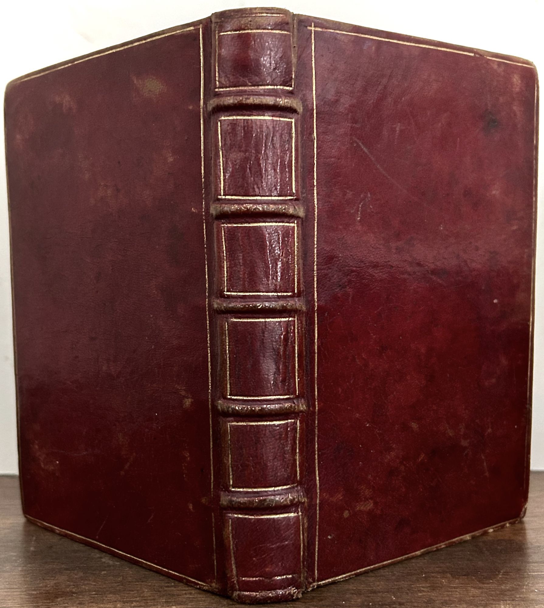Paris & Versailles: Chez l'Autheur, 1690. leather_bound. Later full brown calf. Aeg. Near fine. 260 pages. 18 x 12.4 cm. Later variant printed by Hansy. Dedication and with head-piece of sirens on p.210 revealing their breasts covered in later, our issue -- Second state headpiece on page 210, finely engraved throughout with ornamental borders, vignettes, head- & tail-pieces and pictorial initials. Exquisite calligraphic prayer book beautifully illustrated with charming decorations of flowers, birds et al. With no p.47 as correct p.223 is apparently numbered twice. BONACINI p.308. COHEN-de RICCI 487. Unsigned gilt armorial bookplate, inner dentelles and multi colored floral endpapers.