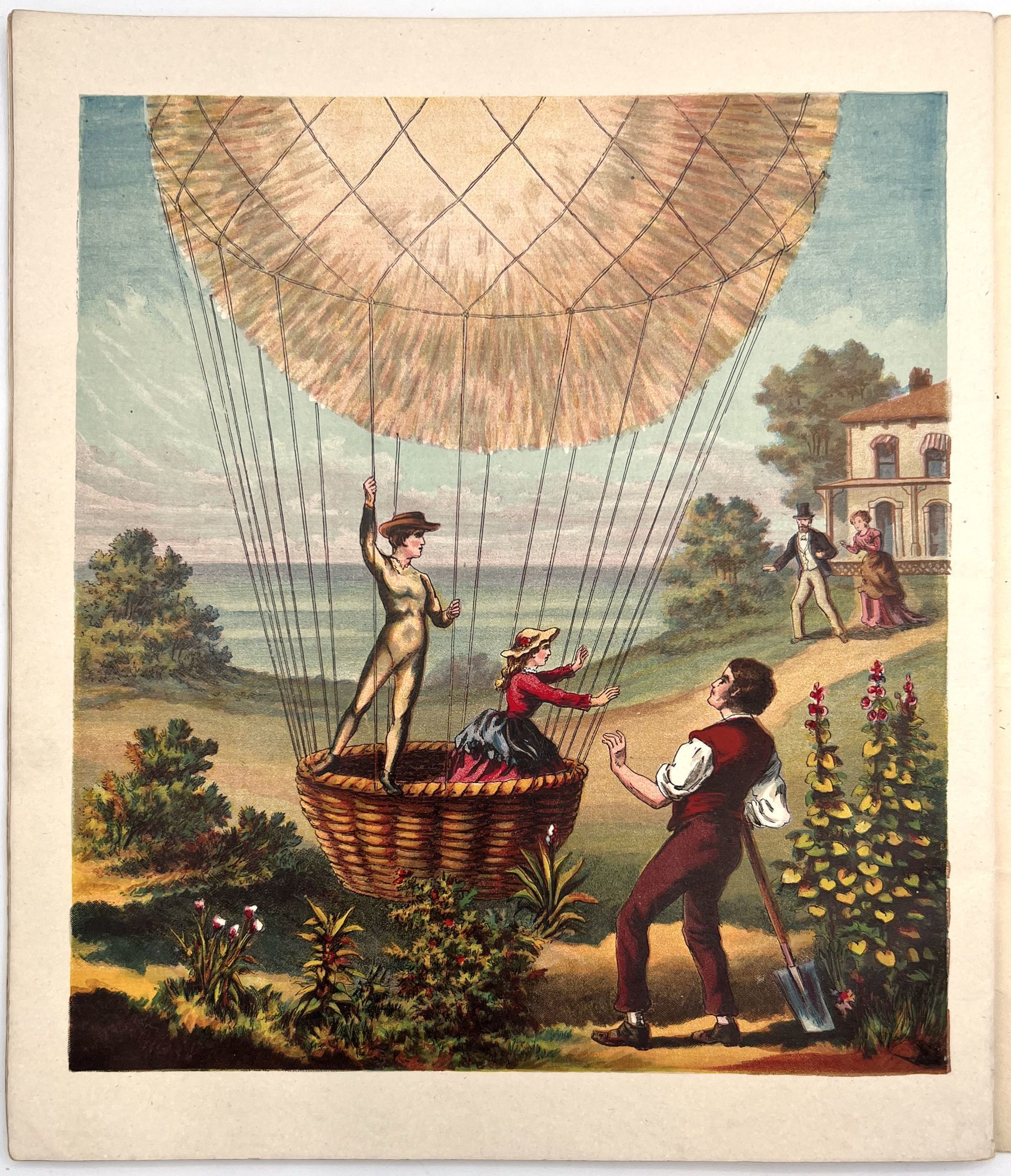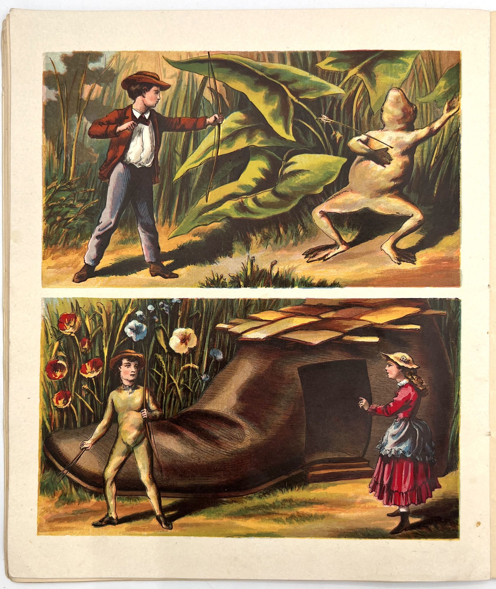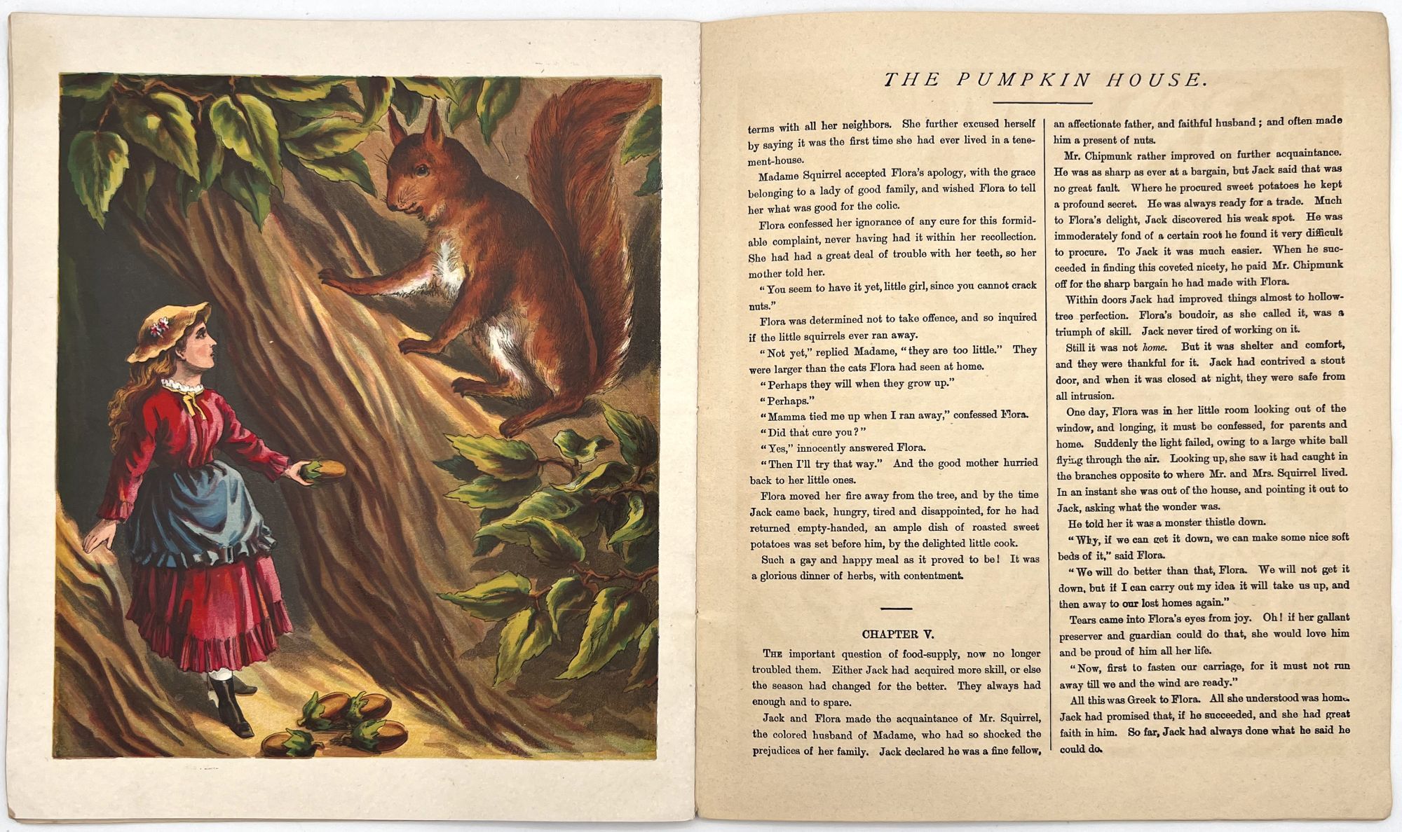 New York, New York: McLoughlin Bros, 1876. Very good. Some chipping to extremities, a couple short tears, minor toning and dust soiling. Corner chip upper cover. Small area of missing surface litho at base of cover. Color illustrations saturated and bright.. A winsome children's story by McLoughlin charting the adventures of Little Flora and Jack, who become miniaturized and live in a pumpkin and a shoe before flying back to the real world in a hot air balloon. Includes seven (7) bright full-page chromolithographed illustrations.