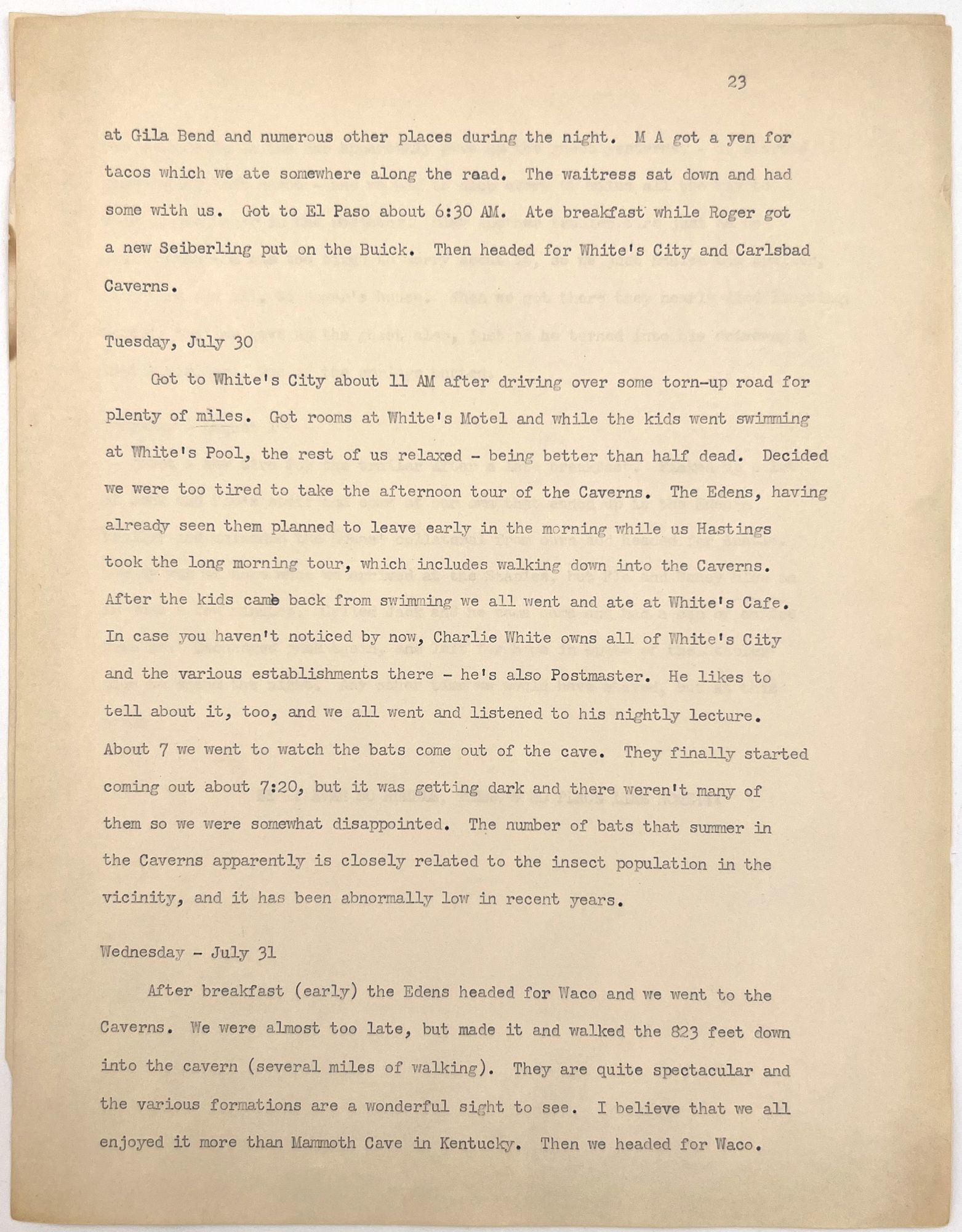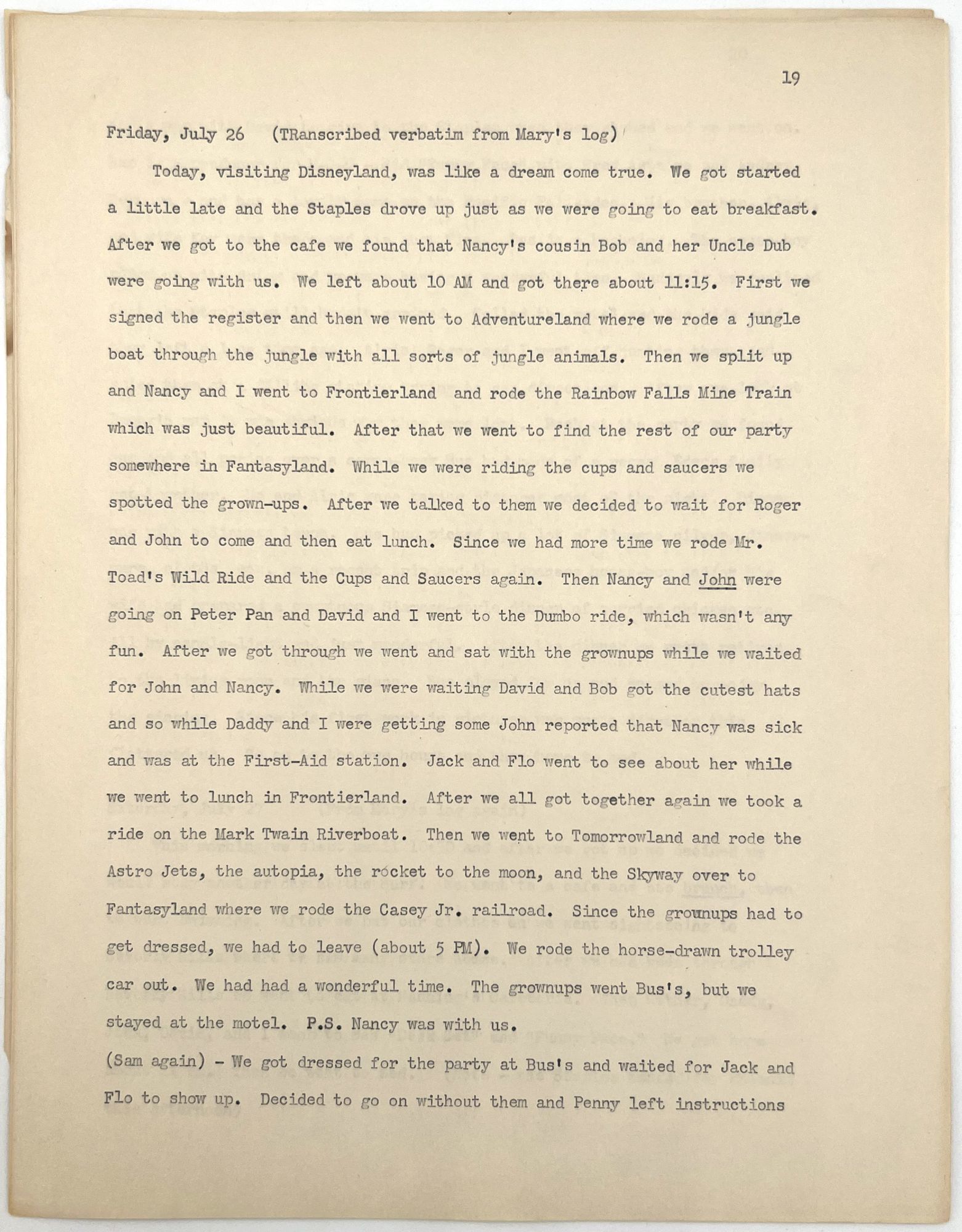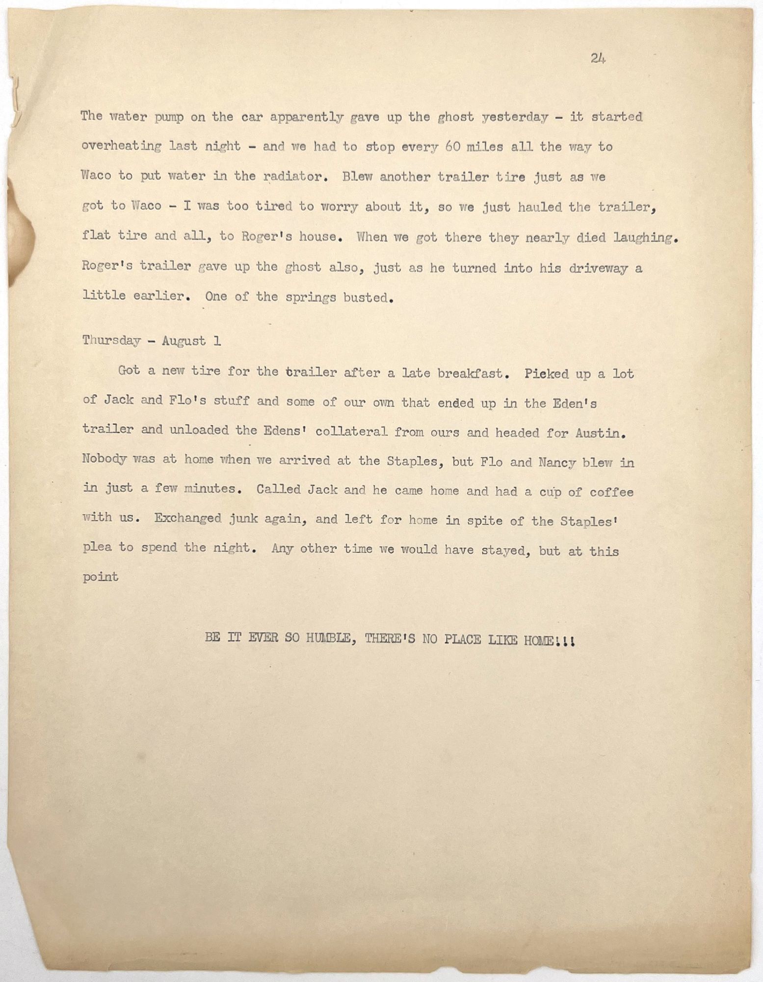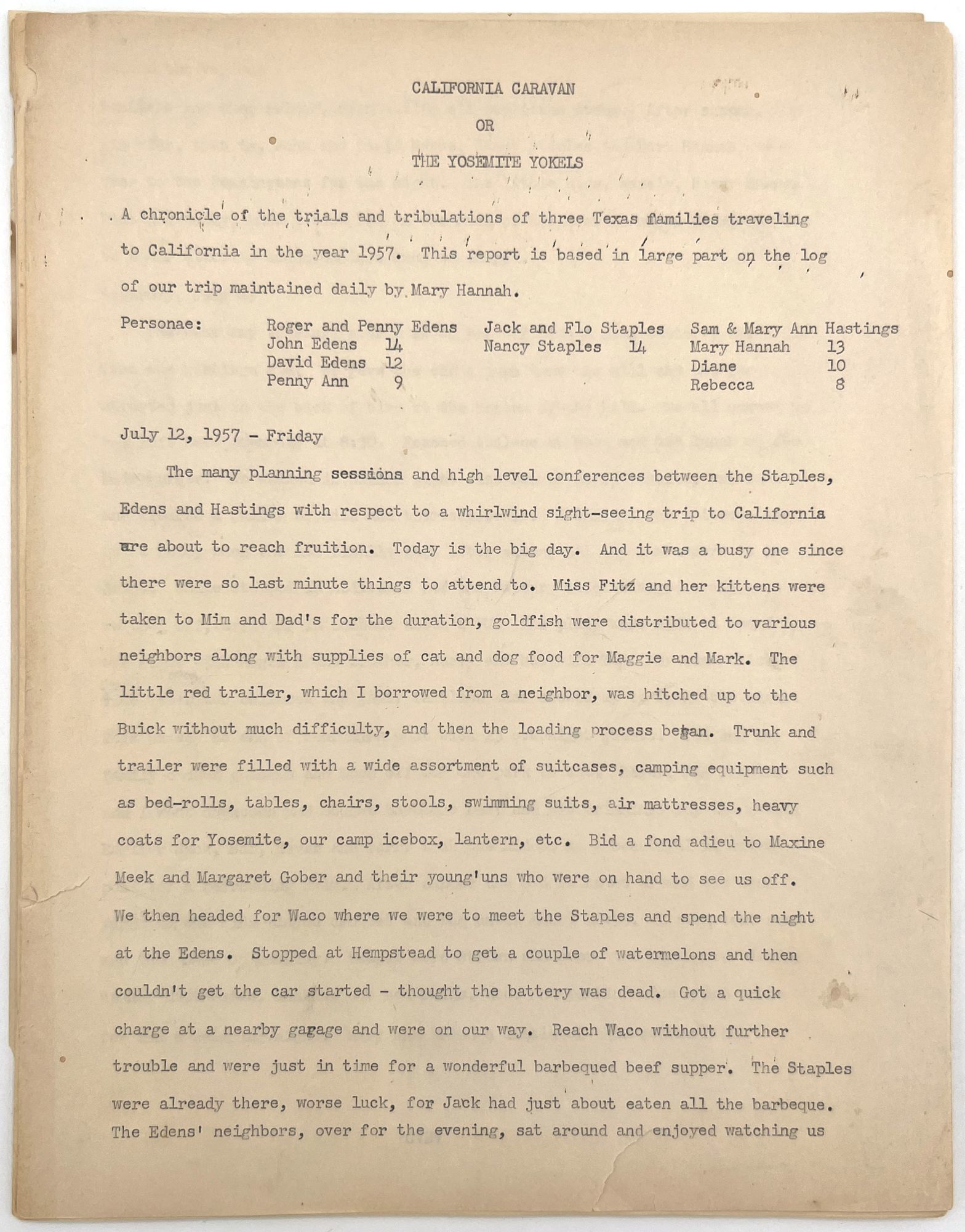 Twenty-four (24) pages of typescript, unbound. Measures 10.75" by 8.5", foliated. An excursion including various friends and family numbering 23 individuals. Chronicled several times each day. Includes camping trailers, sleeping under the stars, individual and group mishaps. Visits to the Grand Canyon Yosemite, a visit to the Sierra Club. Finally they arrive at Disneyland and describe all of the attractions. After only a day they are off to site seeing again on a slightly different route while heading back to Texas.
