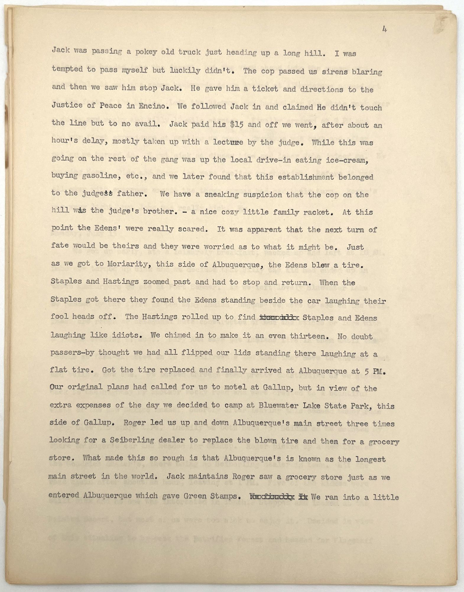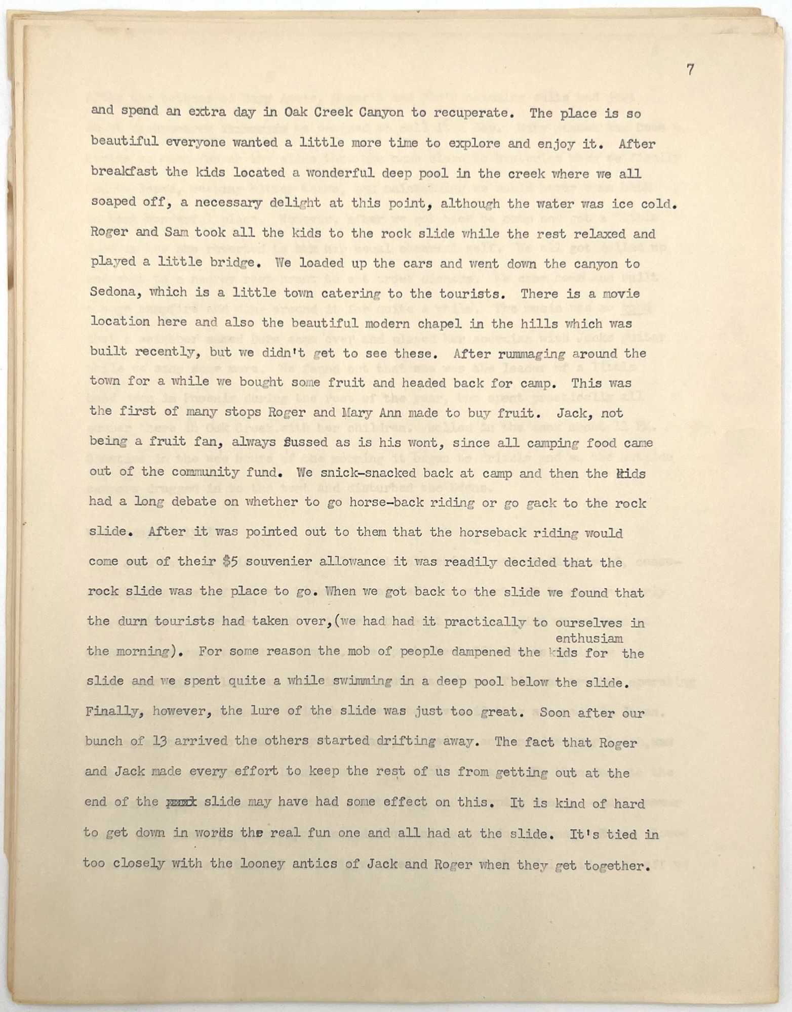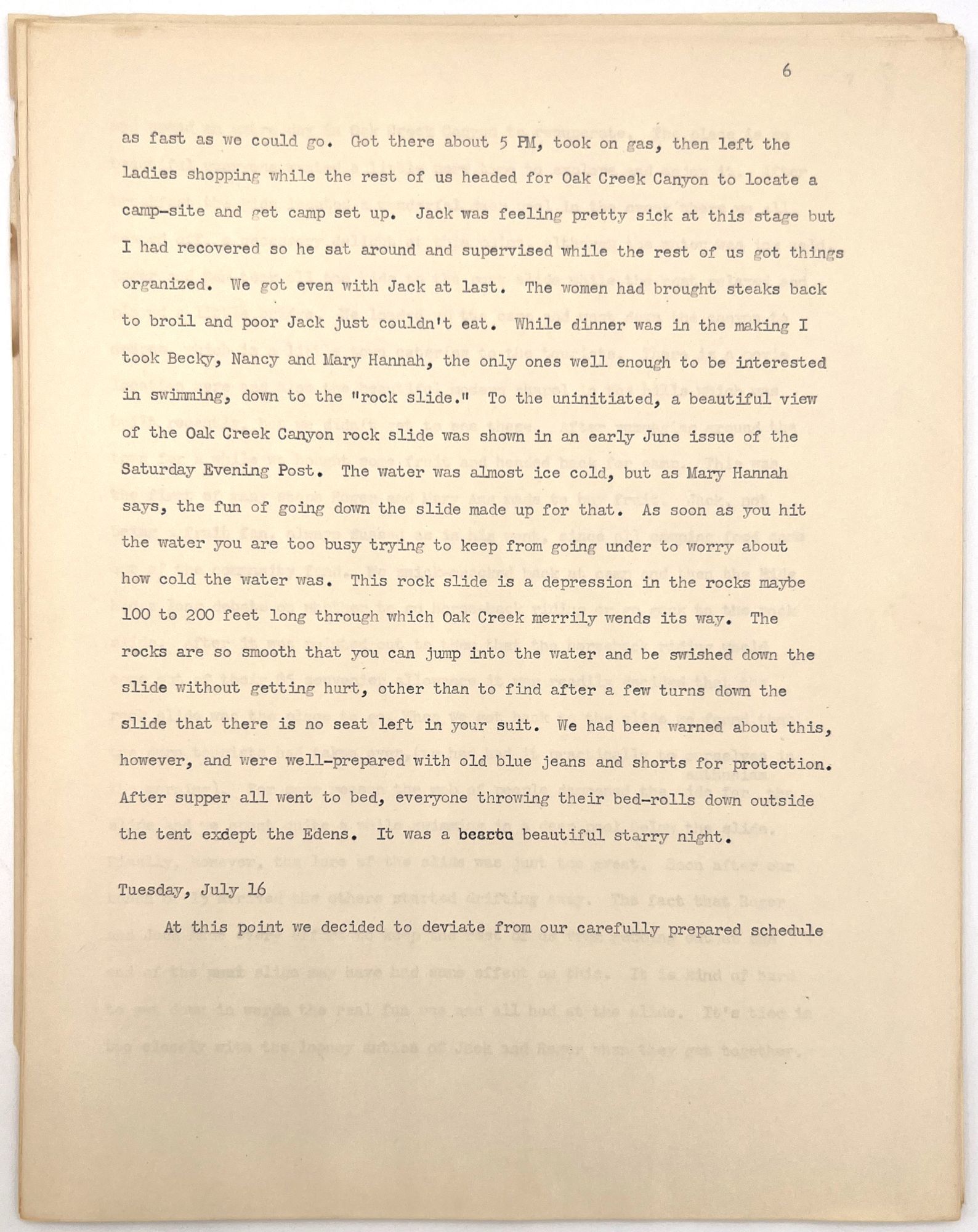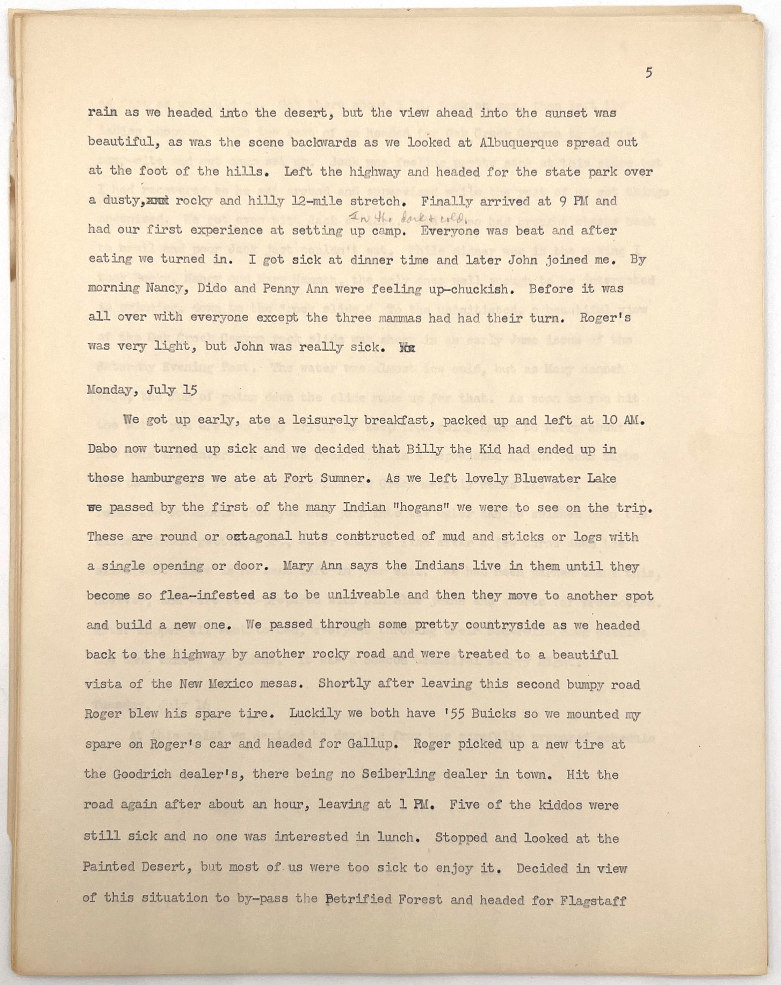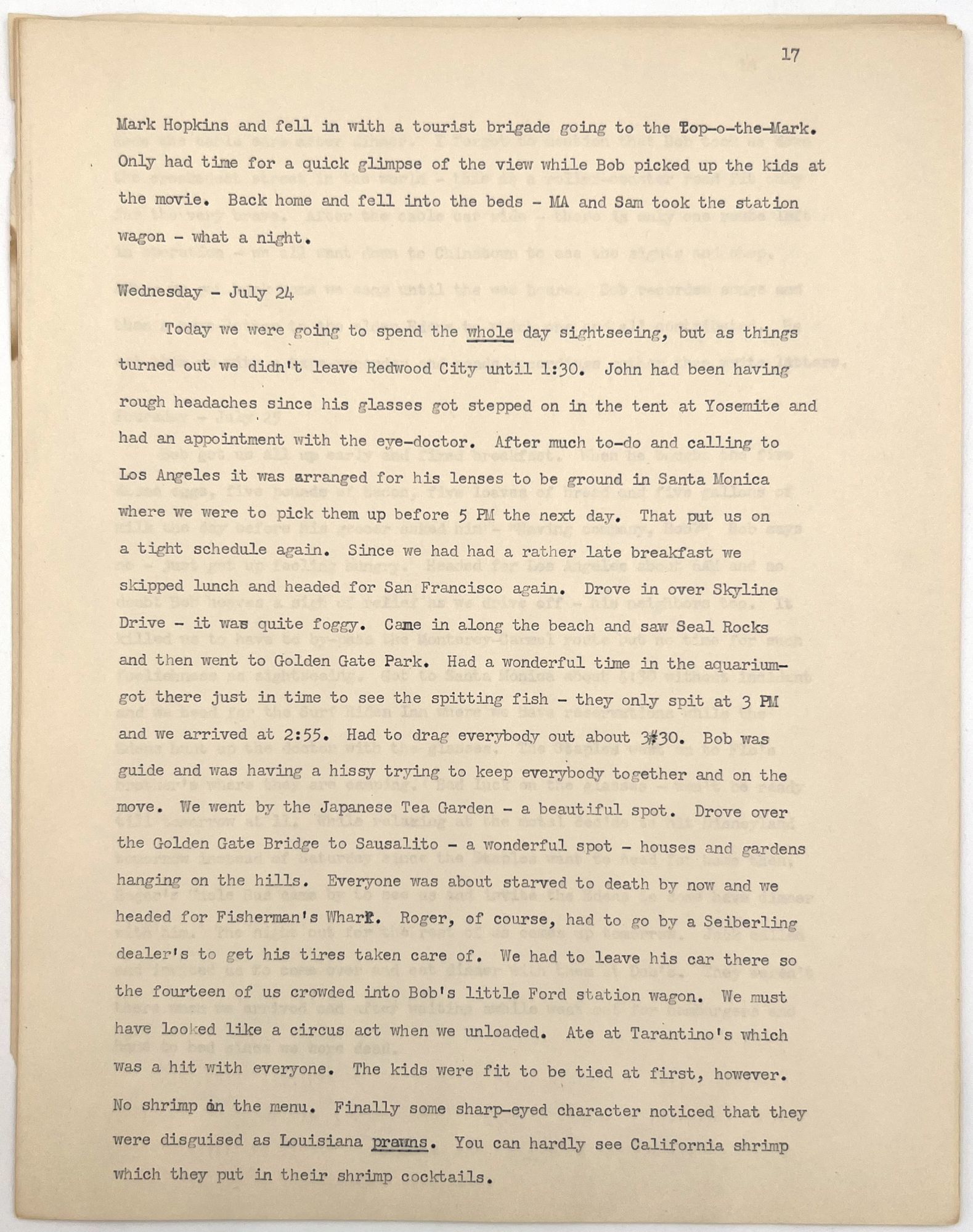 Twenty-four (24) pages of typescript, unbound. Measures 10.75" by 8.5", foliated. An excursion including various friends and family numbering 23 individuals. Chronicled several times each day. Includes camping trailers, sleeping under the stars, individual and group mishaps. Visits to the Grand Canyon Yosemite, a visit to the Sierra Club. Finally they arrive at Disneyland and describe all of the attractions. After only a day they are off to site seeing again on a slightly different route while heading back to Texas.