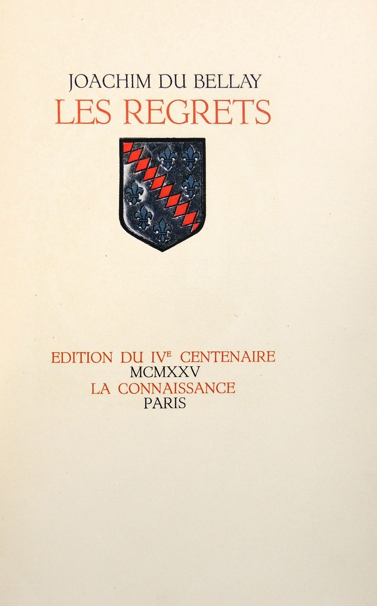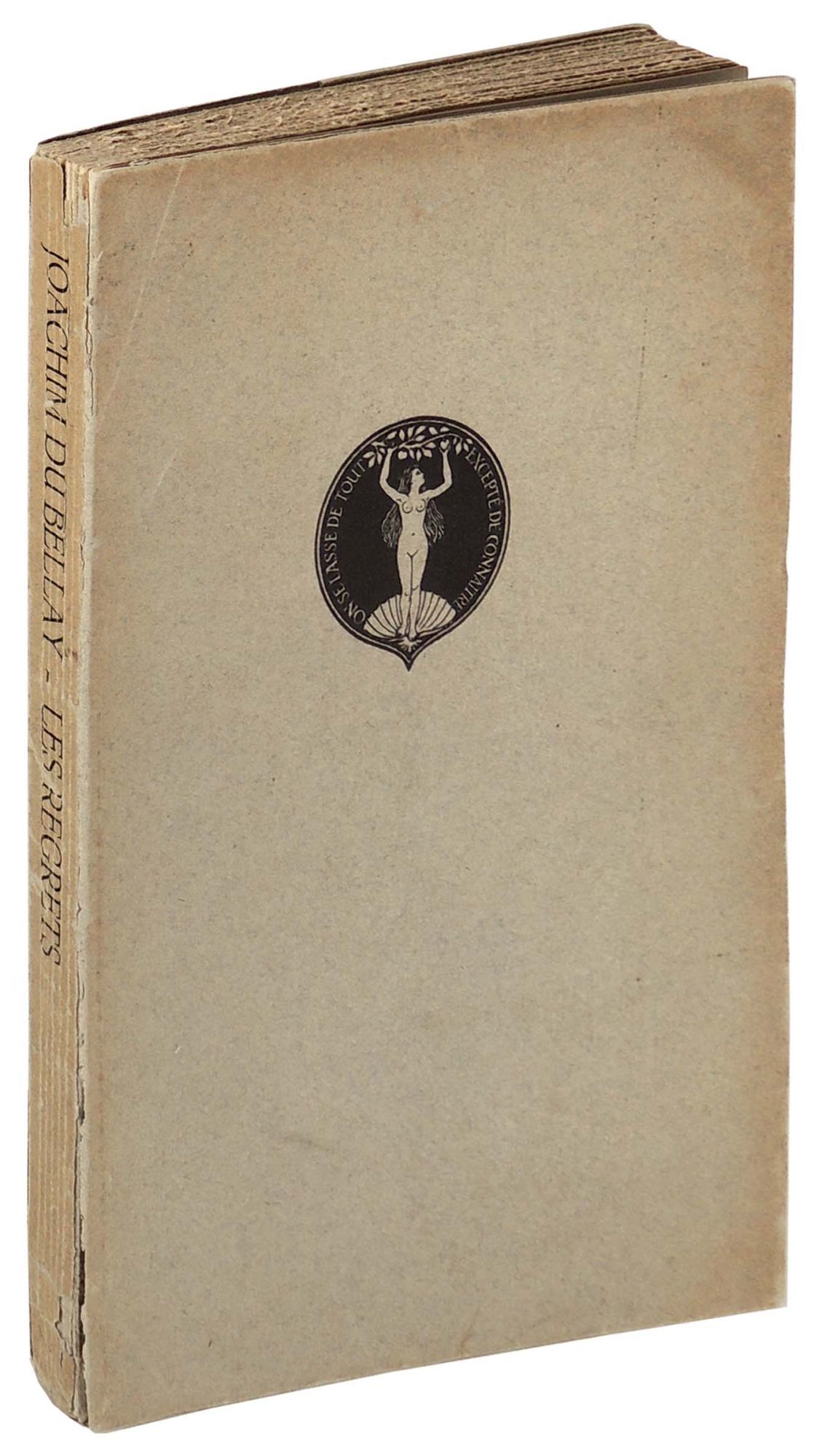 Paris: Edition du IVe Centenaire, La Connaissance, 1925. Paperback. Very Good. Paperback. 1 of 50 exemplaires hors-commerce (non-numerotés) of a total edition of 380. Association Copy marked as "Exemplaire justifié: Imprimé pour Robert Steiner" - the engraver of the frontispiece woodcut portrait of Du Bellay. Includes an illuminated coat-of-arms on the title page. Bound in grey paper wrappers with black title to spine panel and illustration of Venus in a shell to the front wrapper. Heavy chipping to paper along spine, browning to edges of wrappers and spine panel. Printed in red, blue, and black inks in Maastricht, Holland. Bumping to foot of spine and to corresponding page edges. Clean, bright interior with light offsetting on several pages. A lovely edition of du Bellay's poetry. IN FRENCH. 122 pages. PRI/020923.