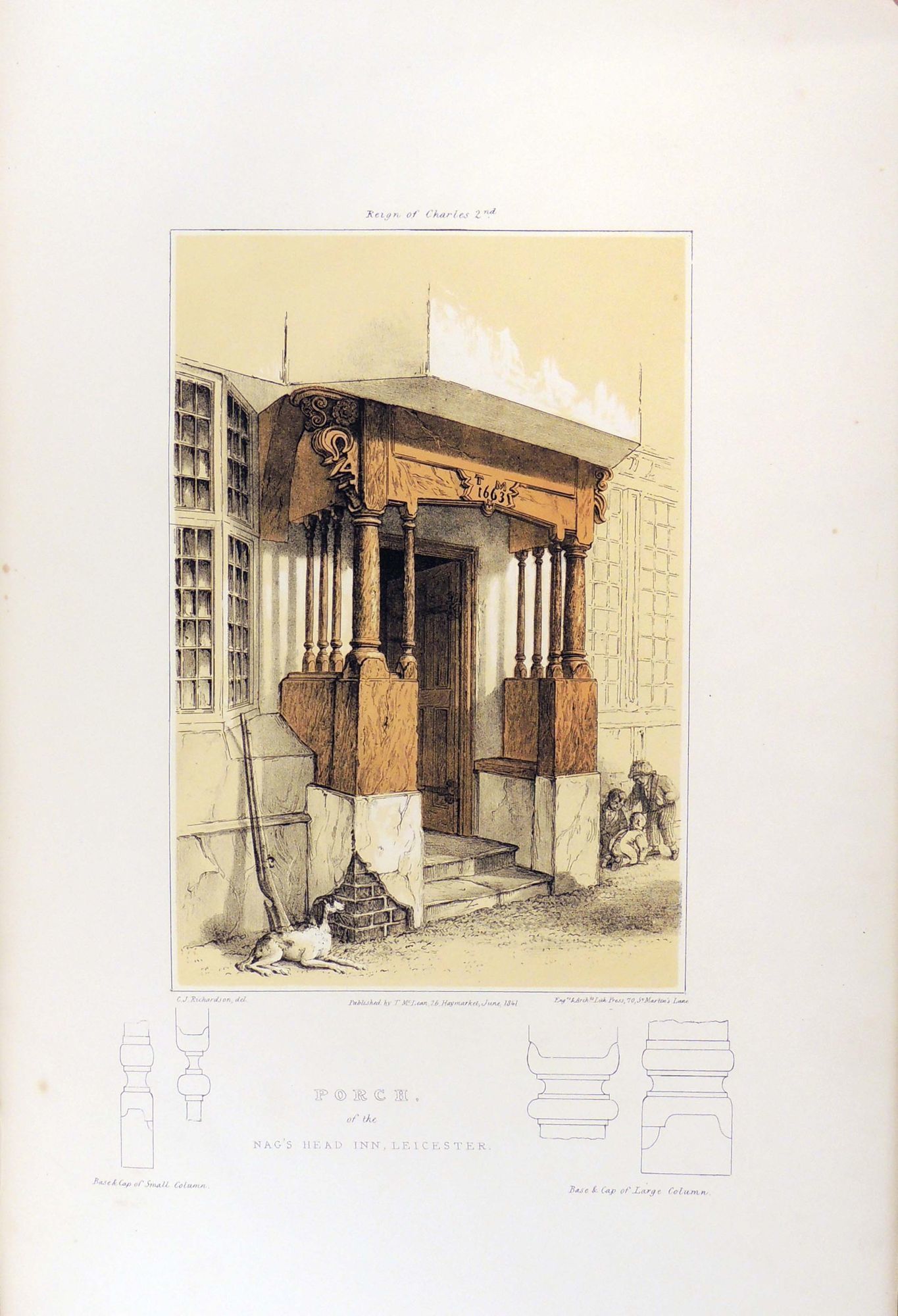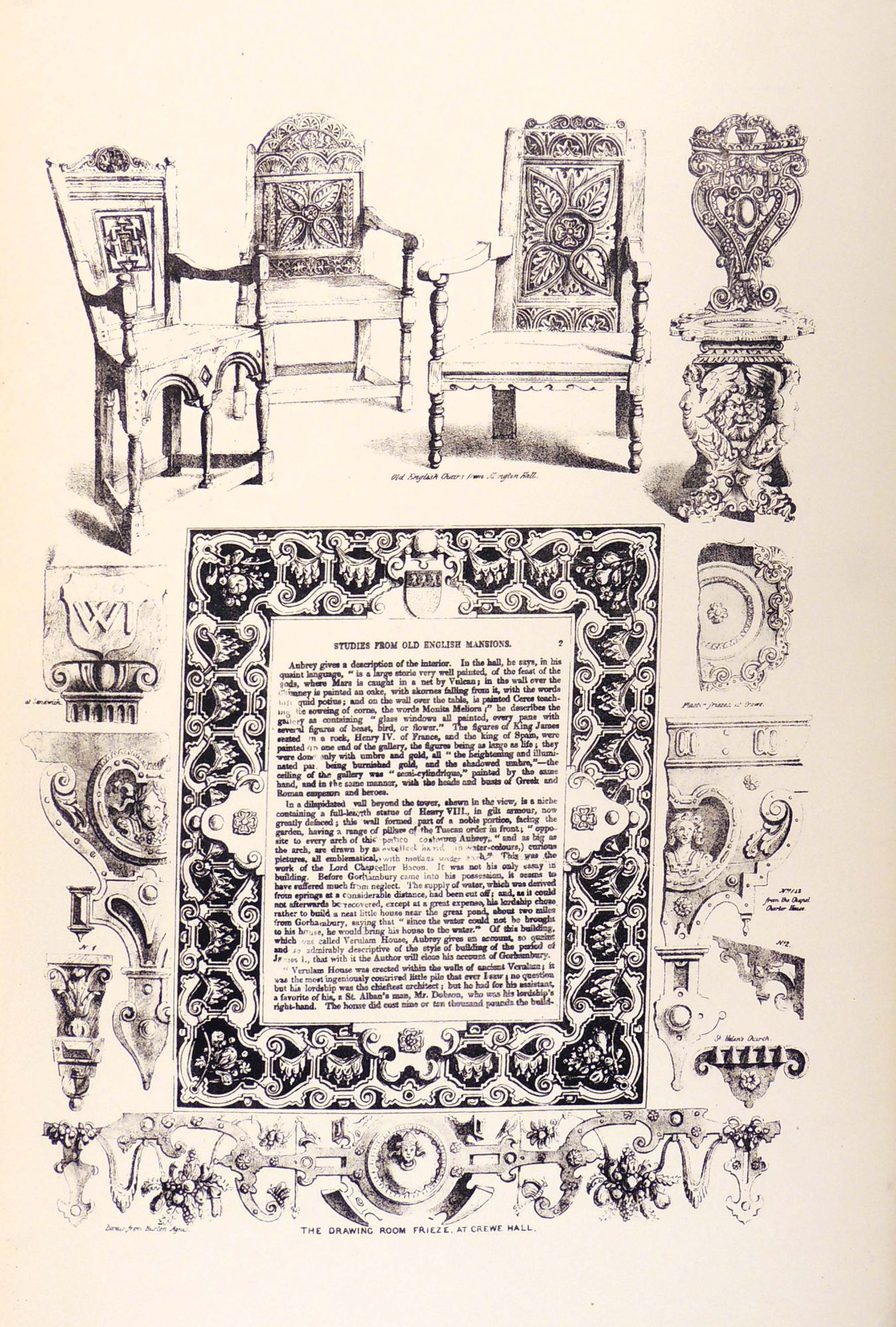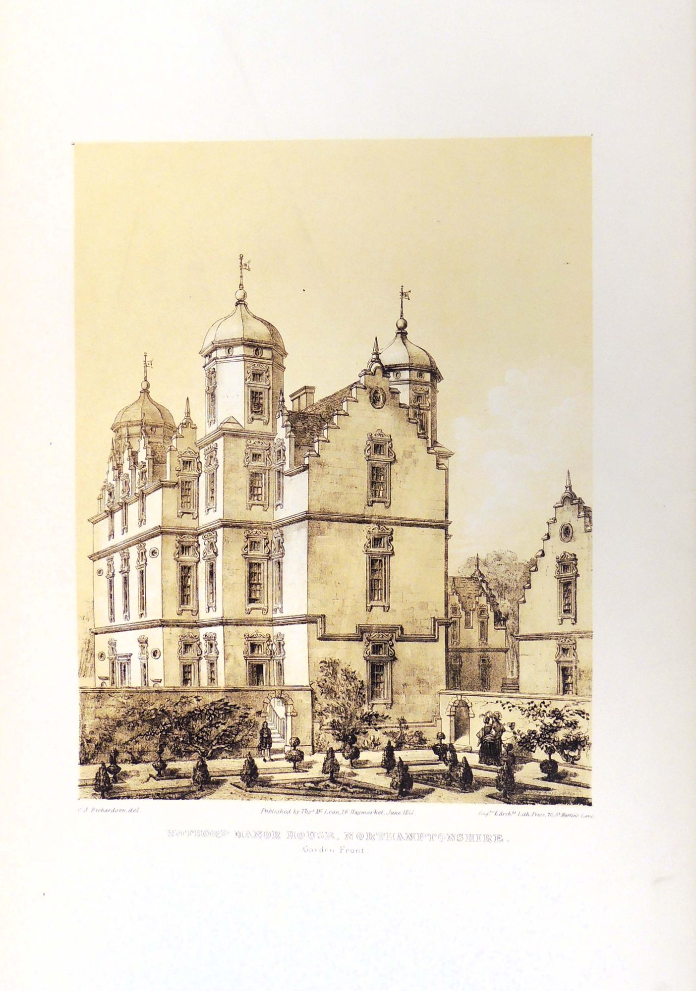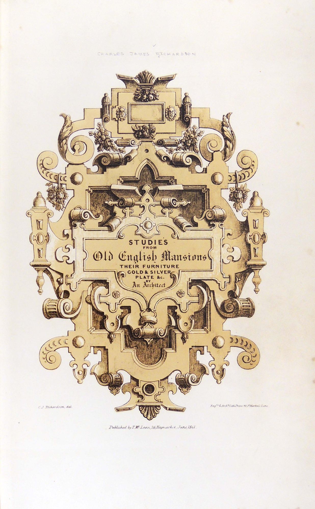 London: T. McLean, 1848. Hardcover. Very Good. Hardcover. English architect Charles James Richardson (1788 - 1875) studied under Sir John Soane and designed the Earl of Harrington's mansion in Kensington Palace Gardens. He also conducted multiple design studies while traveling around England including this impressive set which features drawings of architectural elements such as stairways, entrances, ceilings, and ironwork, as well as decorative pieces of furniture, vases, silverwork, etc. from multiple English Mansions. Some of the mansions were studied while in disrepair or partial ruin. Includes the Gorhamburg House in Hertfordshire, Montacute House in Somersetshire, Old Town Hall in Nantwich, Charlton House in Wiltshire, and many more.