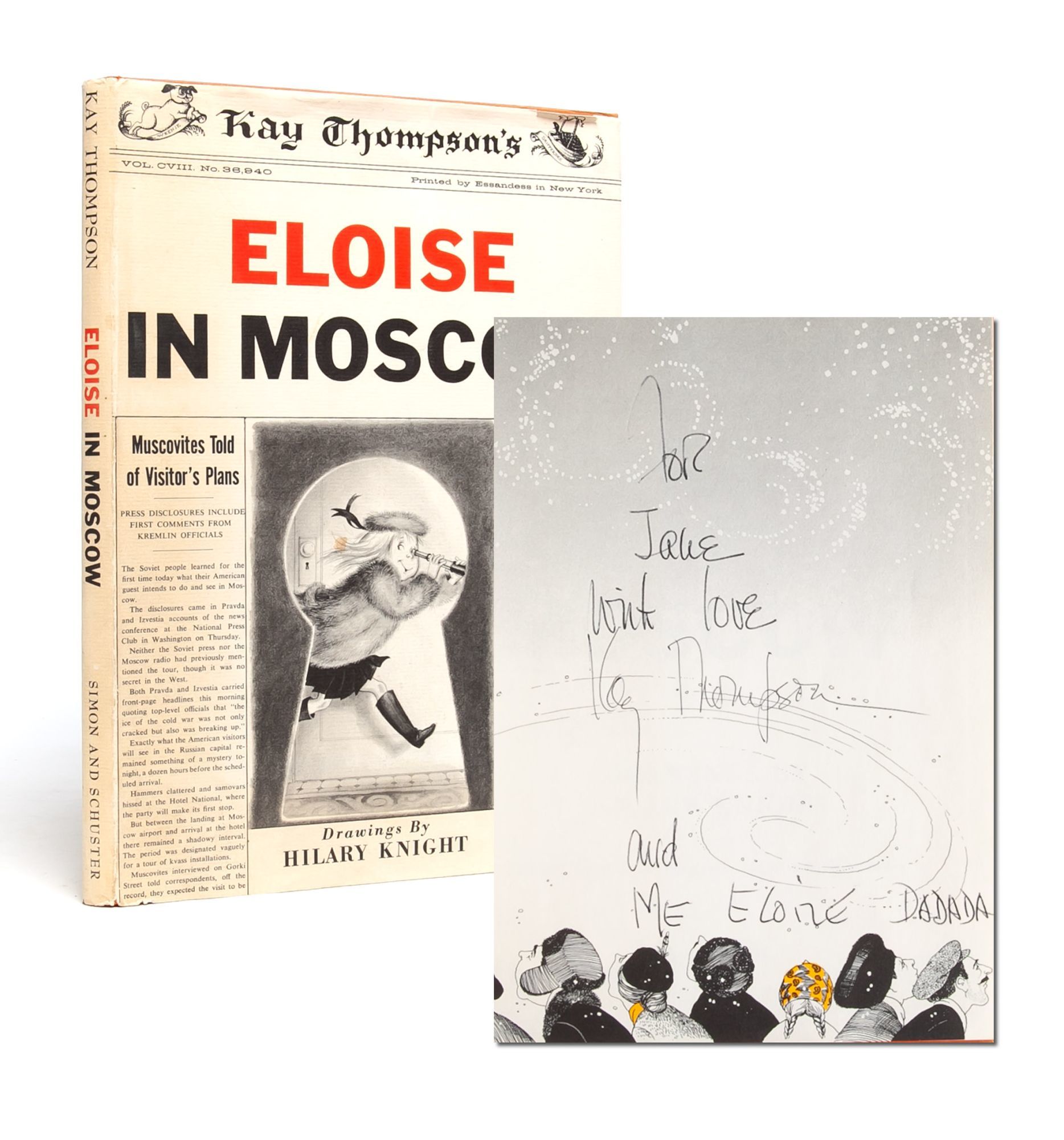 New York: Simon & Schuster, 1959. First edition. Near Fine/Near Fine. A Near Fine book in like dust jacket. Book with a small bump to the lower board and the spine a bit rolled. In a Near Fine dust jacket with a few professionally repaired tears. Inscribed by the author: "For Jane with love Kay Thompson and me Eloise Dadada." A pleasing copy of this children's classic, which finds the intrepid Eloise away from the Plaza Hotel on an international adventure.