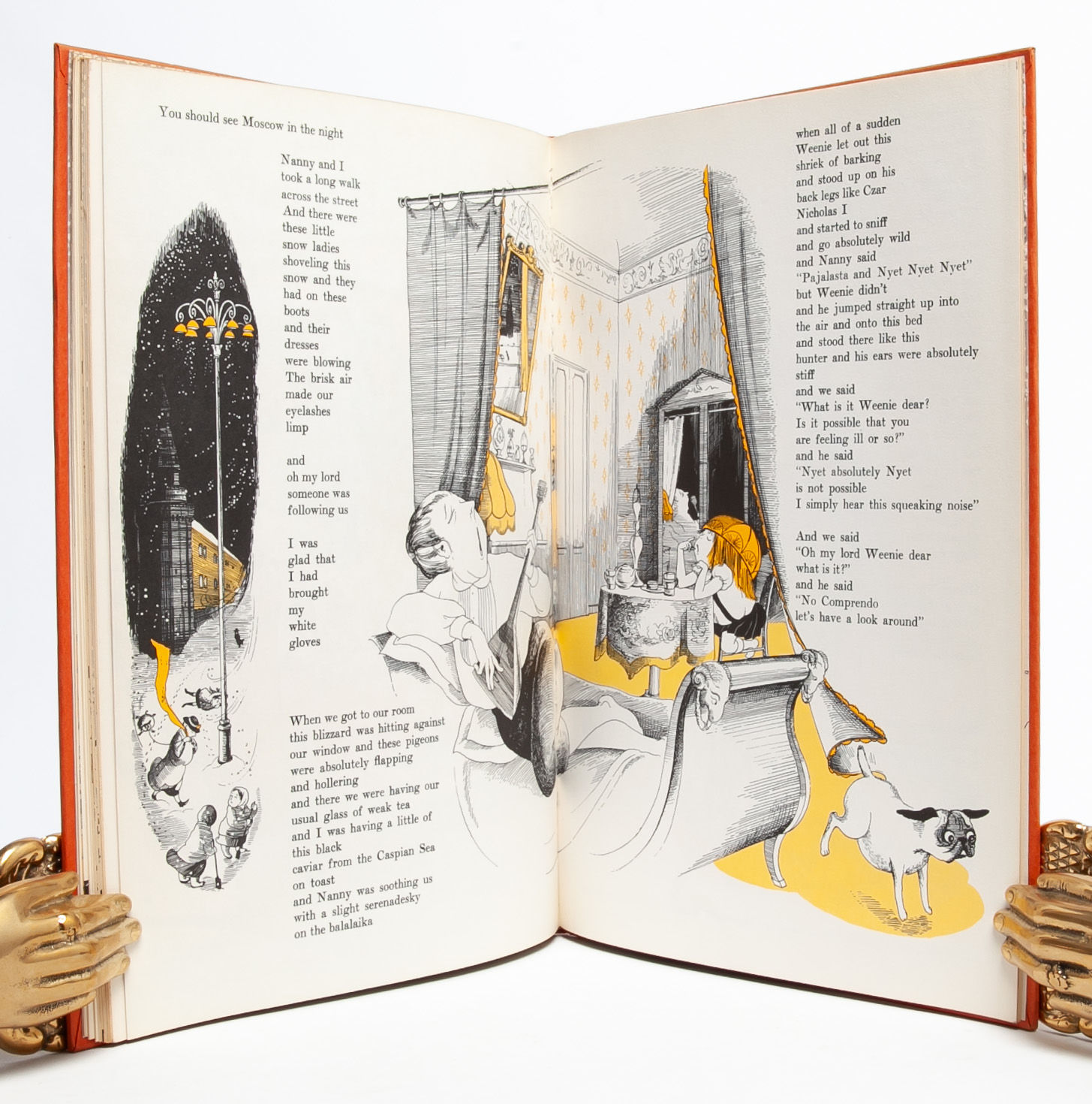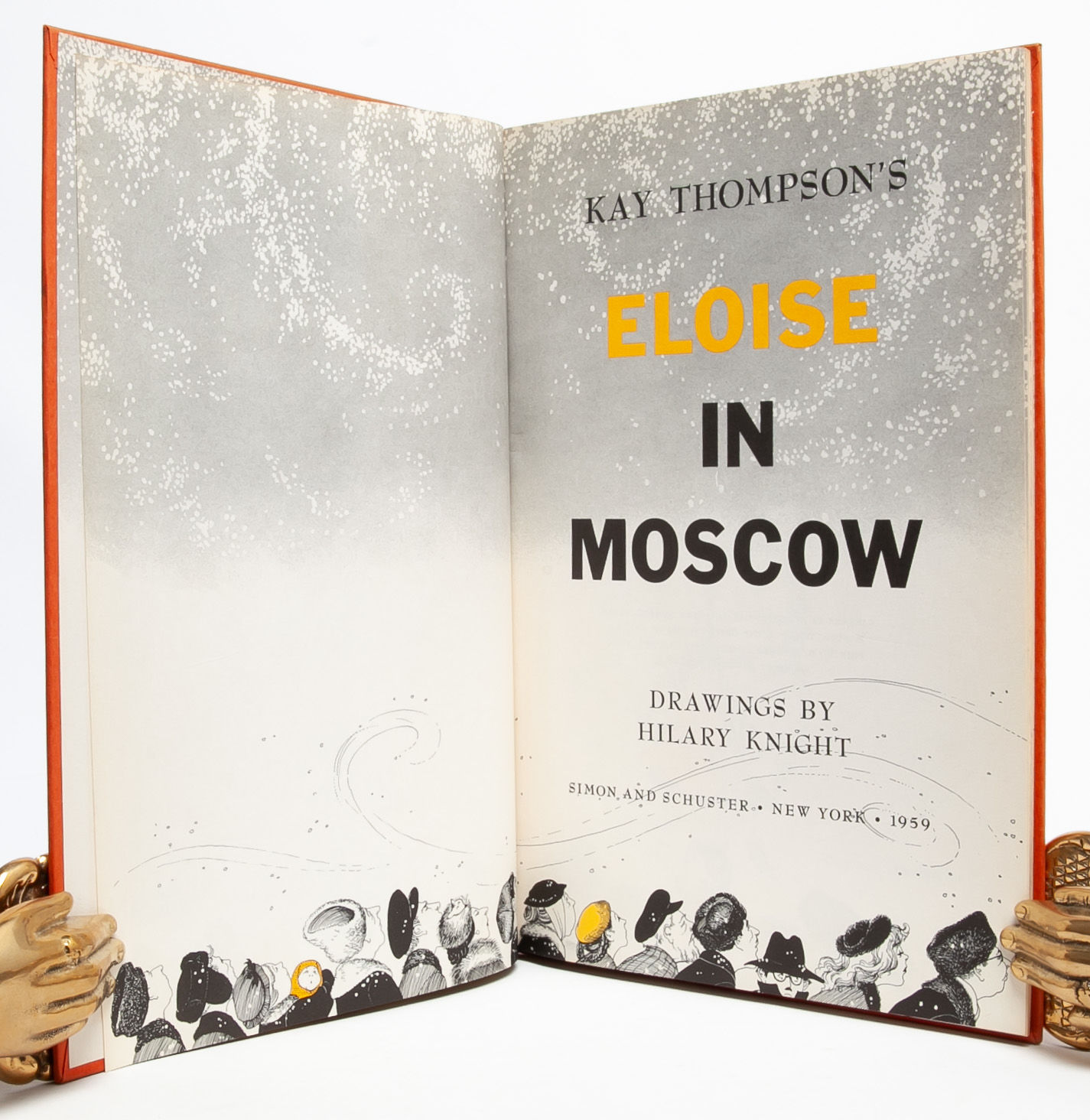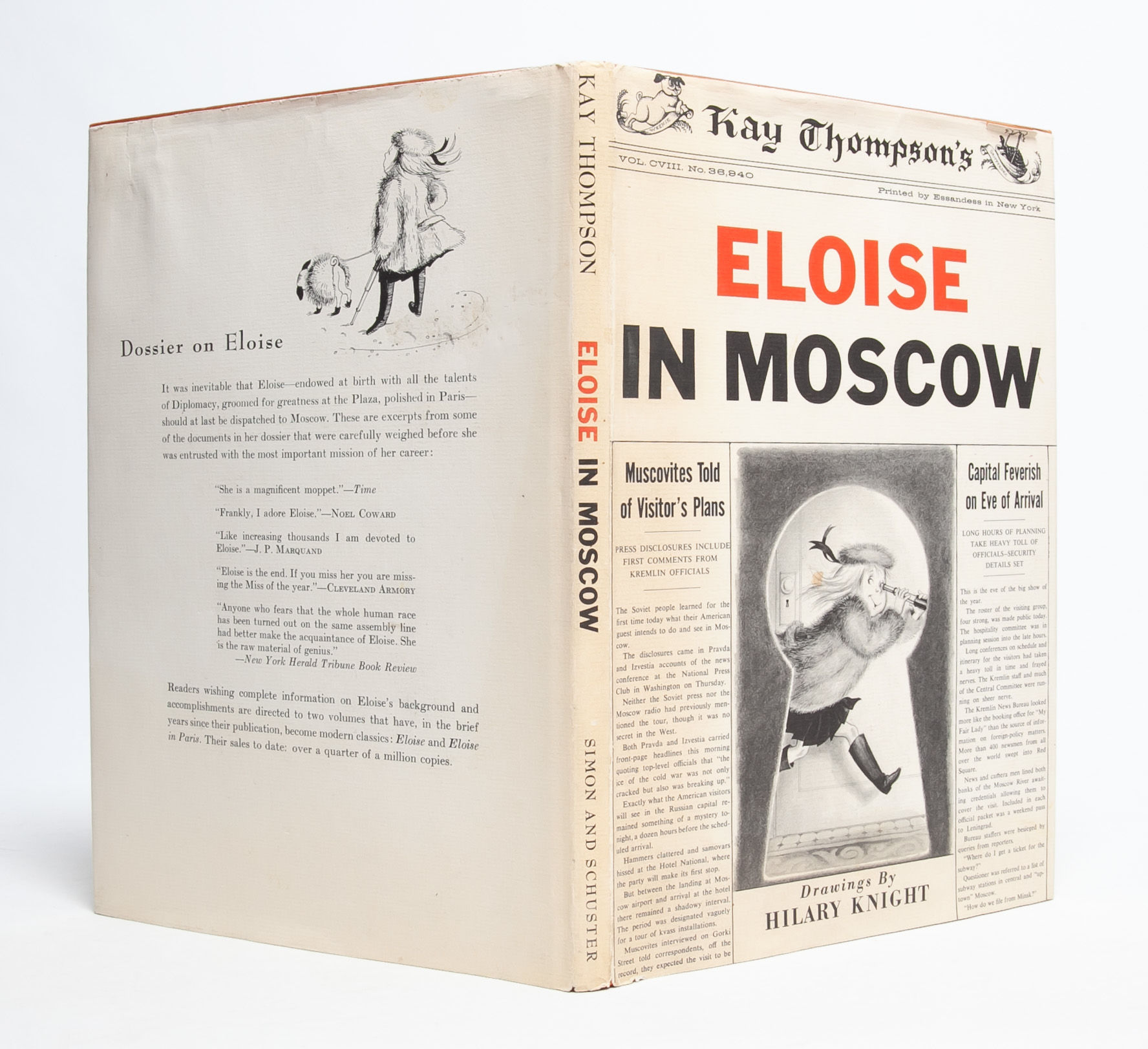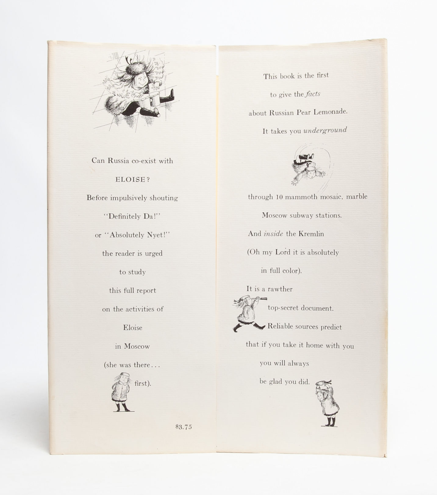 Eloise and Nanny discover that "not everyone in Moscow is a diplomat" and a host of other revelations, such as the "rawther deep" voices of Russian pigeons. This title in the Eloise series was published in 1959 at the height of the Cold War when tensions between the USSR and USA were outright hostile and the threat of mutually assured destruction reassured no one. Eloise brings her disarming candor to Moscow where despite her admission that "I could tell you a lot but I am only 6," we do in fact learn and laugh with this precocious 6 year old. Near Fine in Near Fine dust jacket.