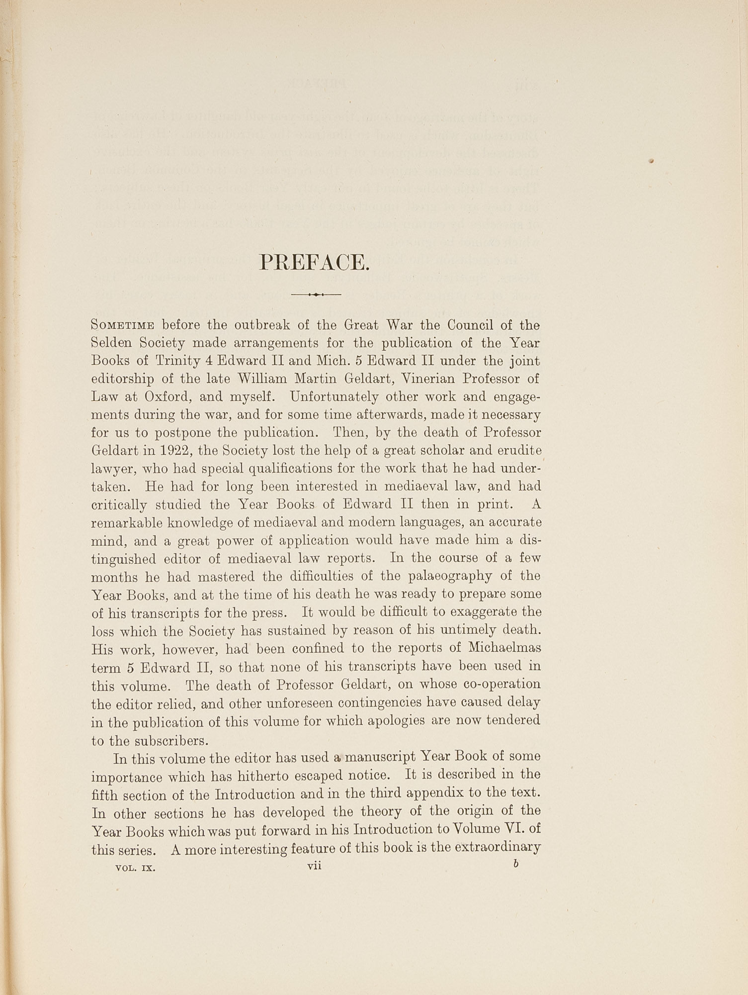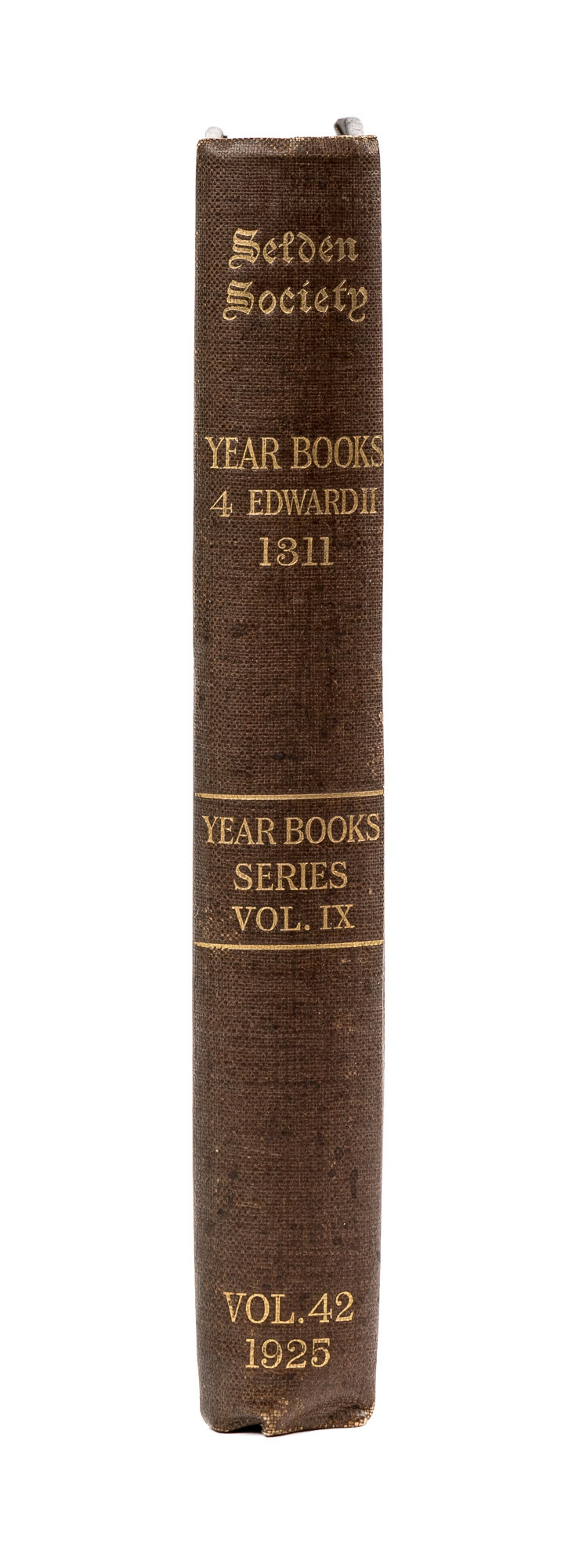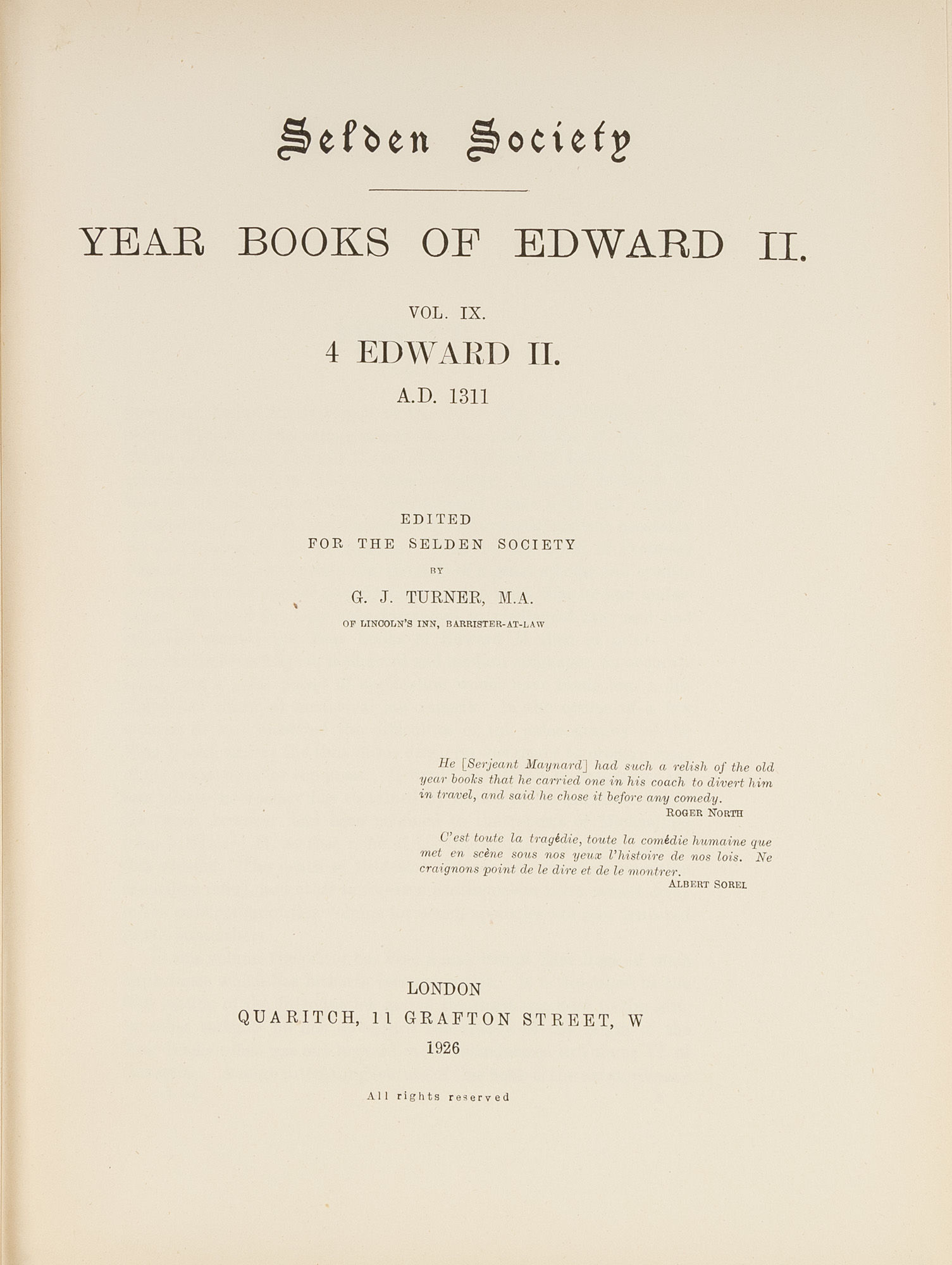1926. Turner, G.J. (Editor). Year Books of Edward II. Vol. IX. 4 Edward II. A.D. 1311. The Publications of the Selden Society Series, volume 42 for 1925. London: Bernard Quaritch, 1926. xciv, 244 pp. Hardcover, publisher's blue cloth, gilt spine stamped, moderate shelf wear. Top edge gilt, deckled fore and bottom edges. Some pages uncut, interior clean and bright. $50. * First edition. This volume contains reports of Trinity term, 4 Edord II, together with a few undated reports of earlier terms.