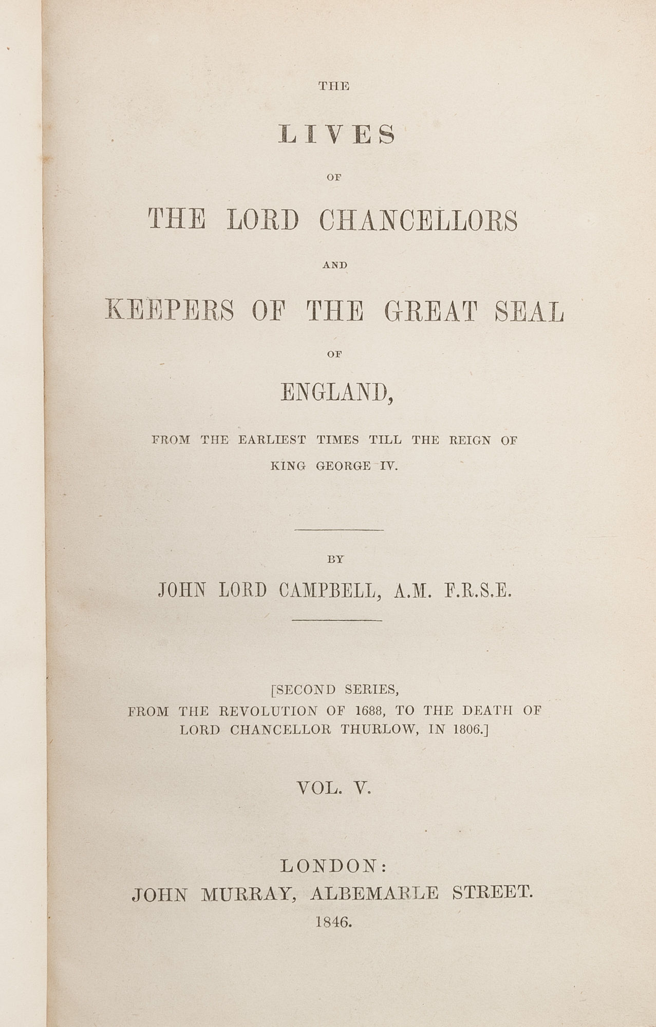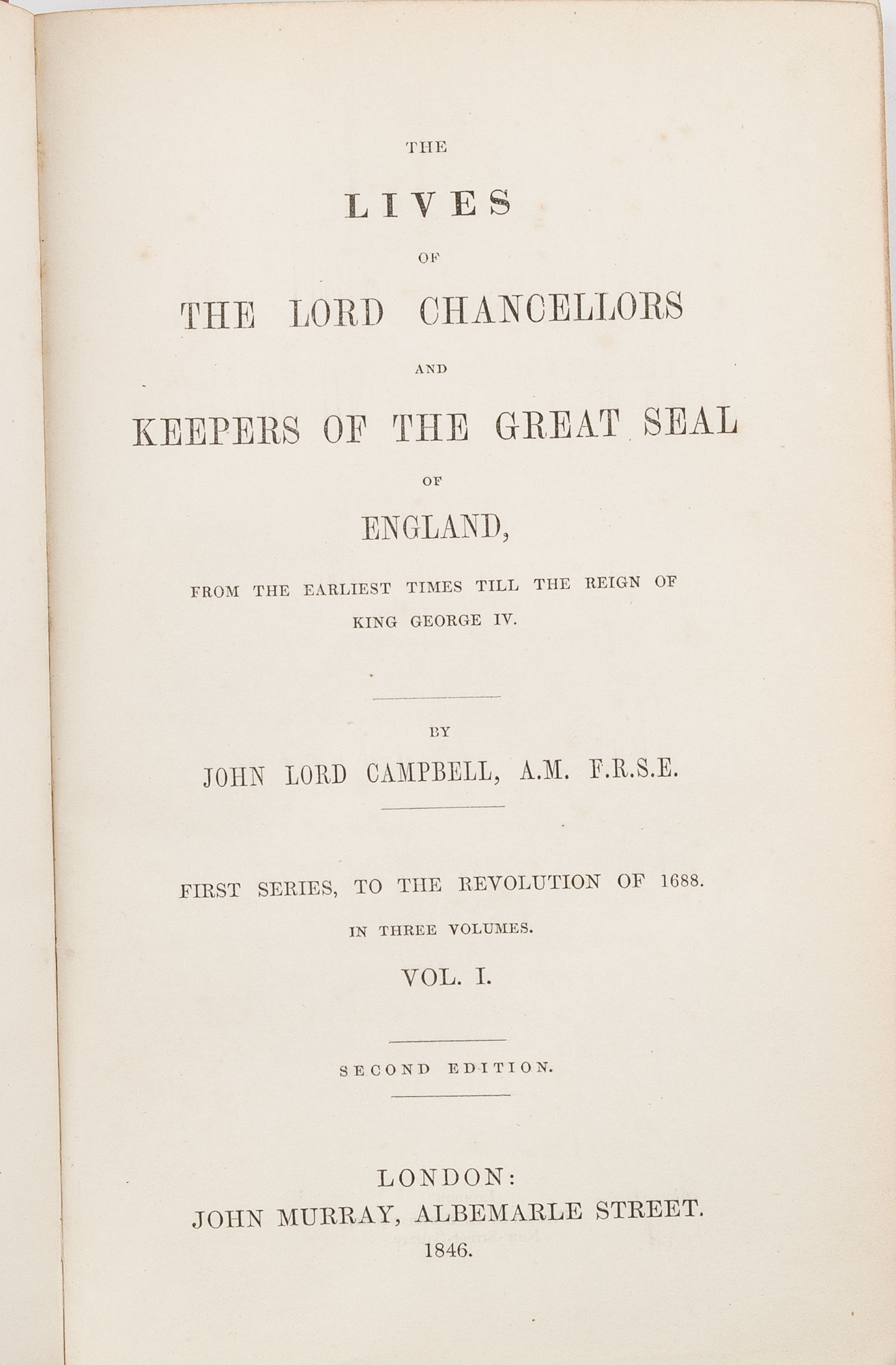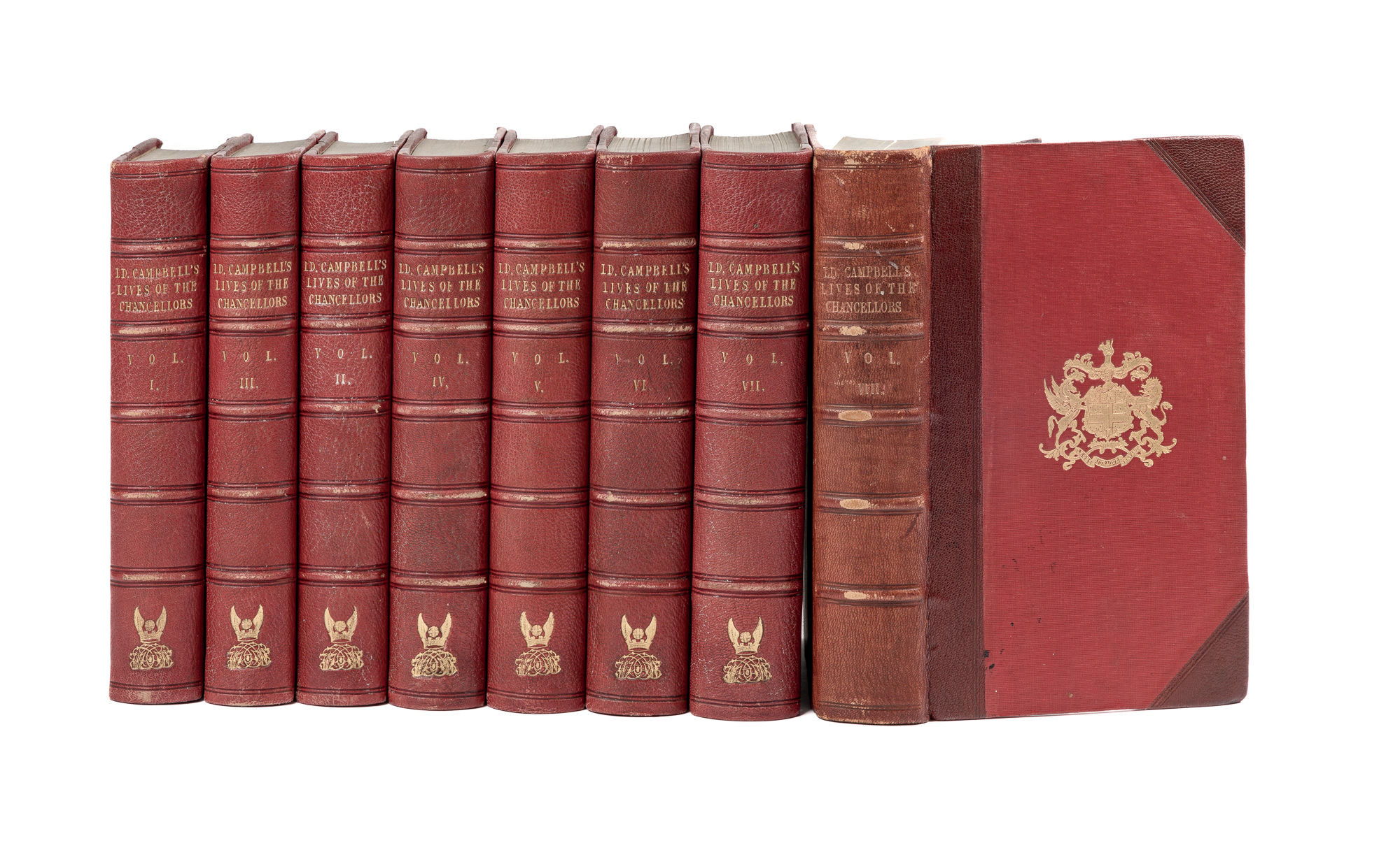 1848. London: John Murray, 1848-1869. 8 vols.. London: John Murray, 1848-1869. 8 vols. A Handsomely Bound Copy of Campbell's Lives of the Lord Chancellors Campbell, John, 1st Baron Campbell [1779-1861]. The Lives of the Lord Chancellors and Keepers of the Great Seal of England, from the Earliest Times Till the Reign of King George IV. London: John Murray, 1846-1869. 8 volumes. Complete set. Octavo (8-1/2" x 5-1/2"). Three-quarter red morocco over cloth, blind rules to boards, raised bands and gilt titles to spines, all edges marbled, marbled endpapers. Gilt circular crest on front boards. Prize bindings awarded by The Law Society with presentation certificate on front pastedown of volume one. Light rubbing to extremities, minor nicks and finger smudges to a few volumes, moderate toning to interiors. A handsome set. $750. * Volumes 1-5: second edition; Volumes 6-8, third edition. This classic study, which went through several editions, is an incomparable storehouse of legal history and anecdote. Volume VIII is a continuation volume with an index to the entire set. Sweet & Maxwell, A Legal Bibliography of the British Commonwealth 2:54.