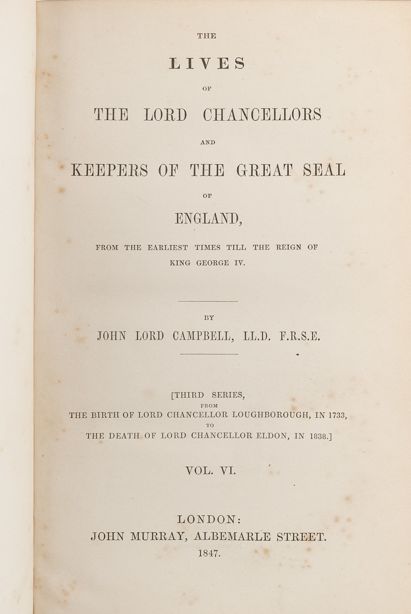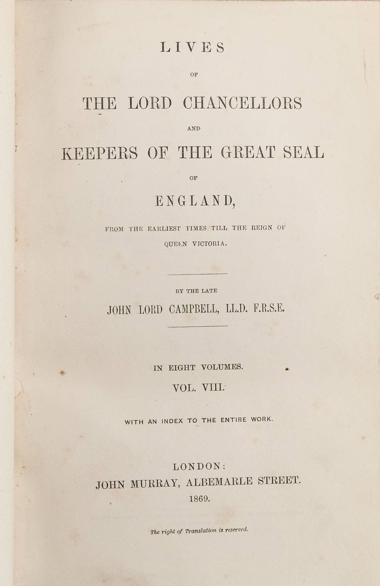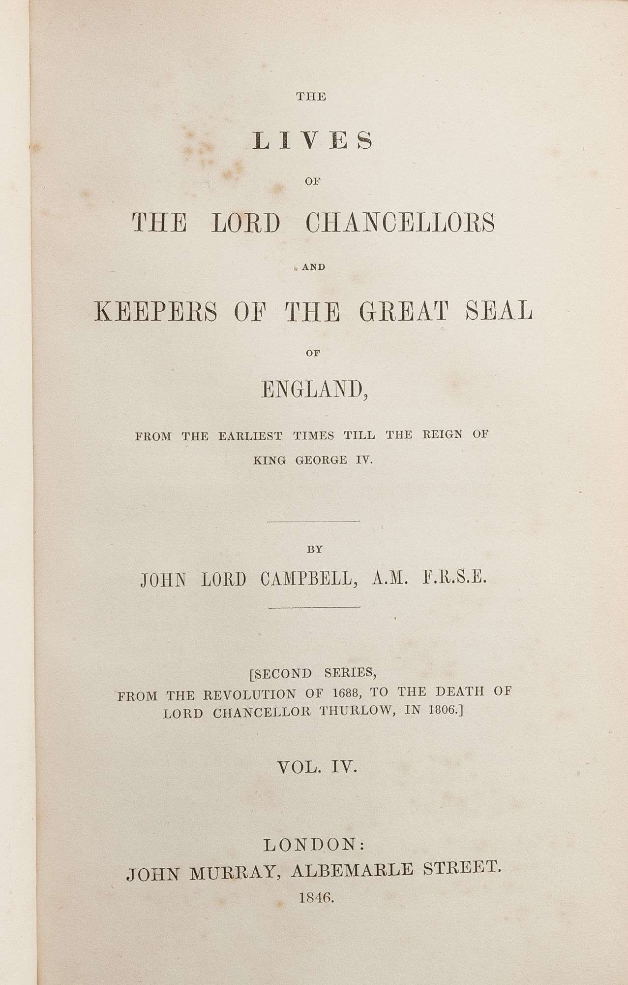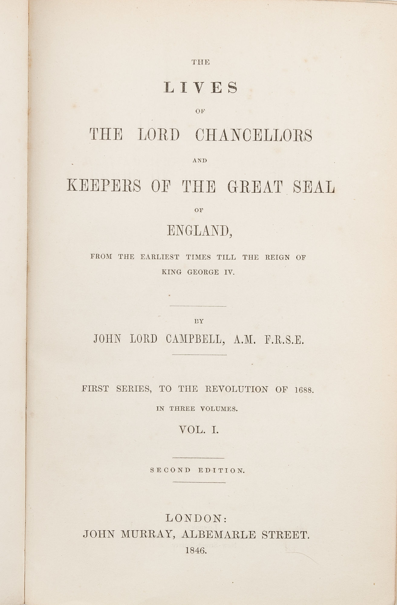 1848. London: John Murray, 1848-1869. 8 vols.. London: John Murray, 1848-1869. 8 vols. A Handsomely Bound Copy of Campbell's Lives of the Lord Chancellors Campbell, John, 1st Baron Campbell [1779-1861]. The Lives of the Lord Chancellors and Keepers of the Great Seal of England, from the Earliest Times Till the Reign of King George IV. London: John Murray, 1846-1869. 8 volumes. Complete set. Octavo (8-1/2" x 5-1/2"). Three-quarter red morocco over cloth, blind rules to boards, raised bands and gilt titles to spines, all edges marbled, marbled endpapers. Gilt circular crest on front boards. Prize bindings awarded by The Law Society with presentation certificate on front pastedown of volume one. Light rubbing to extremities, minor nicks and finger smudges to a few volumes, moderate toning to interiors. A handsome set. $750. * Volumes 1-5: second edition; Volumes 6-8, third edition. This classic study, which went through several editions, is an incomparable storehouse of legal history and anecdote. Volume VIII is a continuation volume with an index to the entire set. Sweet & Maxwell, A Legal Bibliography of the British Commonwealth 2:54.