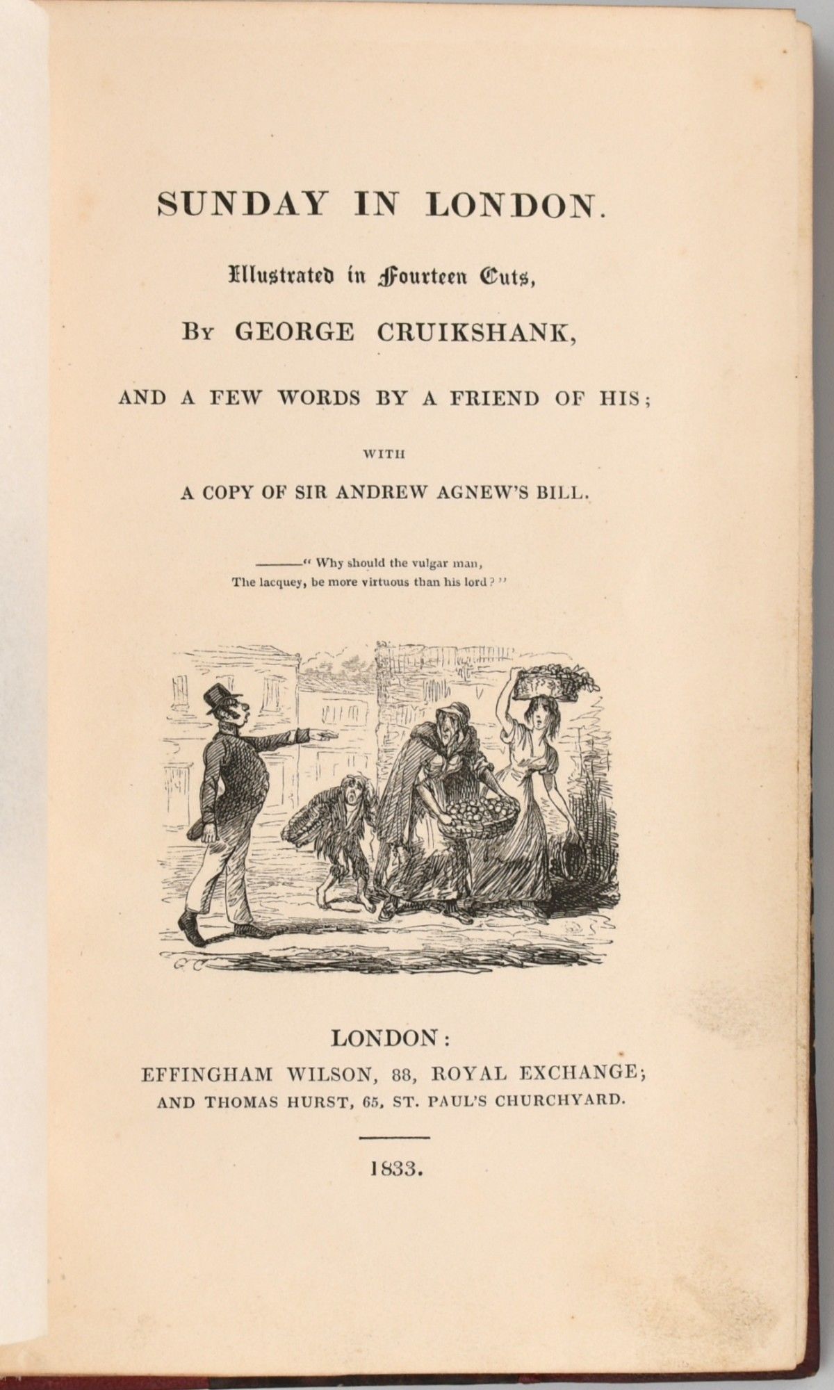 [ILLUSTRATED BOOKS] SUNDAY IN LONDON. ILLUSTRATED IN SIXTEEN CUTS, BY GEORGE CRUIKSHANK, AND A FEW WORDS BY A FRIEND OF HIS; WITH A COPY OF SIR ANDREW AGNEW'S BILL