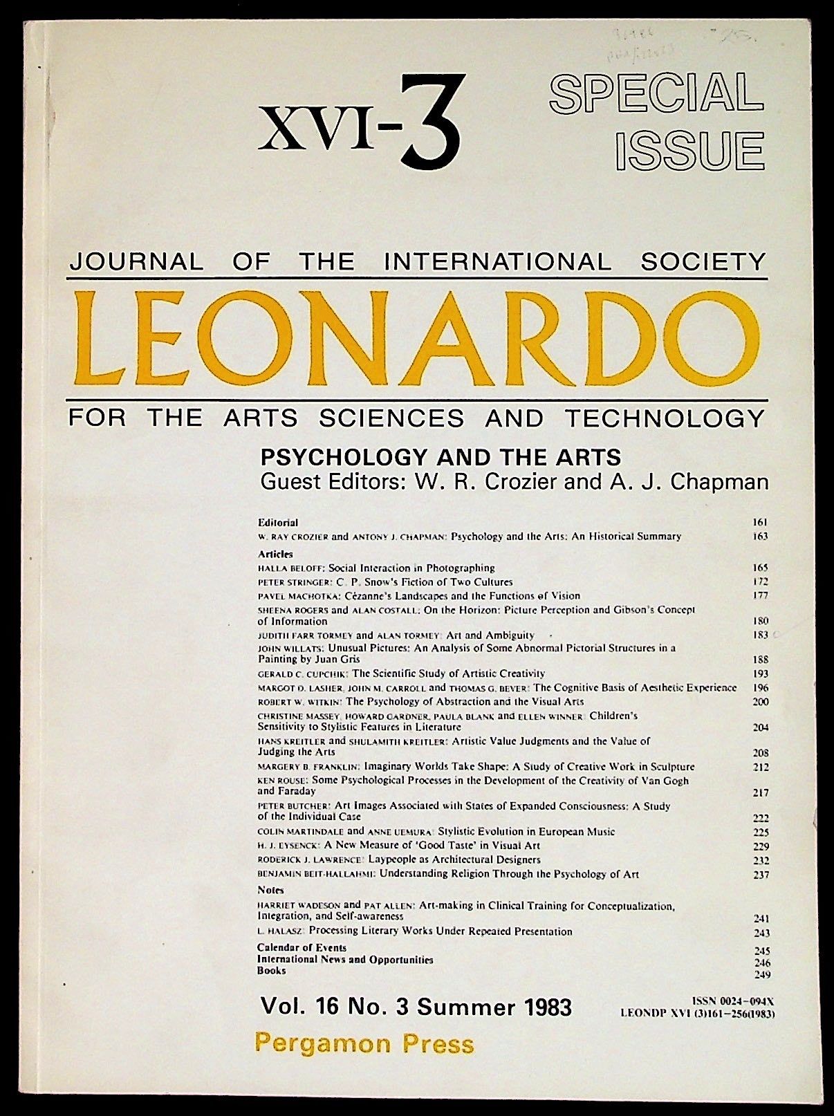 Leonardo: Journal of the International Society for the Arts, Sciences, and Technology. XVI - 3 Special Issue: Psychology and the Arts. Selected Papers Presented at the International Conference on Psychology and the Arts 5-9 September 1983, Cardiff, UK. Volume 16 No. 3 Summer 1983