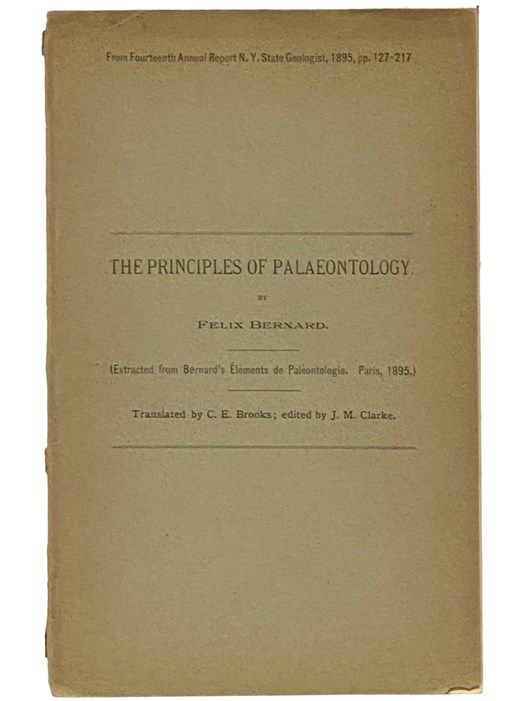 New York, 1895. Soft Cover. Good. Front wrapper loosening but still holding, small chips and small tears to wrapper edges. 1895 Soft Cover. 91 pp. Extracted from Bernard's Elements de Palontologie, Paris, 1895. From Fourteenth Annual Report N.Y. State Geologist, 1895, pp. 127-217. In the last years of the 19th century, Félix Bernard (1863–1898), a young and bright invertebrate paleontologist, worked as an assistant at the Paris Museum of Natural History where he was Gaudry's colleague, and where had been trained by Ernest Munier-Chalmas (1843–1903), an unconventional but sharp geologist and invertebrate palaeontologist. In 1895, at 35 years of age, Bernard published an 1100 page volume entitled Eléments de Paléontologie... - Science Direct