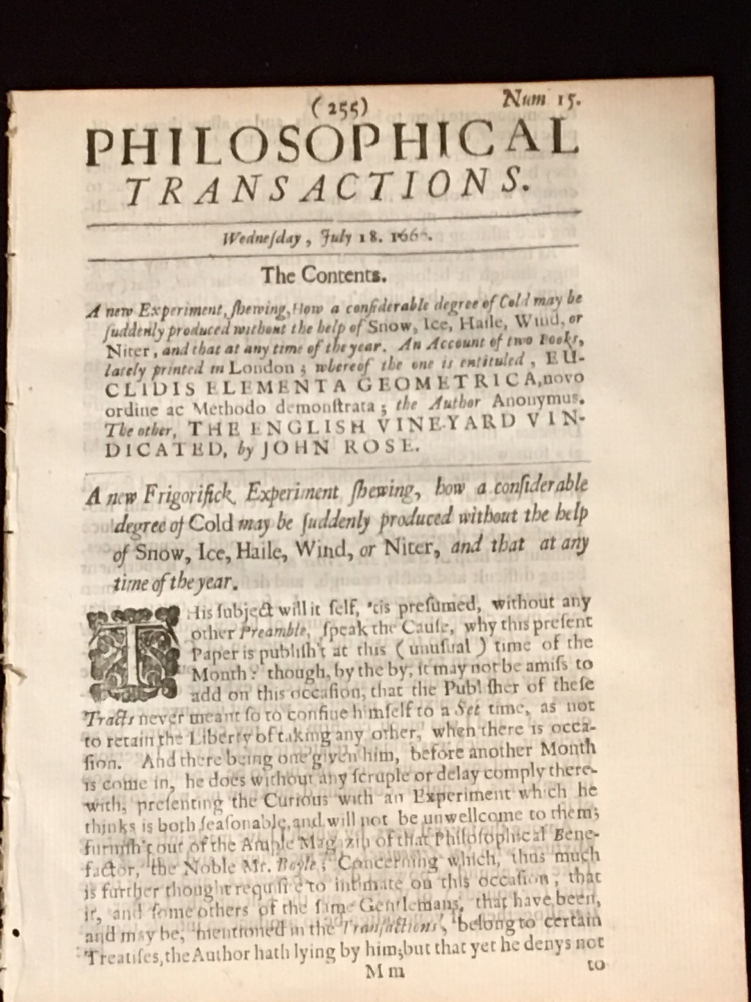 London: The Royal Society of London, 1666. First Edition. Very Good. Octavo, pp. 255 - 262 of the Philosophical transactions, Number 15. This article is a supplement to Boyle's 1663 publication "New Experiments and Observations Touching Cold." This was published shortly after "Boyle's Law" (1662), stating that the volume of a gas varies inversely with pressure. Printed on laid paper, unbound.