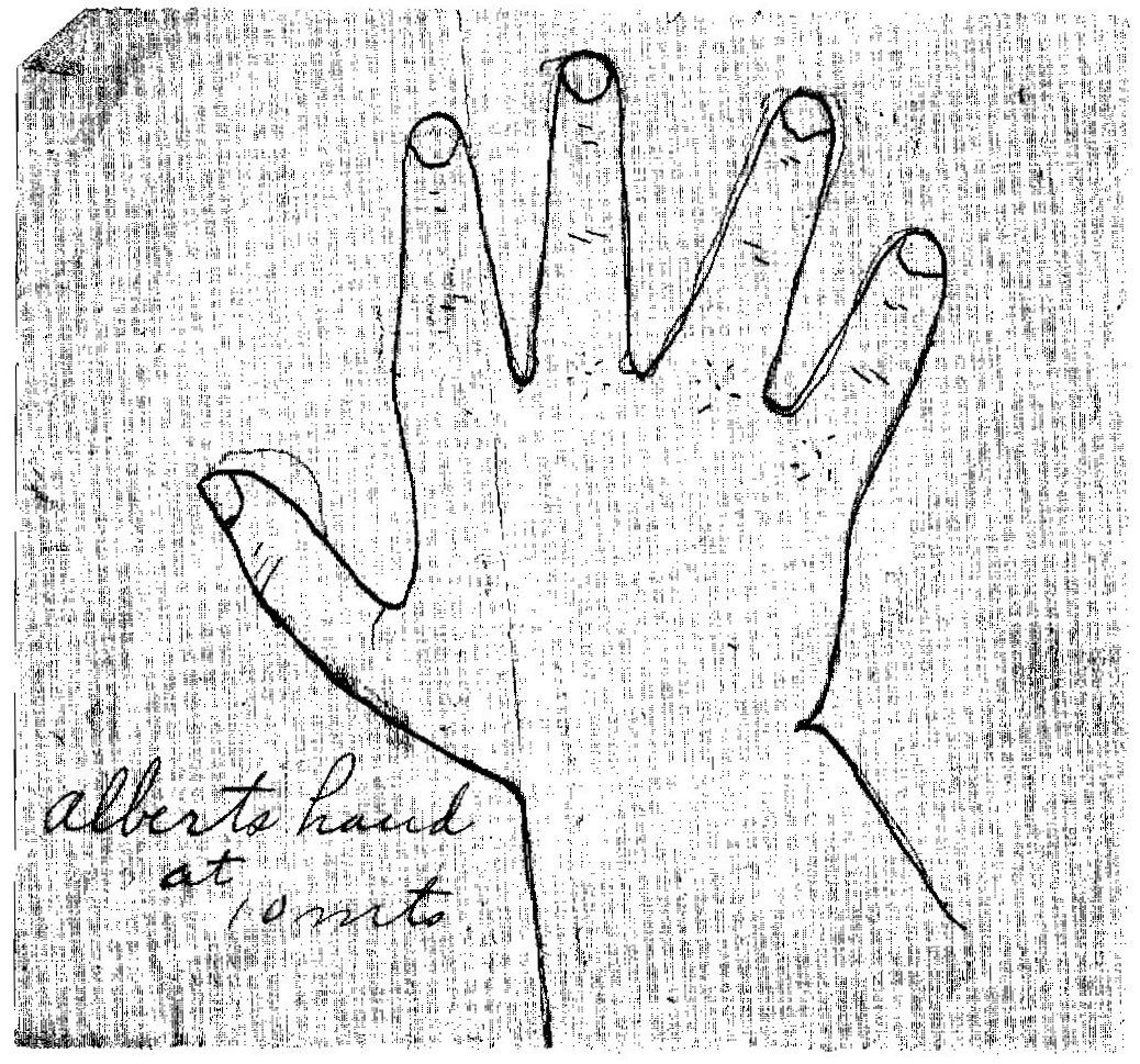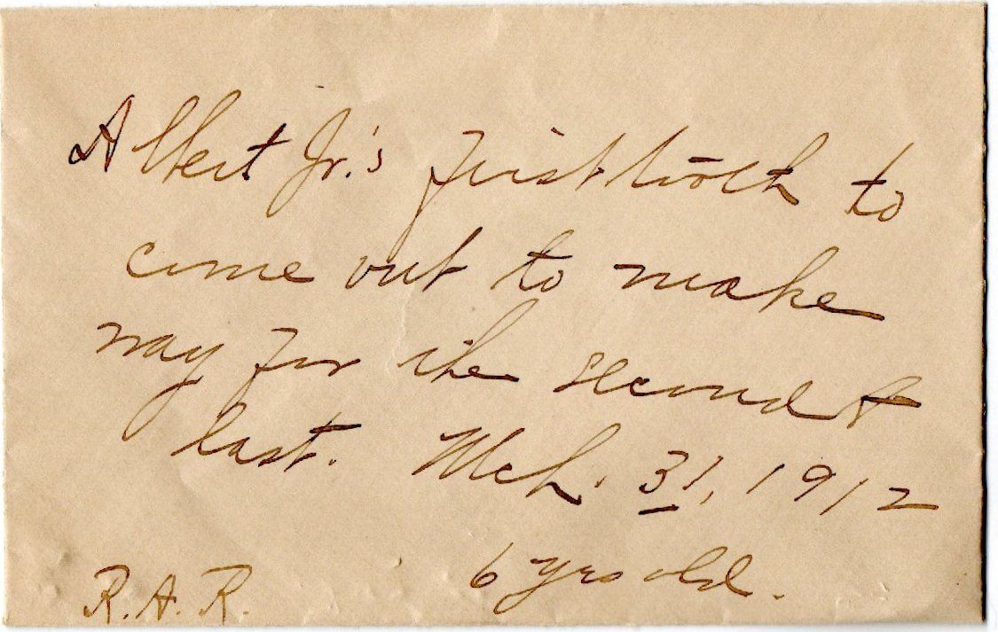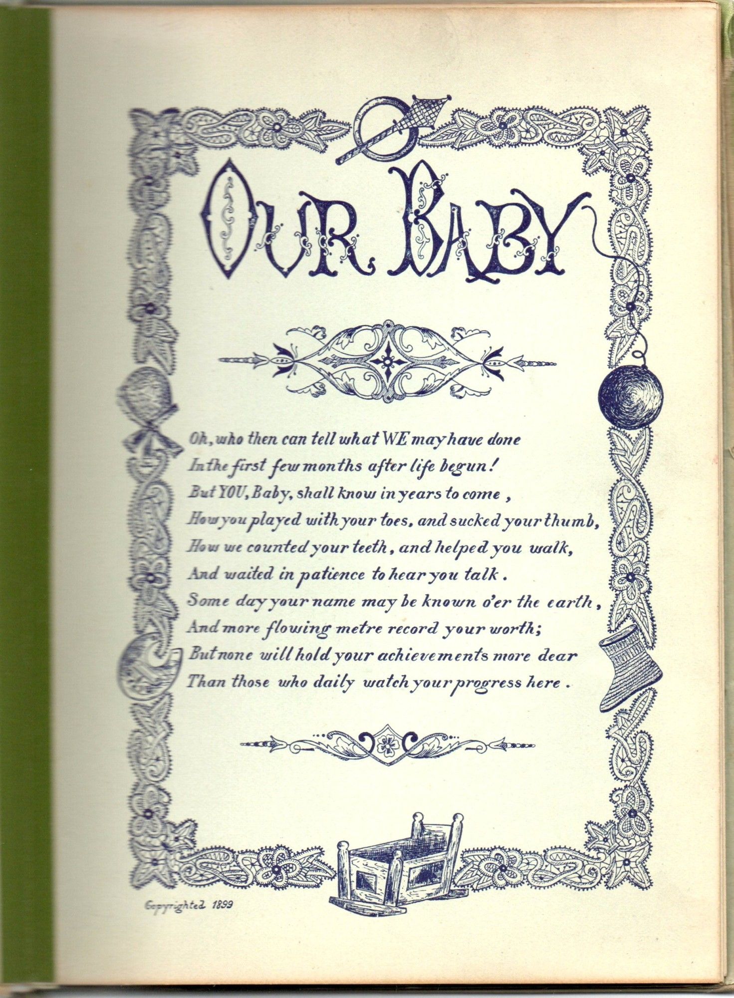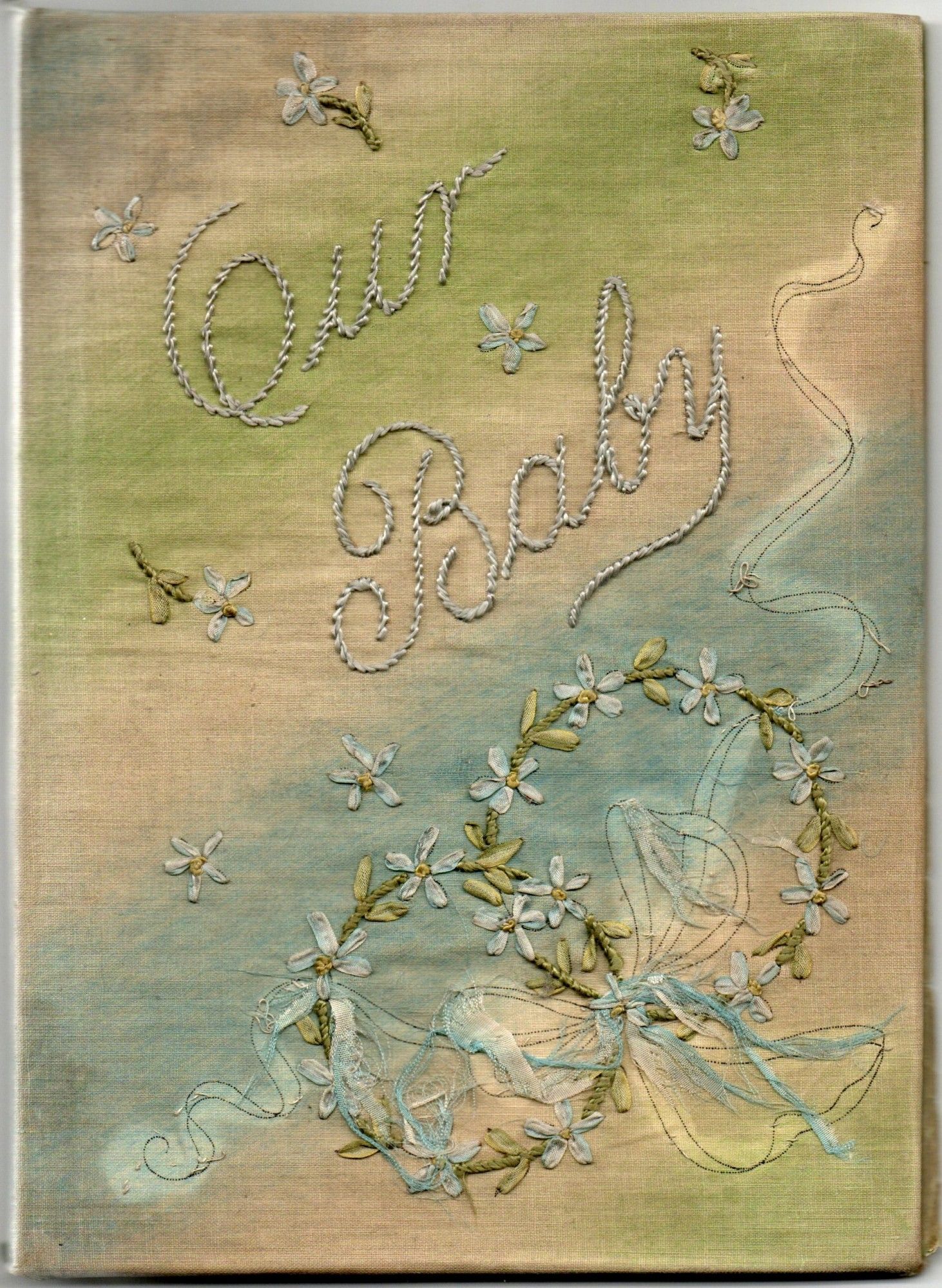 1899. Near Fine binding. Large 8vo; in a silk binbing with titiling "Our Baby" embroidered in sil, along with wreaths of silk "Forget-me-nots" and worn silk ribbon; with 8 printed leaves (the last two are sleeves which are torn and empty) with much handwritten information about the infant Albert Ault, born March 27, 1907 in Wyoming Ohio. The handwritten notes give us much of the usual baby information -- weight, doctor. details of his early days ("He was and is up to this date Aug. 15/06 a model boy. No colic or keeping awake at night" and [charmingly] "His greatest friend seems to be his mother at whom he laughs contitnually}.~~Laid in is an envelope on which is noted "Albert Jr.'s first tooth to come ou to make way for the second to last." March 31, 1912. 6 years old." The tooth remains in the envelope.~~There is also laid in a slip of paper on which is drawn in outline "Albert's hand at 10 months".~~A charming relic from the days long before social media.~~. Near Fine binding.