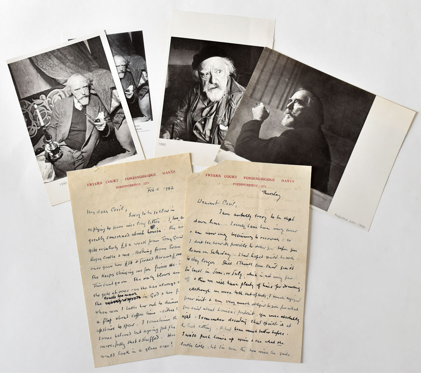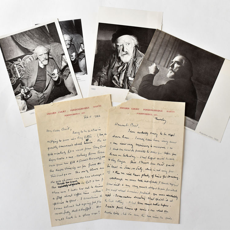 Both on the artist's Fryern Court, Fordingbridge stationery, 1942. Single sheets, written recto and verso. 8vo 8 x 5 inches (20 x 12.5 cm). Usual folds, some toning, the blank upper corner of one sheet missing. Single sheets, written recto and verso. 8vo 8 x 5 inches (20 x 12.5 cm). each about 30 lines, to "My dear Cecil" or "Dearest Cecil" from "Augustus"