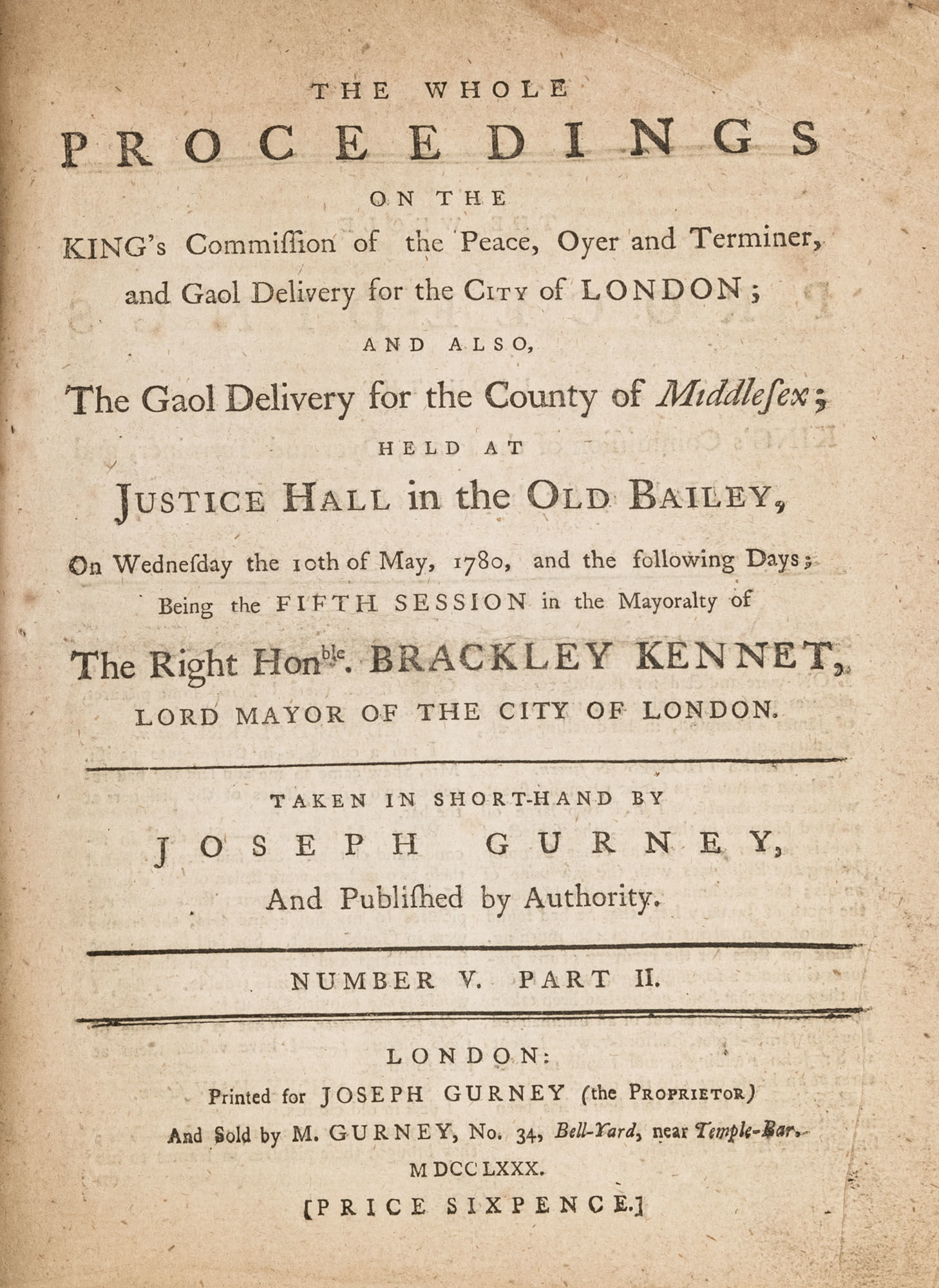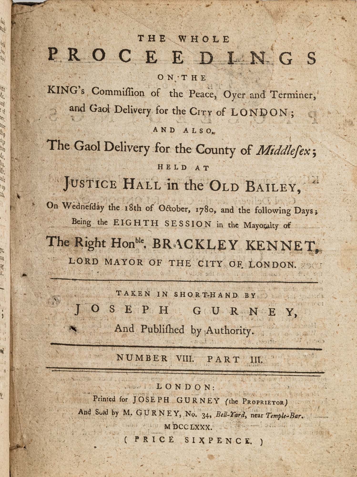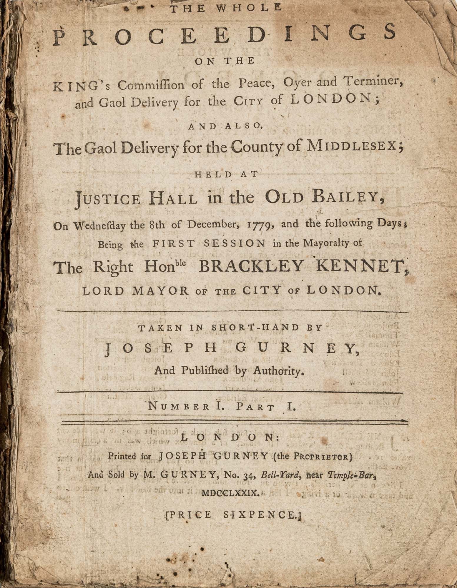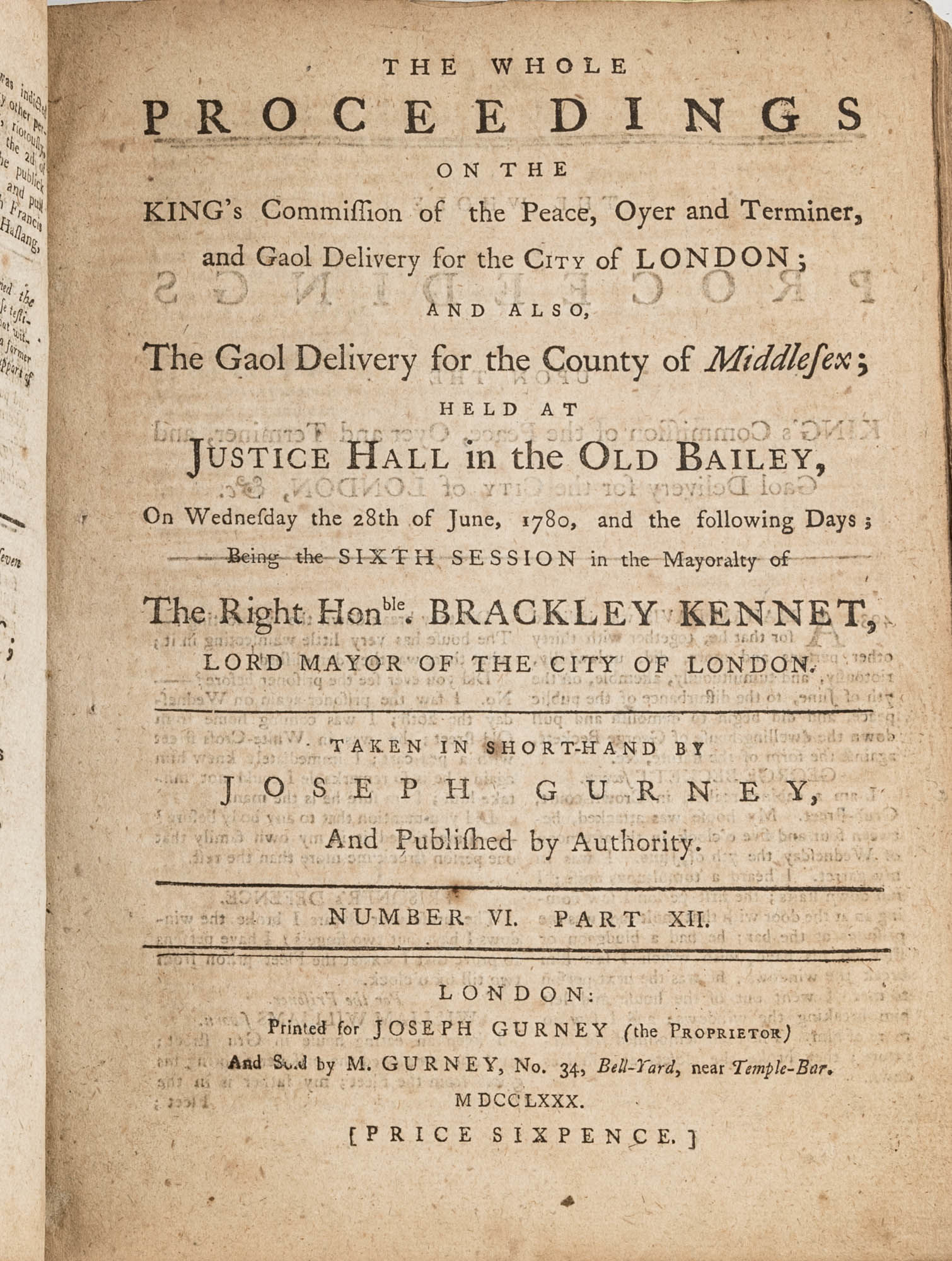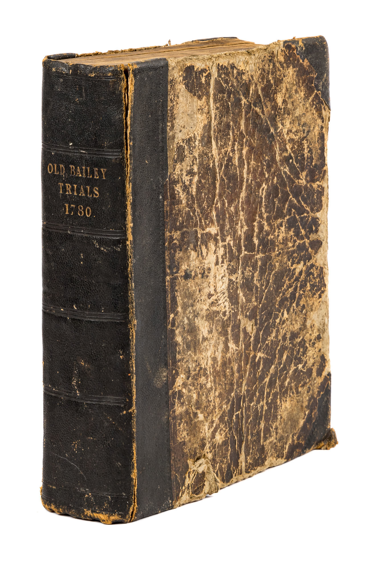 1779. A Year in the Life of the Old Bailey [Trials]. [Great Britain]. Gurney, Joseph [1744-1815], Reporter. The Whole Proceedings on the King's Commission of the Peace, Oyer and Terminer, Gaol Delivery for the City of London; And Also, The Gaol Delivery for the County of Middlesex; Held at Justice Hall in the Old Bailey.... London: Printed for Joseph Gurney (the Proprietor) And Sold by M. Gurney, 1779-1780. 796, [4] pp. 8 numbers, No. I in 2 parts, No. VI in 12 parts, all others in 3 parts. Each part with separate special title page and continuous pagination. Final part with index. Quarto (9" x 6-3/4"). Near-contemporary three-quarter sheep over paper-covered boards, blind fillets to sheep edges, gilt title and blind fillets to spine. Worn, paper of boards creased and partially abraded in places, front board separating, rear joint starting, wear to board edges, corners bumped, lower outside corner of rear board worn away, hinges cracked, free endpapers lacking, later bookseller description tipped onto front pastedown, faint later pencil doodles to rear pastedown. Moderate toning to interior, occasional light foxing and faint dampstaining, creasing and light edgewear to first and final few leaves, a few cracks to text block, a few leaves loosening slightly but secure, leaf 9H1 (pp. 765-766) misbound after 9H2 (pp. 767-768), text complete, trimming (or printing errors?) to a few leaves with loss to page numbers but not main text. $1,500. * Published in parts and later bound together, these reports of trials held at the "Court of Oyer and Terminer and Gaol Delivery for London and Middlesex," better known as Old Bailey, cover sessions held from December 8, 1779 to October 18, 1780. The trials deal with matters such as theft, assault, forgery and murder; the high number of capital cases and punishments reflects the punitive nature of British justice in the eighteenth century. Other convicts were sentenced to imprisonment, whipping and "navigation," which in practice meant hard labor or imprisonment during the suspension of transportation from 1776-1787 after the American Revolution. Complete volumes such as ours are scarce. OCLC locates 4 in North America for the years 1779-1780, 2 in law libraries (Yale, Library of Congress, which has an imperfect copy). English Short-Title Catalogue T073786.