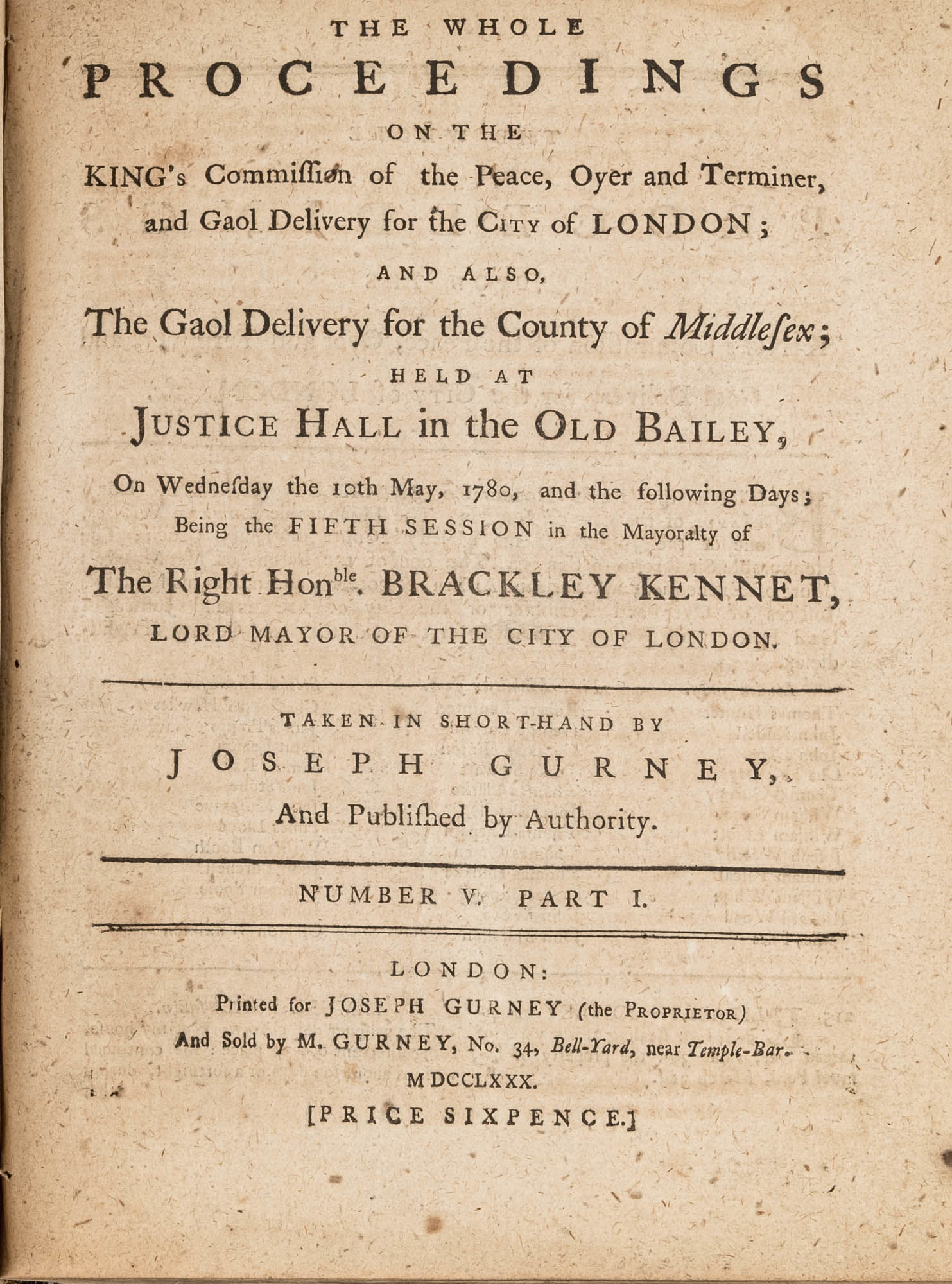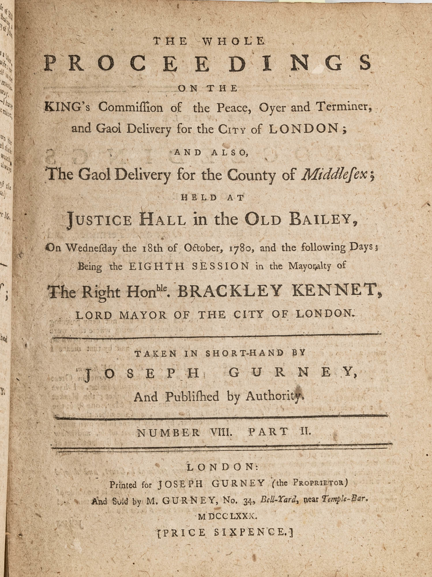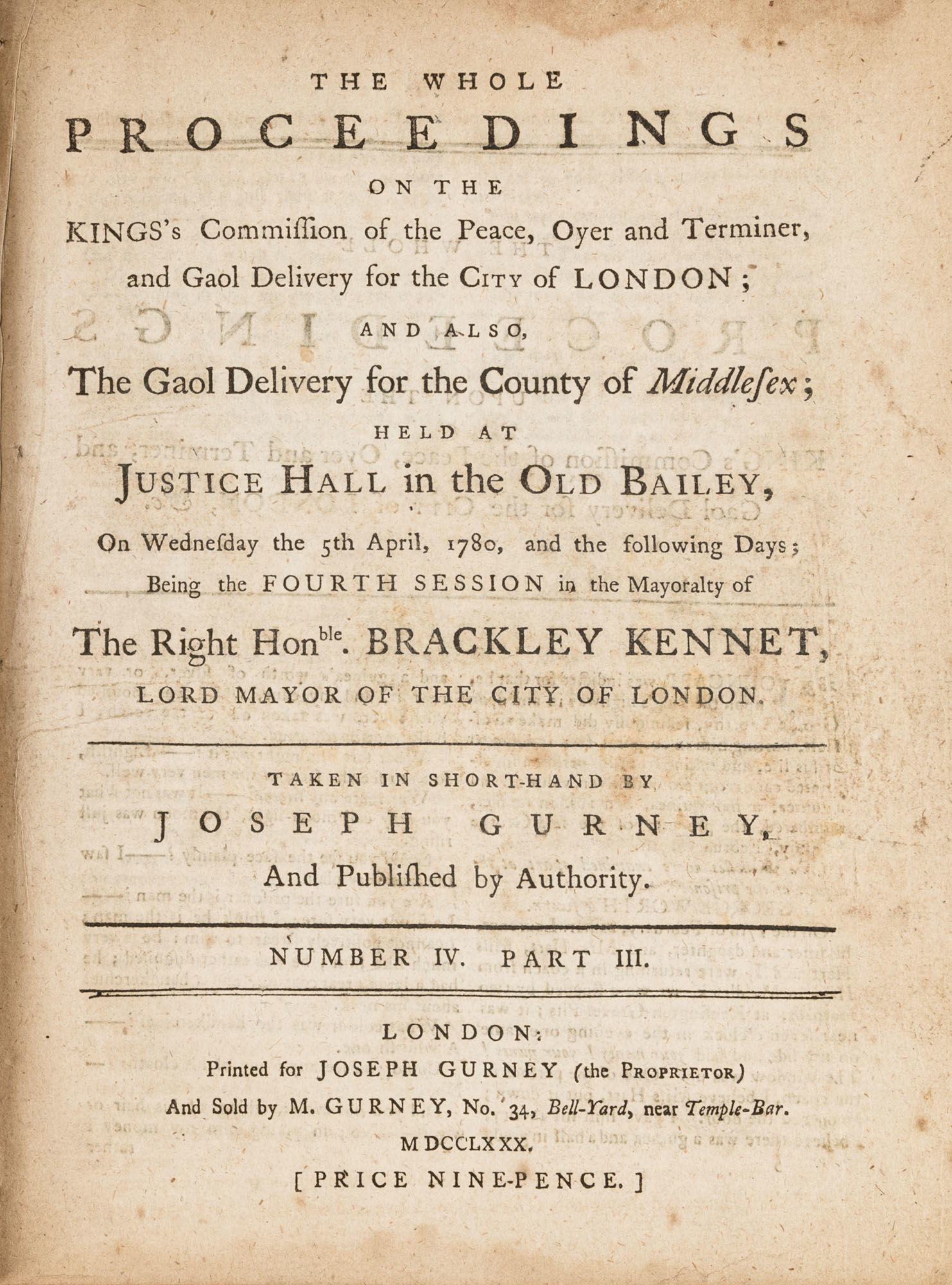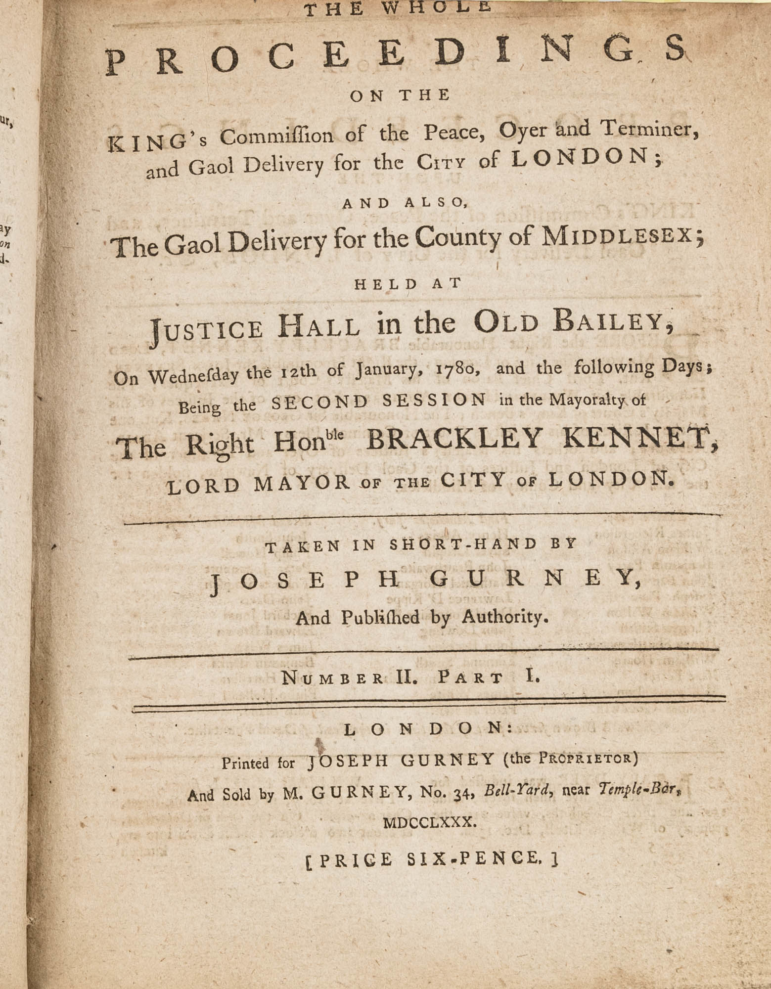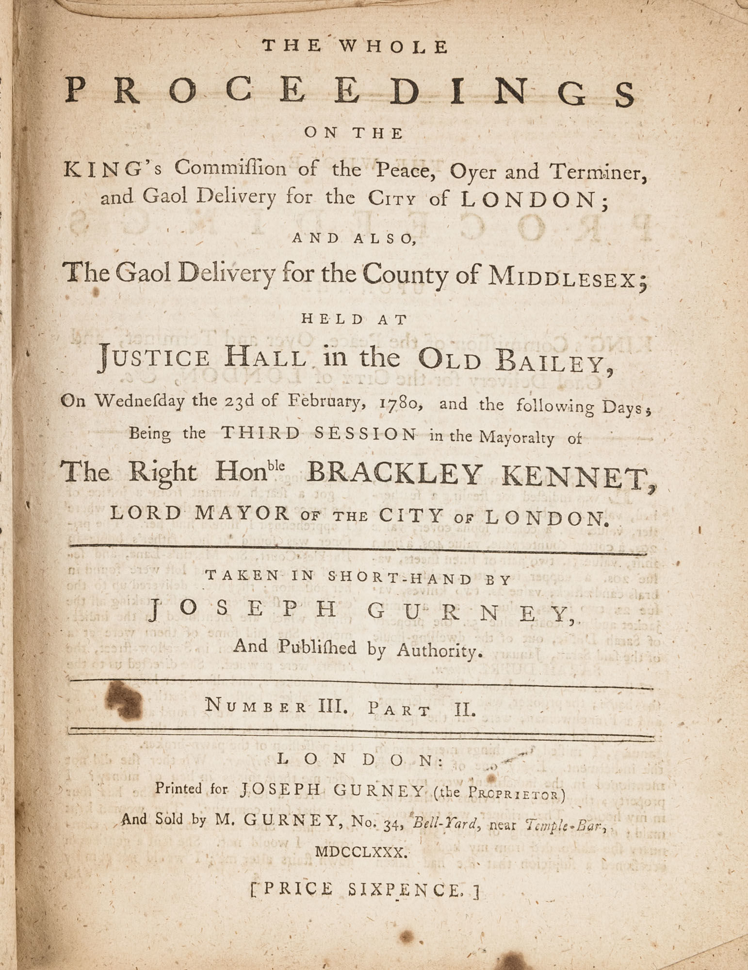 1779. A Year in the Life of the Old Bailey [Trials]. [Great Britain]. Gurney, Joseph [1744-1815], Reporter. The Whole Proceedings on the King's Commission of the Peace, Oyer and Terminer, Gaol Delivery for the City of London; And Also, The Gaol Delivery for the County of Middlesex; Held at Justice Hall in the Old Bailey.... London: Printed for Joseph Gurney (the Proprietor) And Sold by M. Gurney, 1779-1780. 796, [4] pp. 8 numbers, No. I in 2 parts, No. VI in 12 parts, all others in 3 parts. Each part with separate special title page and continuous pagination. Final part with index. Quarto (9" x 6-3/4"). Near-contemporary three-quarter sheep over paper-covered boards, blind fillets to sheep edges, gilt title and blind fillets to spine. Worn, paper of boards creased and partially abraded in places, front board separating, rear joint starting, wear to board edges, corners bumped, lower outside corner of rear board worn away, hinges cracked, free endpapers lacking, later bookseller description tipped onto front pastedown, faint later pencil doodles to rear pastedown. Moderate toning to interior, occasional light foxing and faint dampstaining, creasing and light edgewear to first and final few leaves, a few cracks to text block, a few leaves loosening slightly but secure, leaf 9H1 (pp. 765-766) misbound after 9H2 (pp. 767-768), text complete, trimming (or printing errors?) to a few leaves with loss to page numbers but not main text. $1,500. * Published in parts and later bound together, these reports of trials held at the "Court of Oyer and Terminer and Gaol Delivery for London and Middlesex," better known as Old Bailey, cover sessions held from December 8, 1779 to October 18, 1780. The trials deal with matters such as theft, assault, forgery and murder; the high number of capital cases and punishments reflects the punitive nature of British justice in the eighteenth century. Other convicts were sentenced to imprisonment, whipping and "navigation," which in practice meant hard labor or imprisonment during the suspension of transportation from 1776-1787 after the American Revolution. Complete volumes such as ours are scarce. OCLC locates 4 in North America for the years 1779-1780, 2 in law libraries (Yale, Library of Congress, which has an imperfect copy). English Short-Title Catalogue T073786.