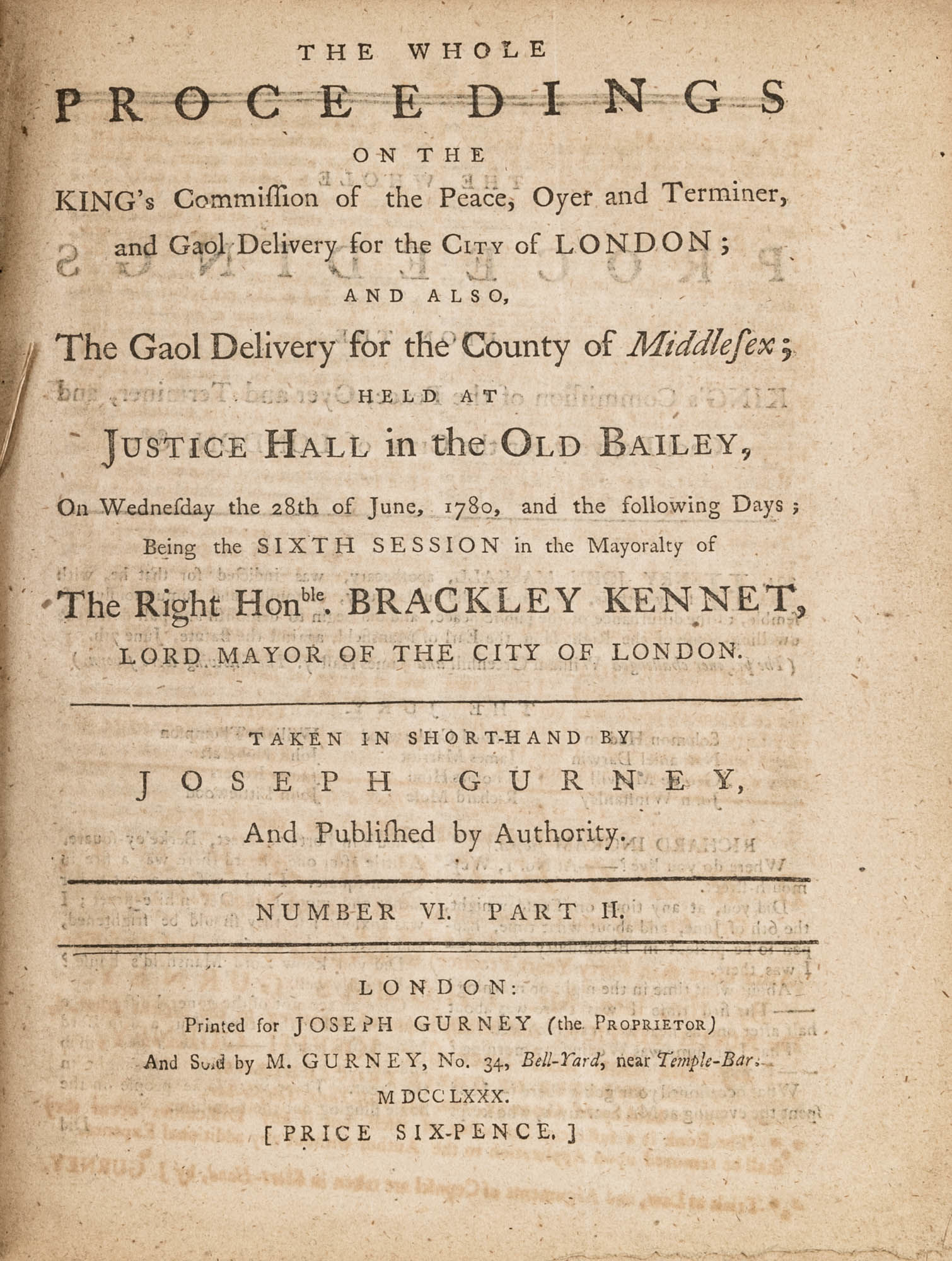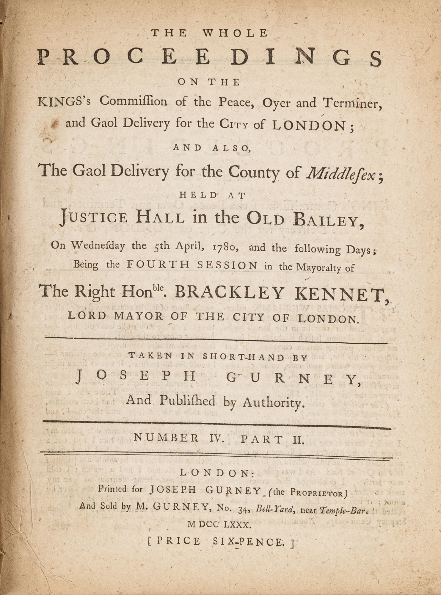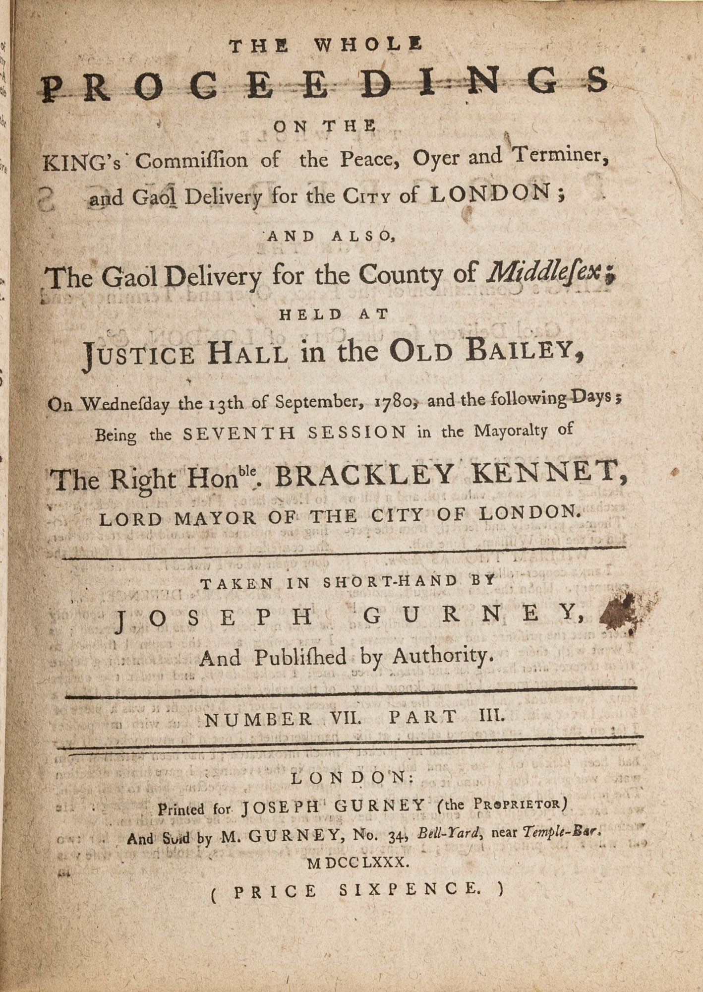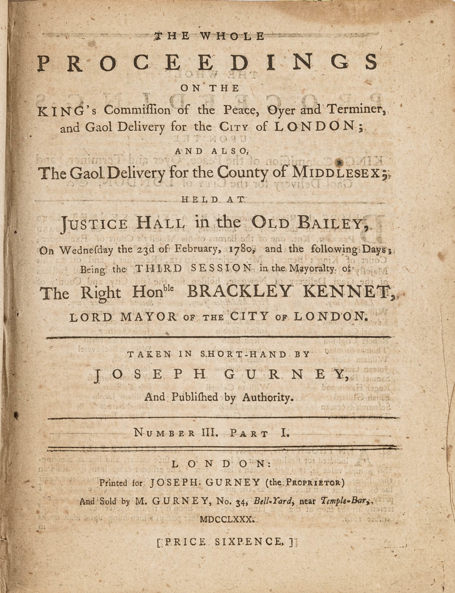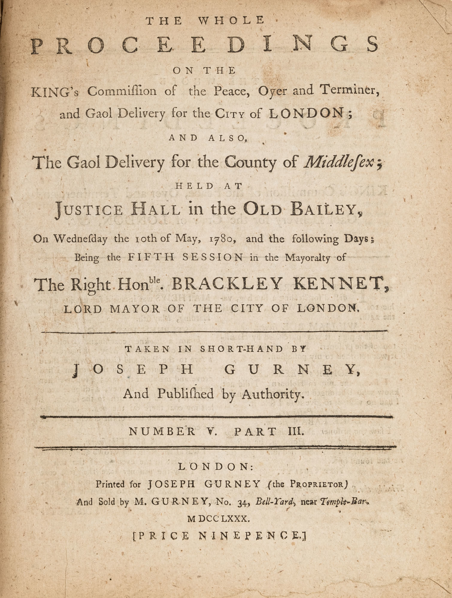 1779. A Year in the Life of the Old Bailey [Trials]. [Great Britain]. Gurney, Joseph [1744-1815], Reporter. The Whole Proceedings on the King's Commission of the Peace, Oyer and Terminer, Gaol Delivery for the City of London; And Also, The Gaol Delivery for the County of Middlesex; Held at Justice Hall in the Old Bailey.... London: Printed for Joseph Gurney (the Proprietor) And Sold by M. Gurney, 1779-1780. 796, [4] pp. 8 numbers, No. I in 2 parts, No. VI in 12 parts, all others in 3 parts. Each part with separate special title page and continuous pagination. Final part with index. Quarto (9" x 6-3/4"). Near-contemporary three-quarter sheep over paper-covered boards, blind fillets to sheep edges, gilt title and blind fillets to spine. Worn, paper of boards creased and partially abraded in places, front board separating, rear joint starting, wear to board edges, corners bumped, lower outside corner of rear board worn away, hinges cracked, free endpapers lacking, later bookseller description tipped onto front pastedown, faint later pencil doodles to rear pastedown. Moderate toning to interior, occasional light foxing and faint dampstaining, creasing and light edgewear to first and final few leaves, a few cracks to text block, a few leaves loosening slightly but secure, leaf 9H1 (pp. 765-766) misbound after 9H2 (pp. 767-768), text complete, trimming (or printing errors?) to a few leaves with loss to page numbers but not main text. $1,500. * Published in parts and later bound together, these reports of trials held at the "Court of Oyer and Terminer and Gaol Delivery for London and Middlesex," better known as Old Bailey, cover sessions held from December 8, 1779 to October 18, 1780. The trials deal with matters such as theft, assault, forgery and murder; the high number of capital cases and punishments reflects the punitive nature of British justice in the eighteenth century. Other convicts were sentenced to imprisonment, whipping and "navigation," which in practice meant hard labor or imprisonment during the suspension of transportation from 1776-1787 after the American Revolution. Complete volumes such as ours are scarce. OCLC locates 4 in North America for the years 1779-1780, 2 in law libraries (Yale, Library of Congress, which has an imperfect copy). English Short-Title Catalogue T073786.