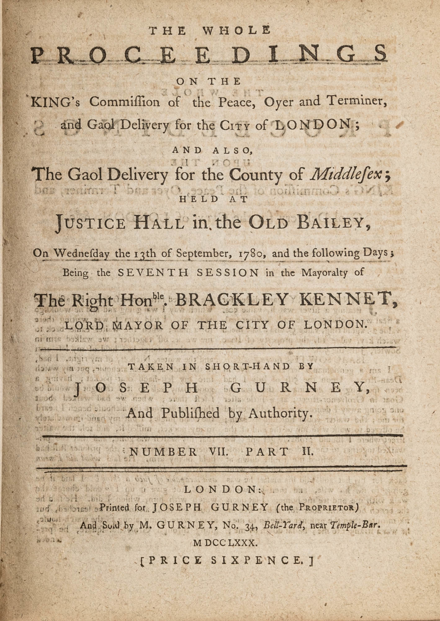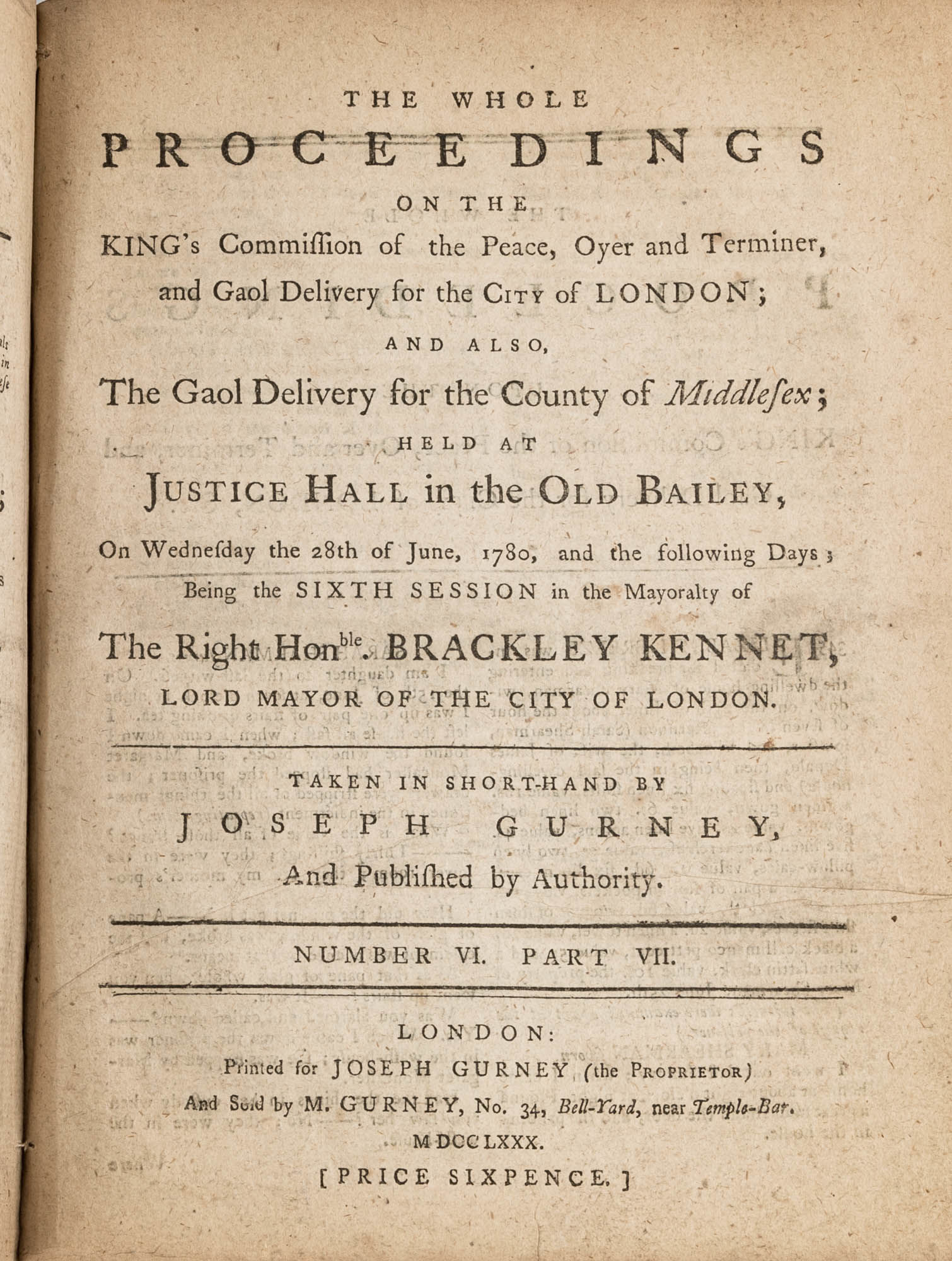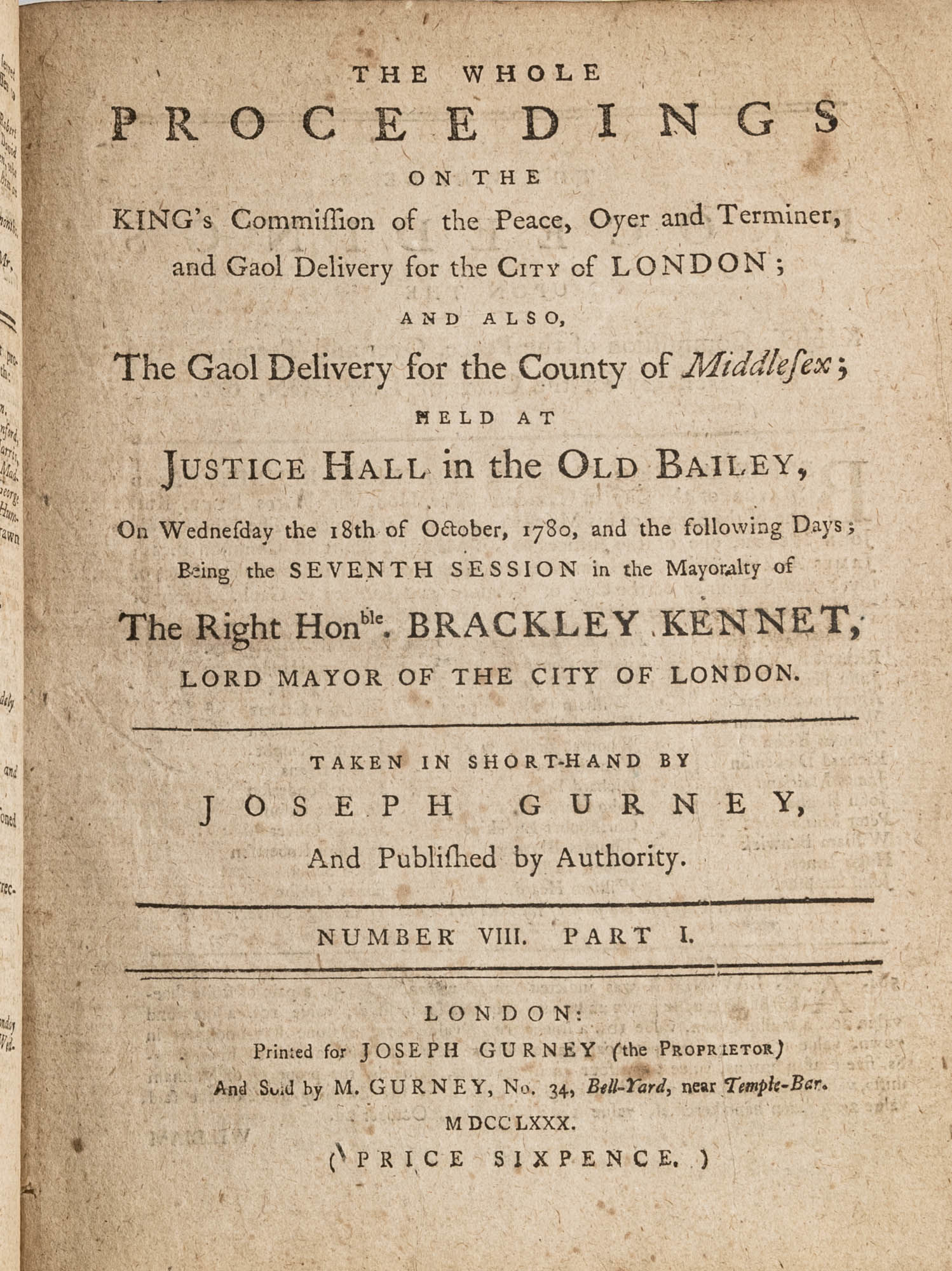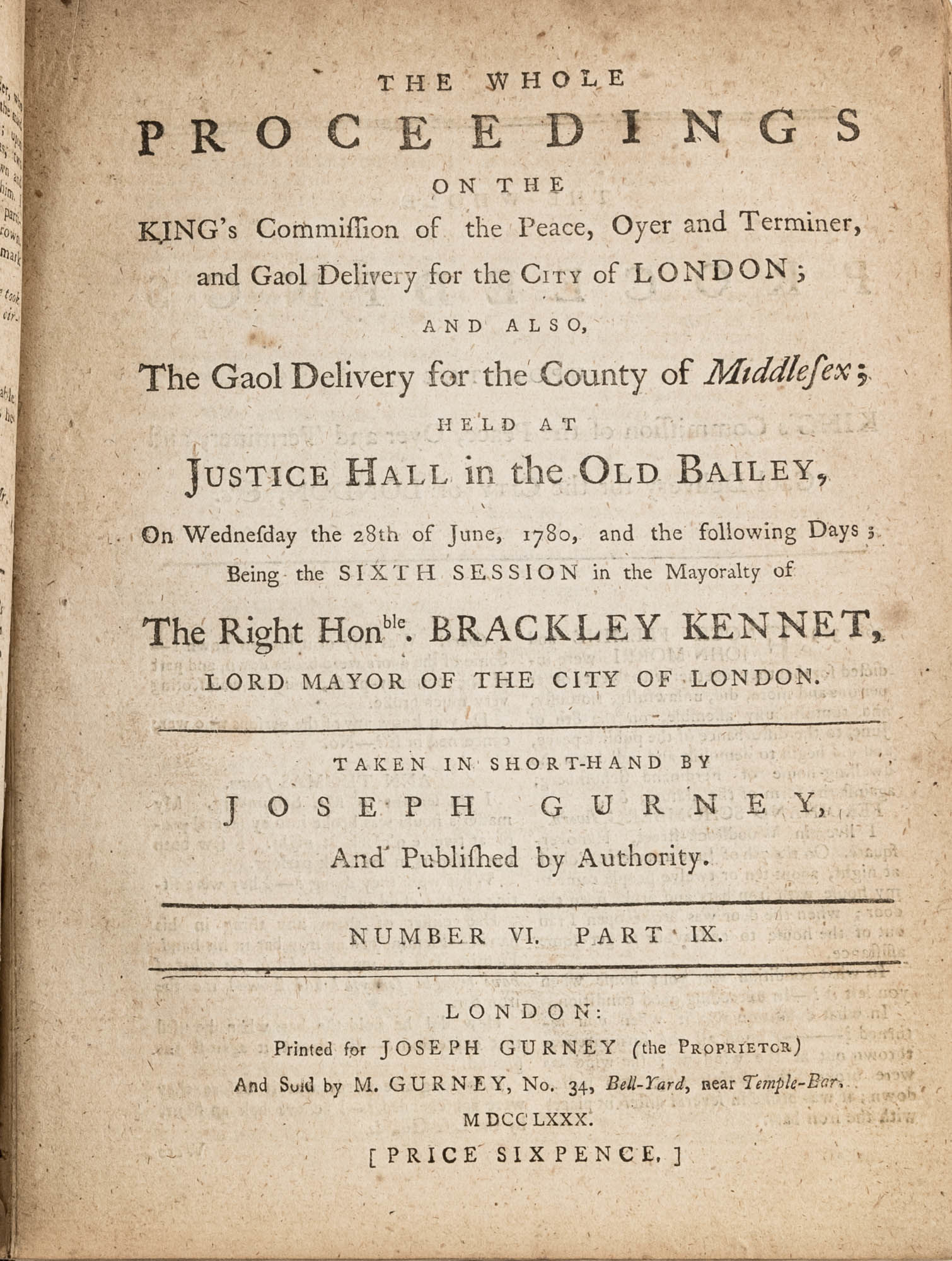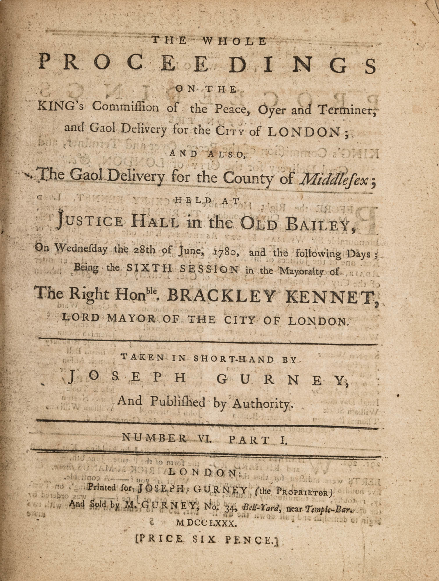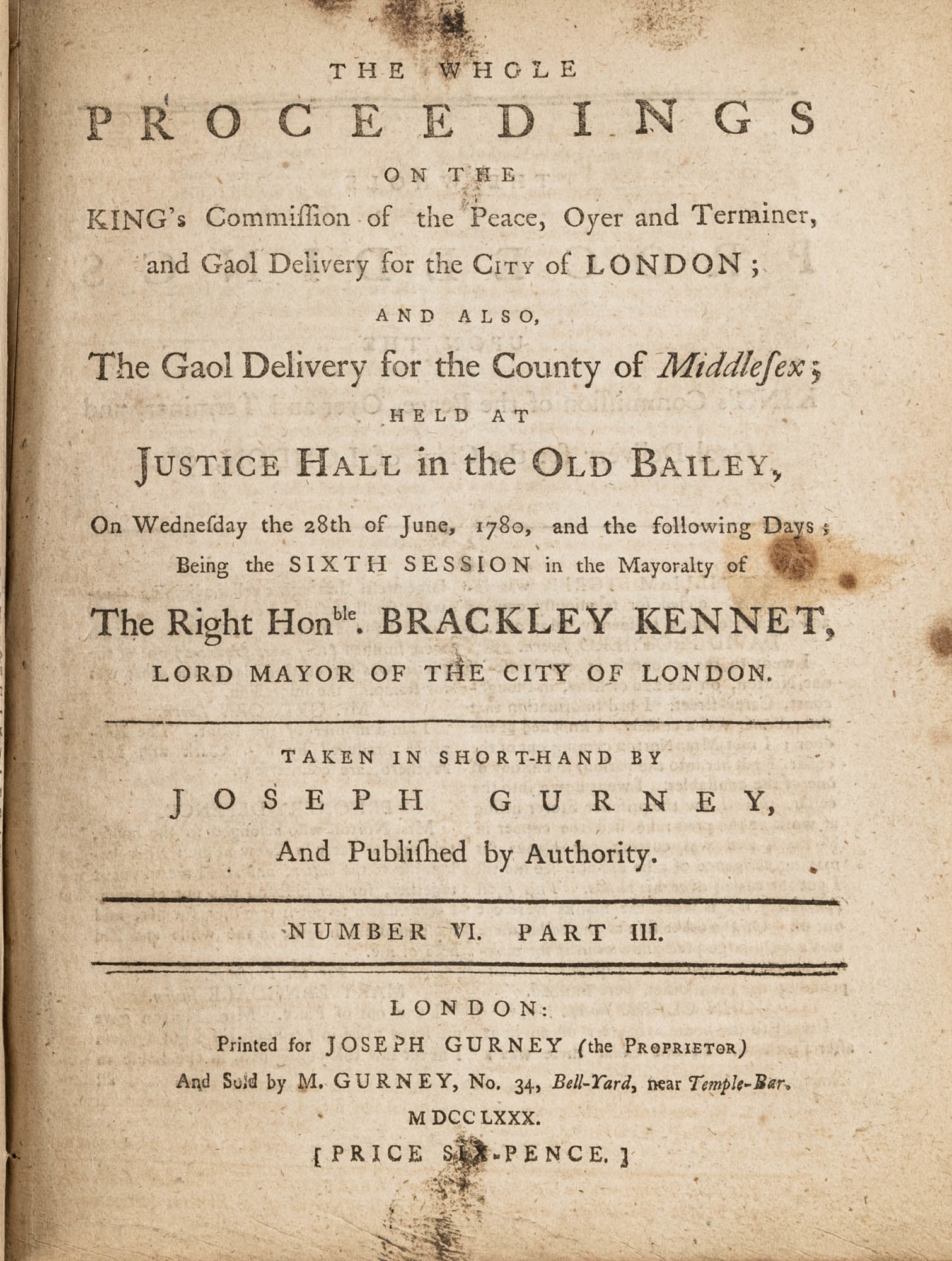 1779. A Year in the Life of the Old Bailey [Trials]. [Great Britain]. Gurney, Joseph [1744-1815], Reporter. The Whole Proceedings on the King's Commission of the Peace, Oyer and Terminer, Gaol Delivery for the City of London; And Also, The Gaol Delivery for the County of Middlesex; Held at Justice Hall in the Old Bailey.... London: Printed for Joseph Gurney (the Proprietor) And Sold by M. Gurney, 1779-1780. 796, [4] pp. 8 numbers, No. I in 2 parts, No. VI in 12 parts, all others in 3 parts. Each part with separate special title page and continuous pagination. Final part with index. Quarto (9" x 6-3/4"). Near-contemporary three-quarter sheep over paper-covered boards, blind fillets to sheep edges, gilt title and blind fillets to spine. Worn, paper of boards creased and partially abraded in places, front board separating, rear joint starting, wear to board edges, corners bumped, lower outside corner of rear board worn away, hinges cracked, free endpapers lacking, later bookseller description tipped onto front pastedown, faint later pencil doodles to rear pastedown. Moderate toning to interior, occasional light foxing and faint dampstaining, creasing and light edgewear to first and final few leaves, a few cracks to text block, a few leaves loosening slightly but secure, leaf 9H1 (pp. 765-766) misbound after 9H2 (pp. 767-768), text complete, trimming (or printing errors?) to a few leaves with loss to page numbers but not main text. $1,500. * Published in parts and later bound together, these reports of trials held at the "Court of Oyer and Terminer and Gaol Delivery for London and Middlesex," better known as Old Bailey, cover sessions held from December 8, 1779 to October 18, 1780. The trials deal with matters such as theft, assault, forgery and murder; the high number of capital cases and punishments reflects the punitive nature of British justice in the eighteenth century. Other convicts were sentenced to imprisonment, whipping and "navigation," which in practice meant hard labor or imprisonment during the suspension of transportation from 1776-1787 after the American Revolution. Complete volumes such as ours are scarce. OCLC locates 4 in North America for the years 1779-1780, 2 in law libraries (Yale, Library of Congress, which has an imperfect copy). English Short-Title Catalogue T073786.