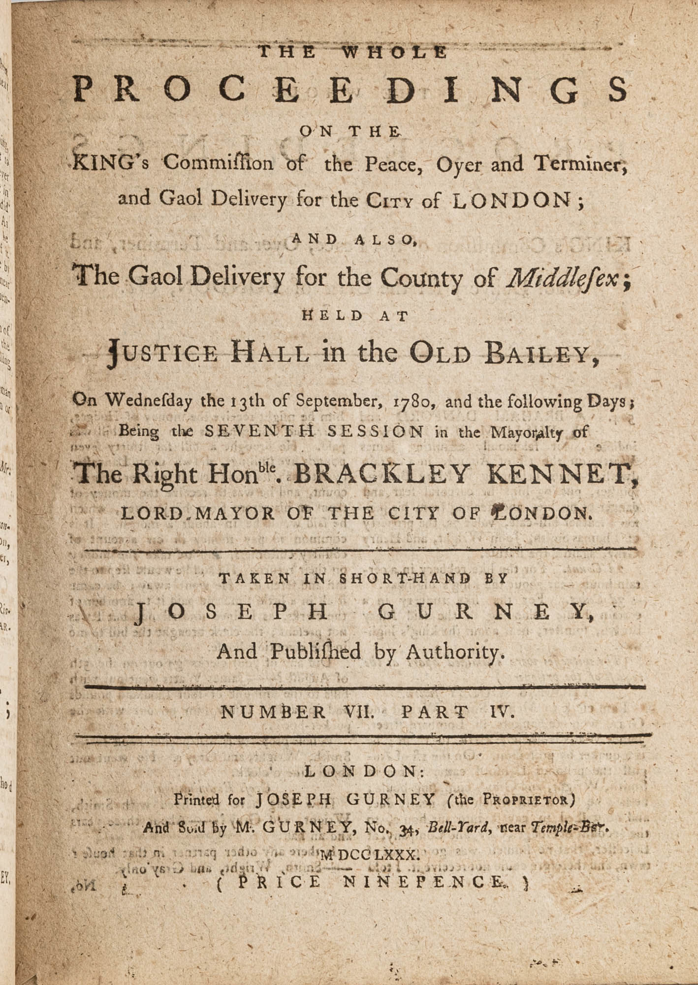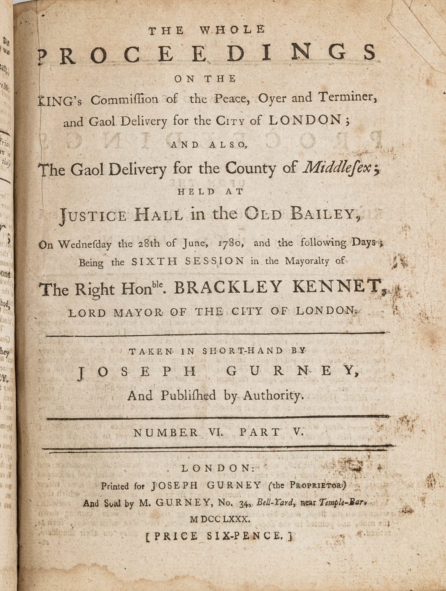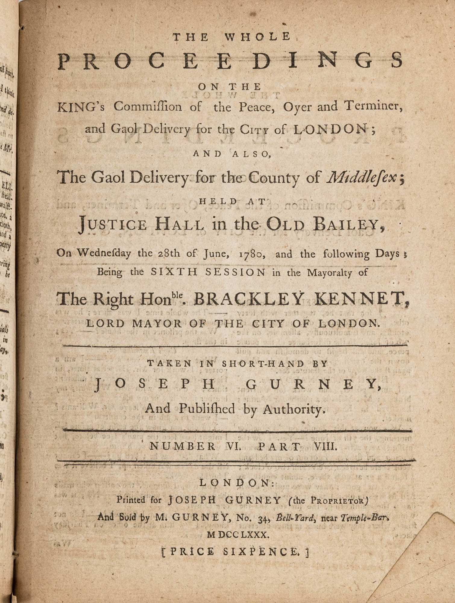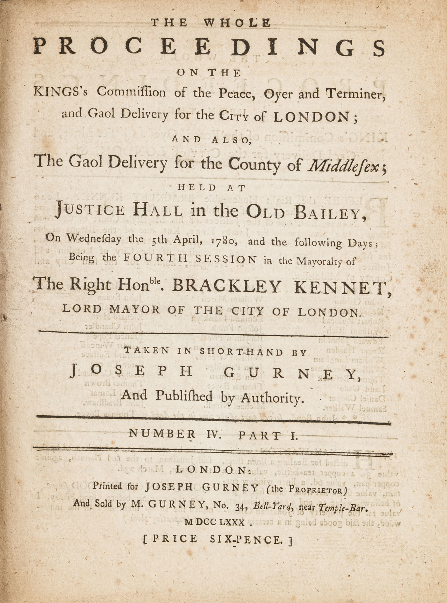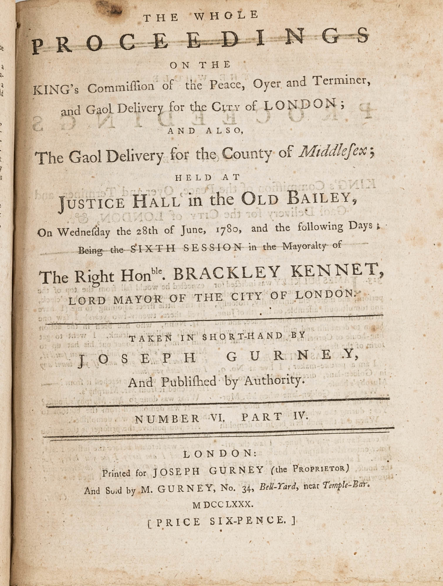 1779. A Year in the Life of the Old Bailey [Trials]. [Great Britain]. Gurney, Joseph [1744-1815], Reporter. The Whole Proceedings on the King's Commission of the Peace, Oyer and Terminer, Gaol Delivery for the City of London; And Also, The Gaol Delivery for the County of Middlesex; Held at Justice Hall in the Old Bailey.... London: Printed for Joseph Gurney (the Proprietor) And Sold by M. Gurney, 1779-1780. 796, [4] pp. 8 numbers, No. I in 2 parts, No. VI in 12 parts, all others in 3 parts. Each part with separate special title page and continuous pagination. Final part with index. Quarto (9" x 6-3/4"). Near-contemporary three-quarter sheep over paper-covered boards, blind fillets to sheep edges, gilt title and blind fillets to spine. Worn, paper of boards creased and partially abraded in places, front board separating, rear joint starting, wear to board edges, corners bumped, lower outside corner of rear board worn away, hinges cracked, free endpapers lacking, later bookseller description tipped onto front pastedown, faint later pencil doodles to rear pastedown. Moderate toning to interior, occasional light foxing and faint dampstaining, creasing and light edgewear to first and final few leaves, a few cracks to text block, a few leaves loosening slightly but secure, leaf 9H1 (pp. 765-766) misbound after 9H2 (pp. 767-768), text complete, trimming (or printing errors?) to a few leaves with loss to page numbers but not main text. $1,500. * Published in parts and later bound together, these reports of trials held at the "Court of Oyer and Terminer and Gaol Delivery for London and Middlesex," better known as Old Bailey, cover sessions held from December 8, 1779 to October 18, 1780. The trials deal with matters such as theft, assault, forgery and murder; the high number of capital cases and punishments reflects the punitive nature of British justice in the eighteenth century. Other convicts were sentenced to imprisonment, whipping and "navigation," which in practice meant hard labor or imprisonment during the suspension of transportation from 1776-1787 after the American Revolution. Complete volumes such as ours are scarce. OCLC locates 4 in North America for the years 1779-1780, 2 in law libraries (Yale, Library of Congress, which has an imperfect copy). English Short-Title Catalogue T073786.