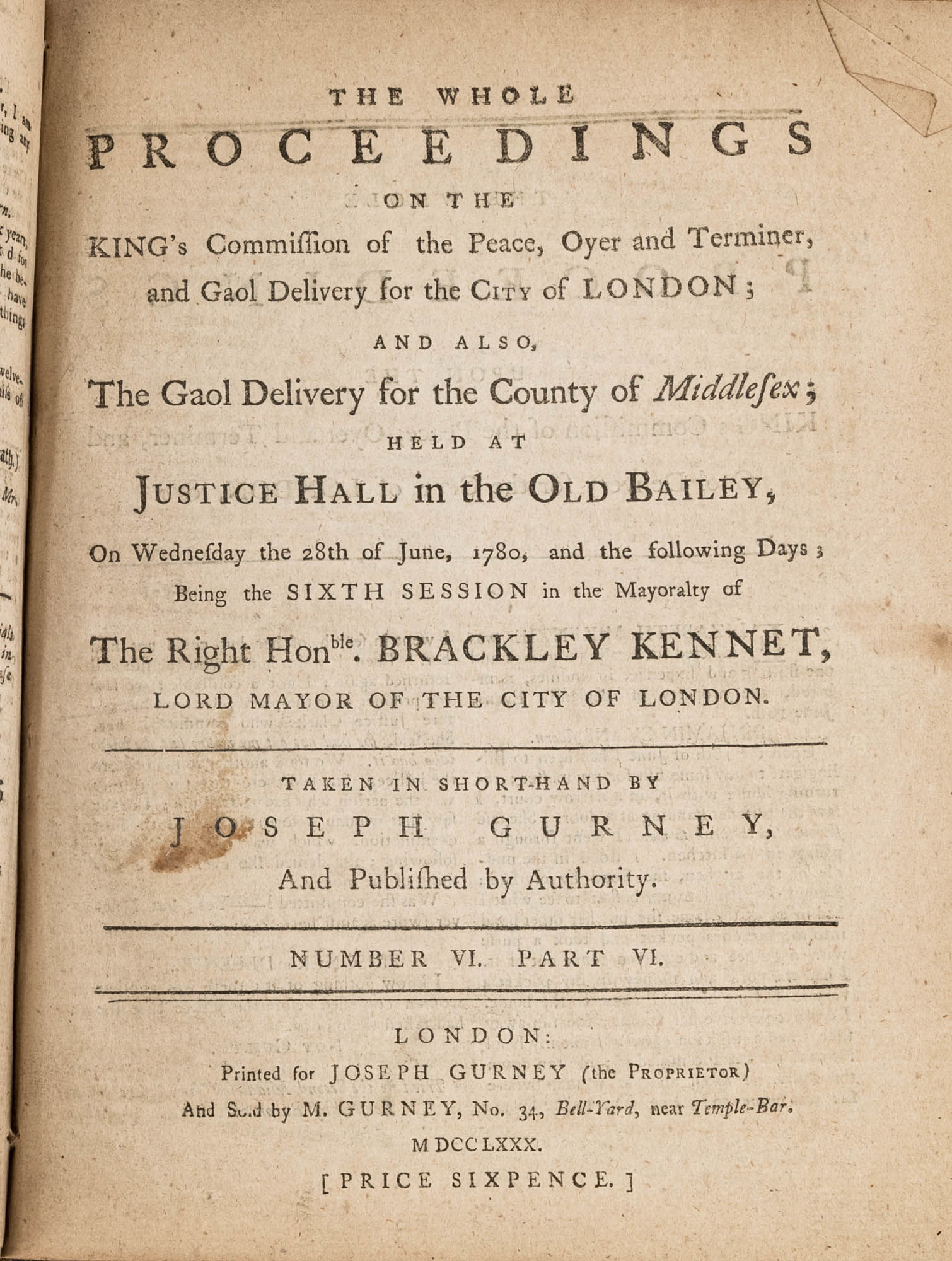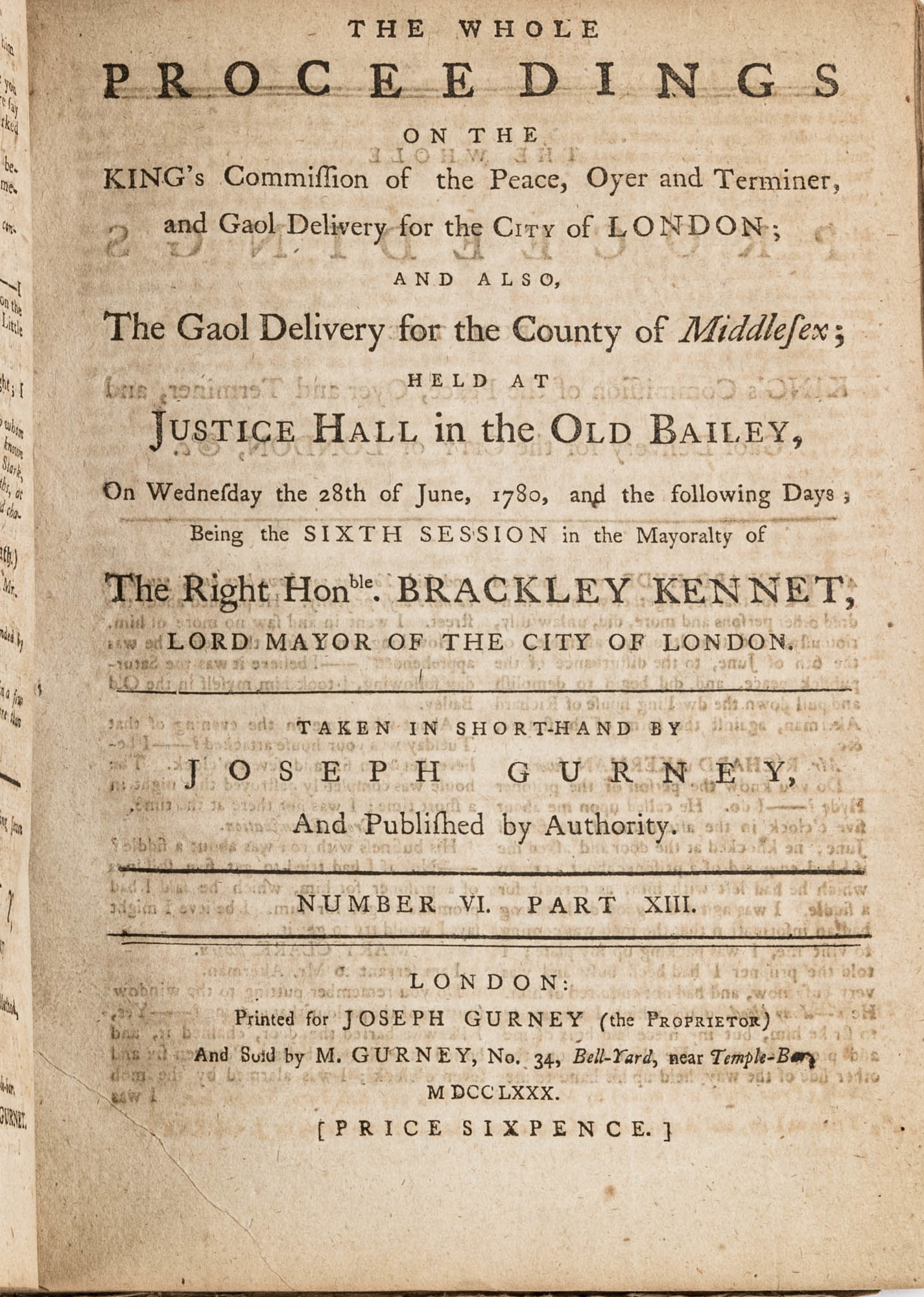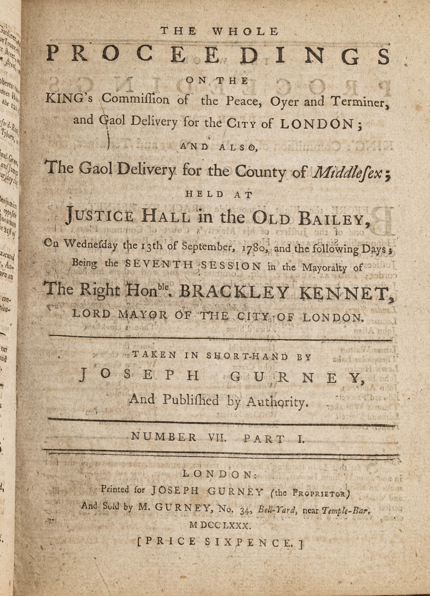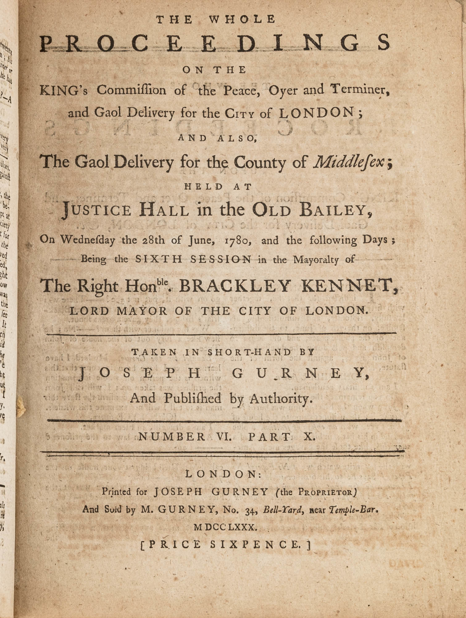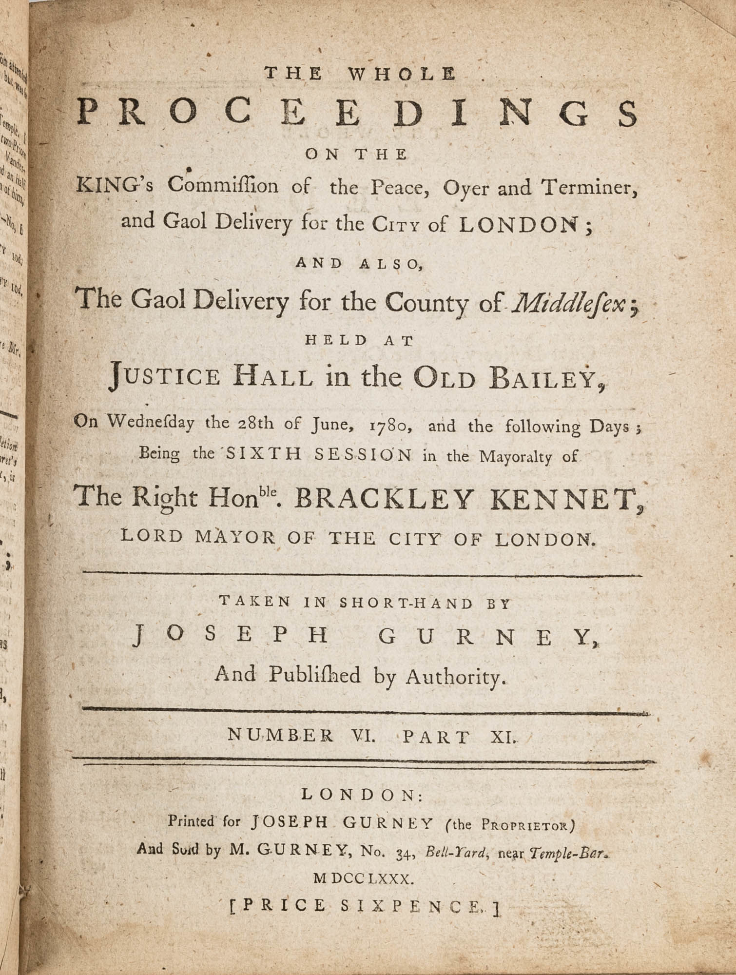 1779. A Year in the Life of the Old Bailey [Trials]. [Great Britain]. Gurney, Joseph [1744-1815], Reporter. The Whole Proceedings on the King's Commission of the Peace, Oyer and Terminer, Gaol Delivery for the City of London; And Also, The Gaol Delivery for the County of Middlesex; Held at Justice Hall in the Old Bailey.... London: Printed for Joseph Gurney (the Proprietor) And Sold by M. Gurney, 1779-1780. 796, [4] pp. 8 numbers, No. I in 2 parts, No. VI in 12 parts, all others in 3 parts. Each part with separate special title page and continuous pagination. Final part with index. Quarto (9" x 6-3/4"). Near-contemporary three-quarter sheep over paper-covered boards, blind fillets to sheep edges, gilt title and blind fillets to spine. Worn, paper of boards creased and partially abraded in places, front board separating, rear joint starting, wear to board edges, corners bumped, lower outside corner of rear board worn away, hinges cracked, free endpapers lacking, later bookseller description tipped onto front pastedown, faint later pencil doodles to rear pastedown. Moderate toning to interior, occasional light foxing and faint dampstaining, creasing and light edgewear to first and final few leaves, a few cracks to text block, a few leaves loosening slightly but secure, leaf 9H1 (pp. 765-766) misbound after 9H2 (pp. 767-768), text complete, trimming (or printing errors?) to a few leaves with loss to page numbers but not main text. $1,500. * Published in parts and later bound together, these reports of trials held at the "Court of Oyer and Terminer and Gaol Delivery for London and Middlesex," better known as Old Bailey, cover sessions held from December 8, 1779 to October 18, 1780. The trials deal with matters such as theft, assault, forgery and murder; the high number of capital cases and punishments reflects the punitive nature of British justice in the eighteenth century. Other convicts were sentenced to imprisonment, whipping and "navigation," which in practice meant hard labor or imprisonment during the suspension of transportation from 1776-1787 after the American Revolution. Complete volumes such as ours are scarce. OCLC locates 4 in North America for the years 1779-1780, 2 in law libraries (Yale, Library of Congress, which has an imperfect copy). English Short-Title Catalogue T073786.