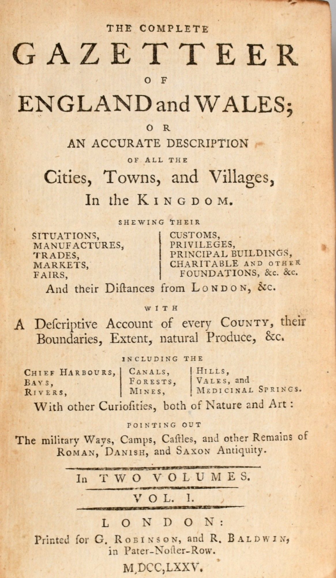 London: G. Robinson and R. Baldwin, 1775. First Edition. Full Leather. Very Good binding. Two 12mo. volumes in speckled calf with raised bands and crimson morocco labels; cracked at the gutters but boards are holding well; each volume with a contemporary signature "Lucy Herring" on the front endpapers; each volume with title leaf; there is minor loss to the extremities of the spines.~~This Gazetteer in two volumes touts itself as containing an accurate description of all the cities, towns and villages in the kingdom "shewing their situations, manufactures, trades, markets, fairs, customs, privileges, principal buildings, charitable and other foundations, and their distances from London, &c. with a descriptive account of every county, their boundaries, extent, natural produce, &c. ... with other curiosities both of nature & or art: Pointing out the military ways, camps, castles, and other remains of Roman, Danish, and Saxon Antiquity. Very Good binding.