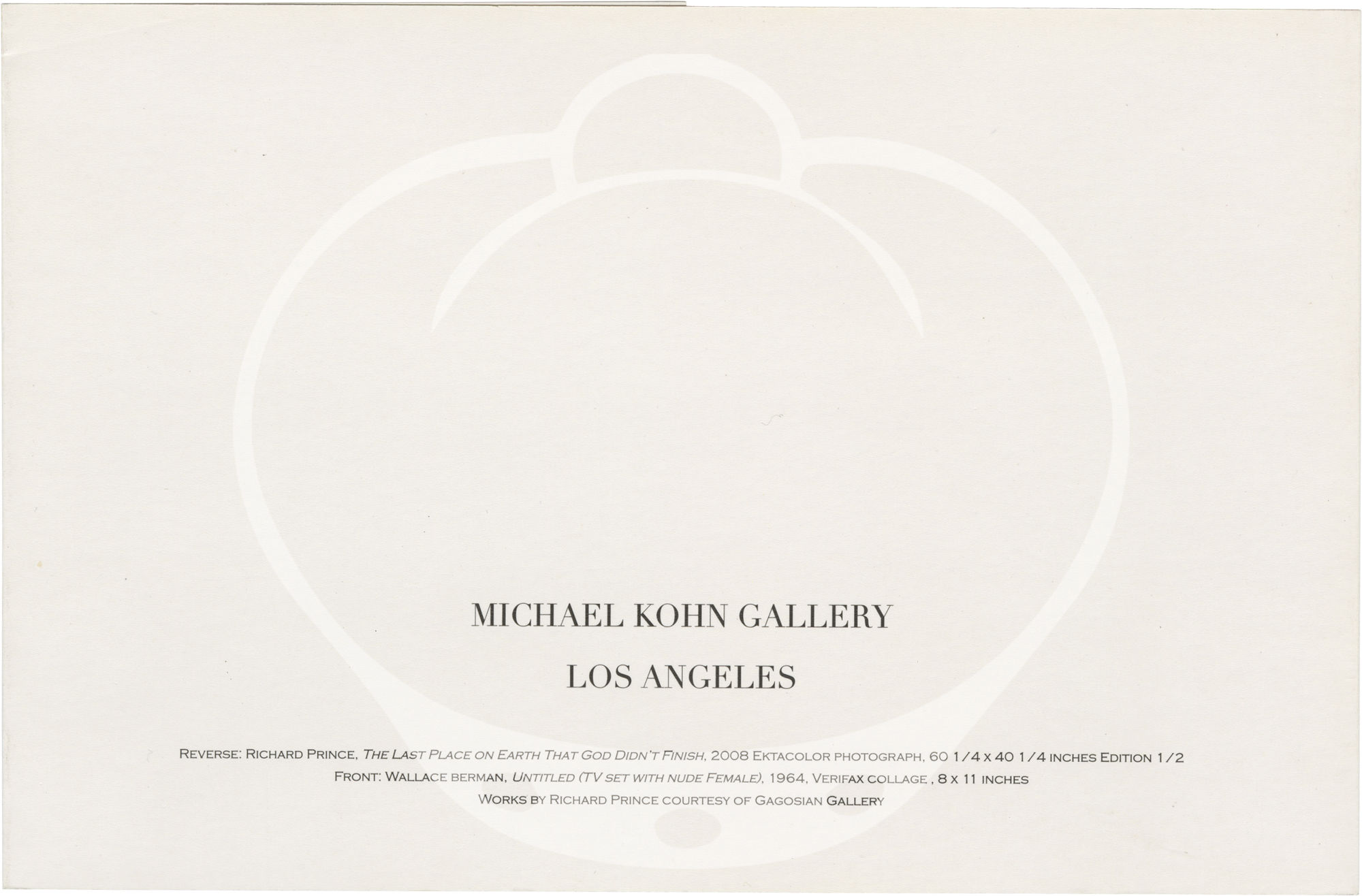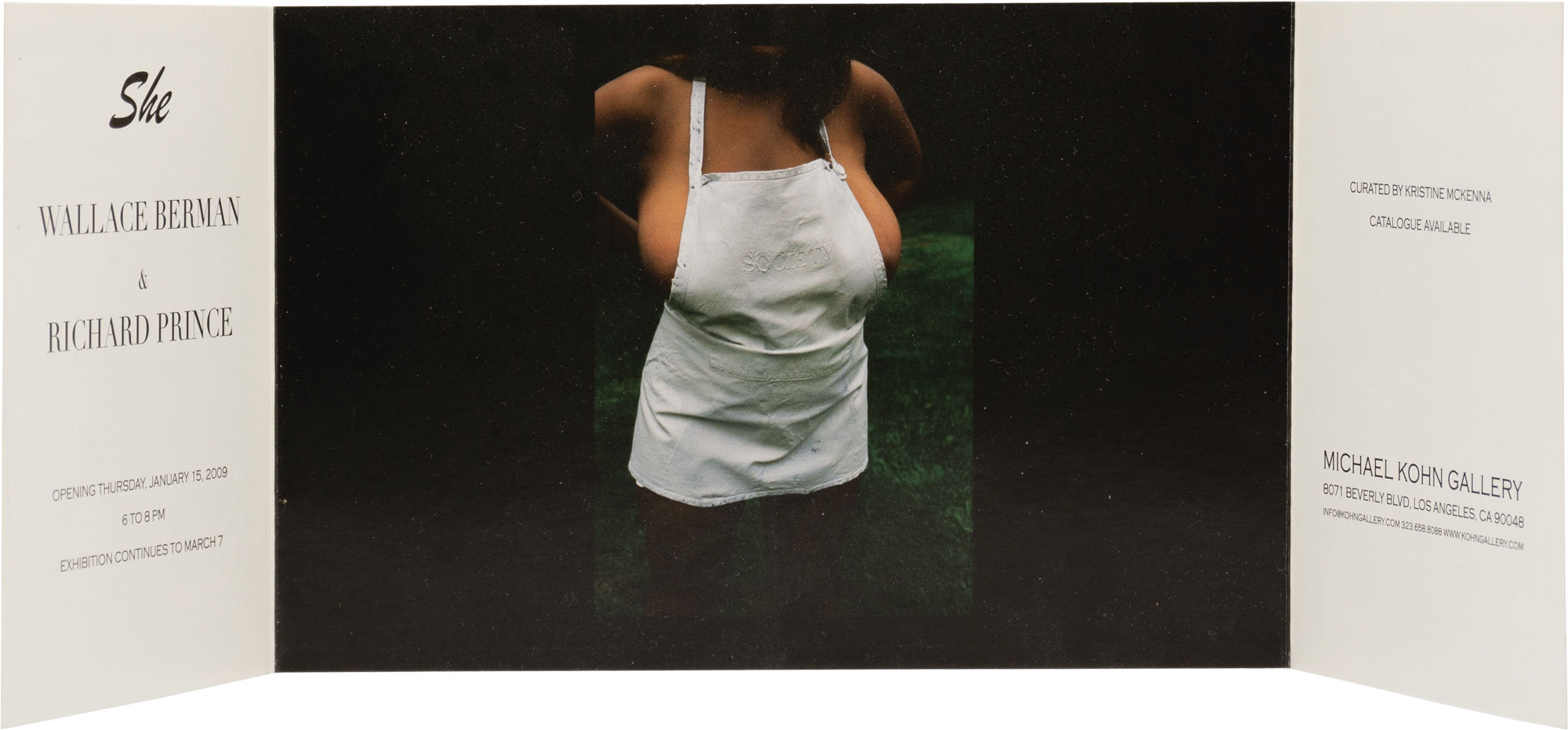 Los Angeles: Michael Kohn Gallery, 2009. Vintage gatefold flyer for the 2009 exhibition, featuring posthumous work by Wallace Berman alongside contemporary work by Richard Prince. Conceived by writer and curator Kristine McKenna, and held at the Michael Kohn Gallery in in Los Angeles, January 15 through March 7, 2009.