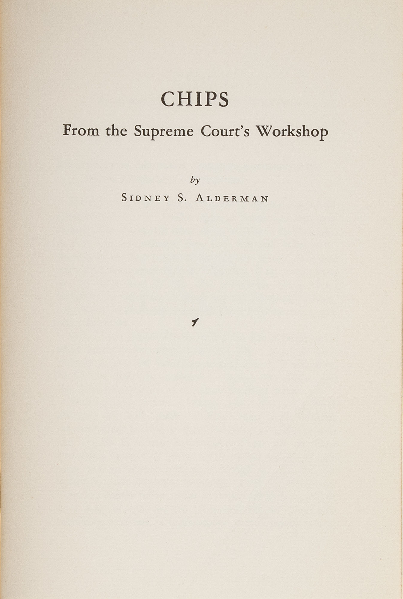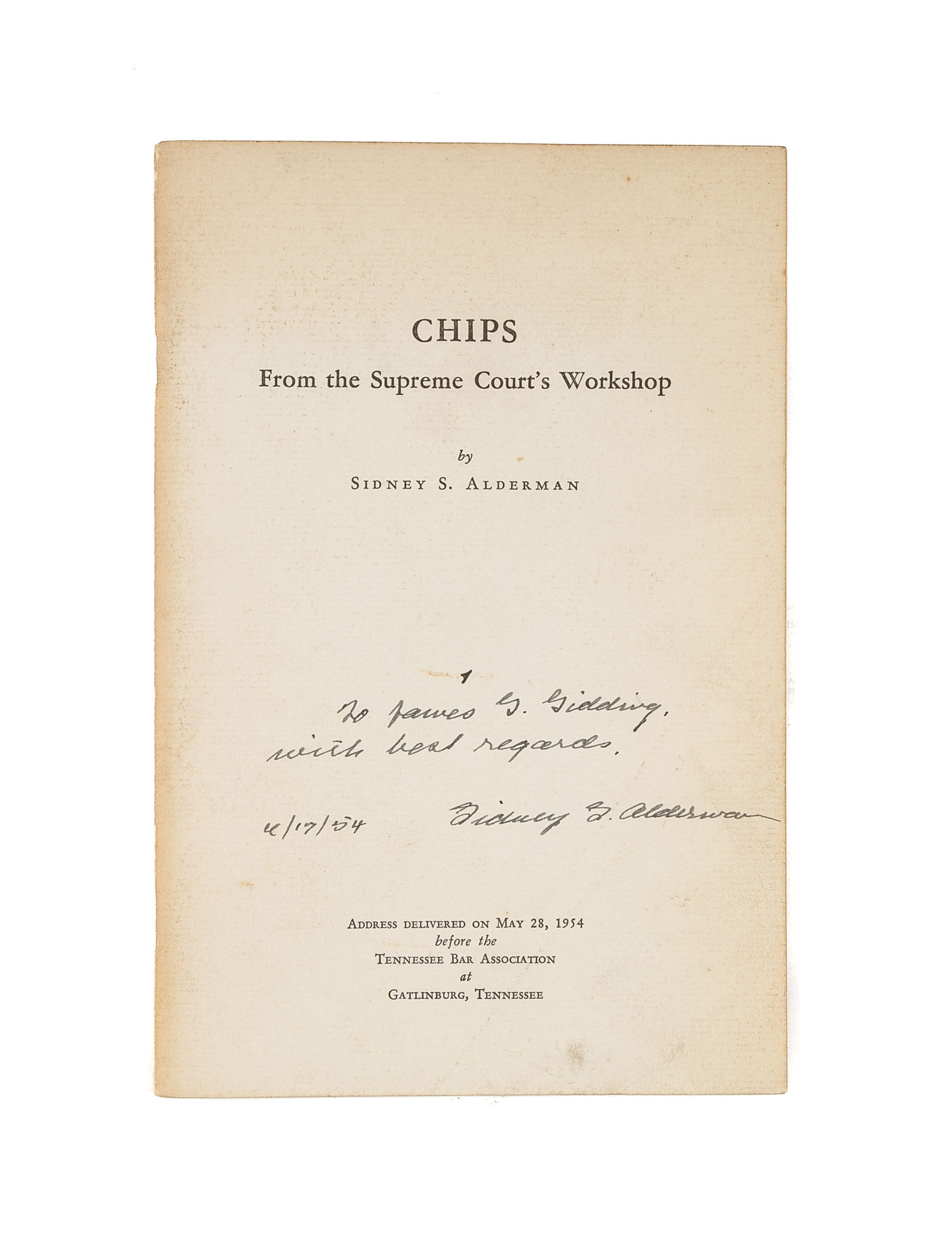 1954. Inscribed from a Nuremberg Prosecutor to a World War II Veteran Alderman, Sidney S. [1892-1973]. Chips From the Supreme Court's Workshop. [S.l., s.n., 1954?]. 30 pp. Stapled pamphlet in stiff printed wrappers. Light toning and soiling to exterior, faint marks to verso of title page, internally clean, presentation inscription "To James G. Gidding, with best regards, Sidney S. Alderman" dated 4/17/54 to front wrapper. $150. * Alderman, a North Carolina lawyer and veteran of World War I, served as Associate Trial Counsel for the United States during the Nuremberg Trials. In this address delivered on May 28, 1954 before the Tennessee Bar Association, he reviews and criticizes favorite quotations from the opinions of U.S. Supreme Court justices, including Holmes, Stone, Frankfurter and Robert H. Jackson, a fellow Nuremberg prosecutor. This copy is inscribed to James G. Gidding, a World War II veteran who worked for Southern Railway System at the same time as Alderman. This pamphlet appears to be unrecorded. No copies located on OCLC.